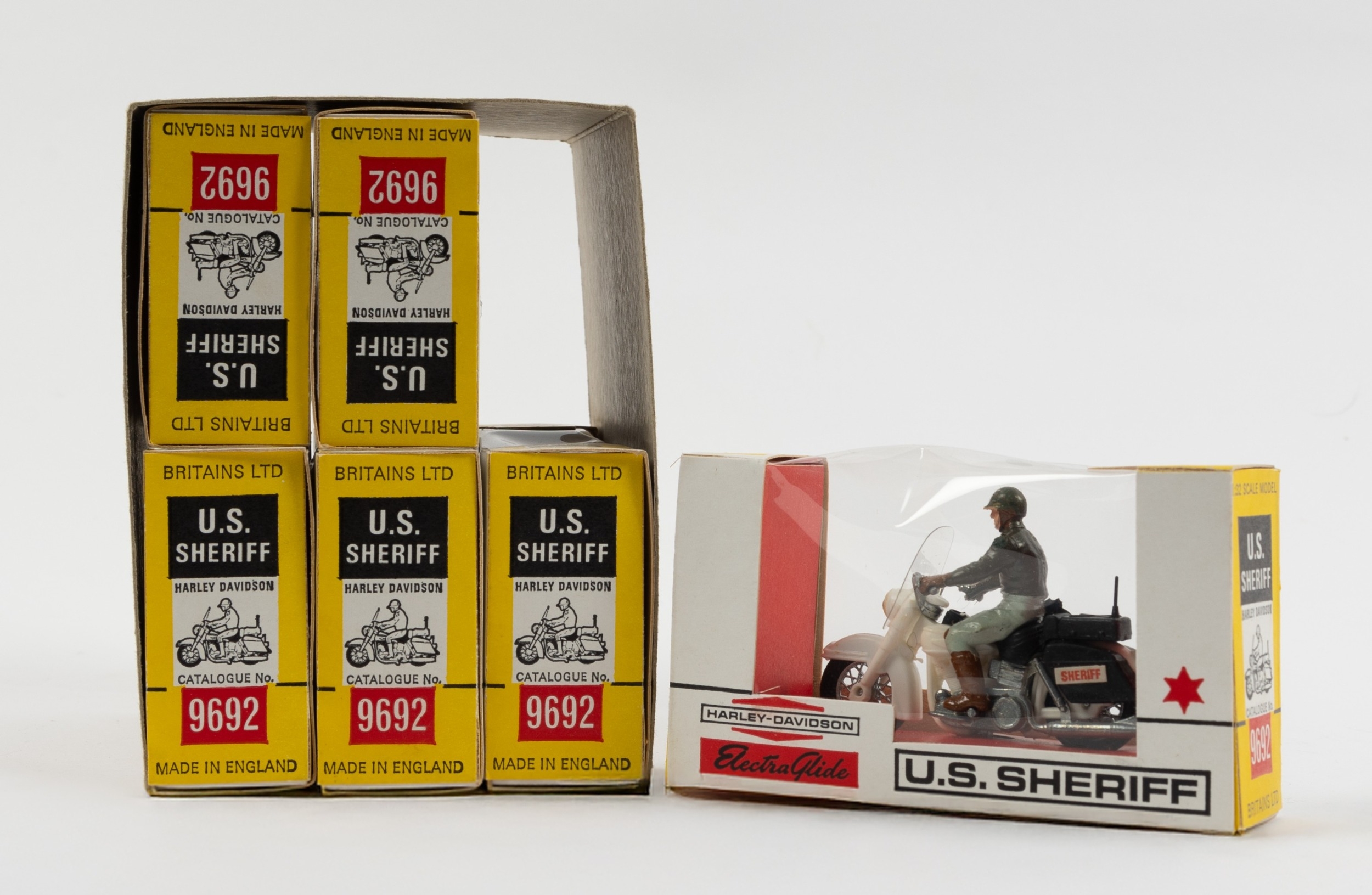 6 Britains ltd No.9692 U.S. Sheriff Harley Davidson motorcycles, 1:32 scale. All are boxed and look unused contained in the original card shipping sleeve. From the 1970s. VGC-Mint. £60-80