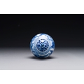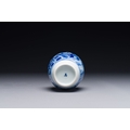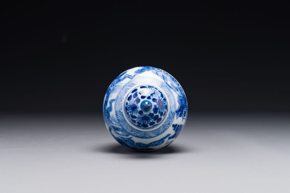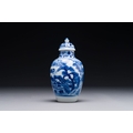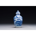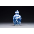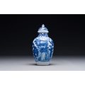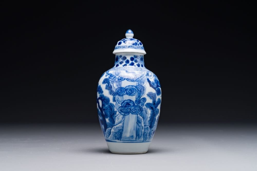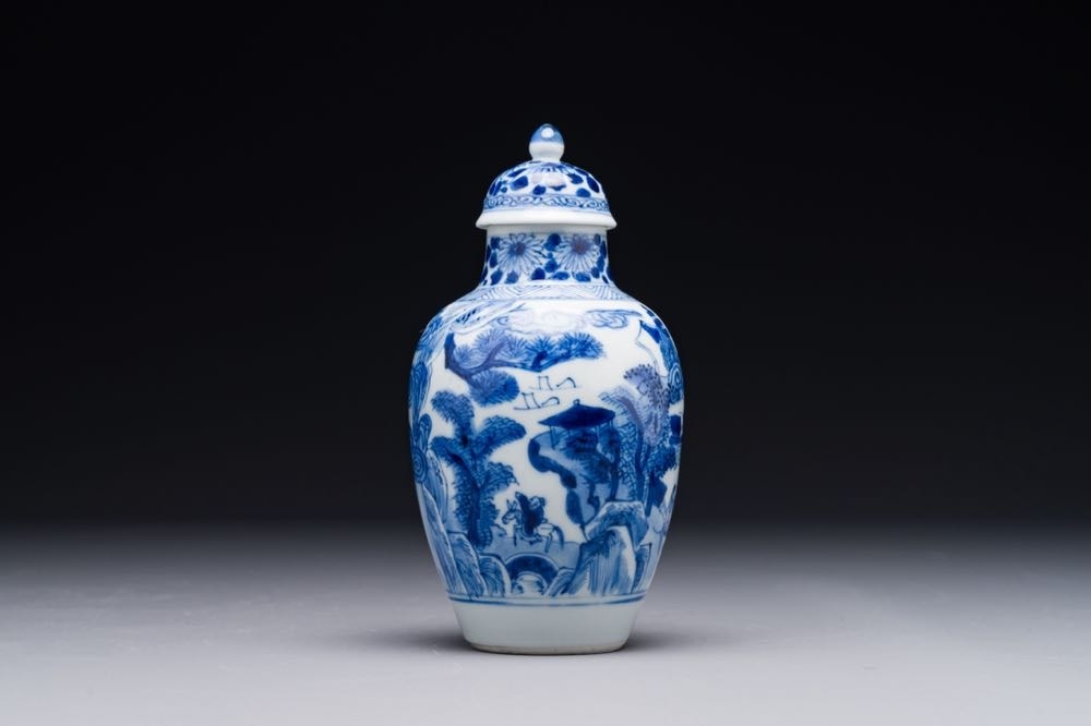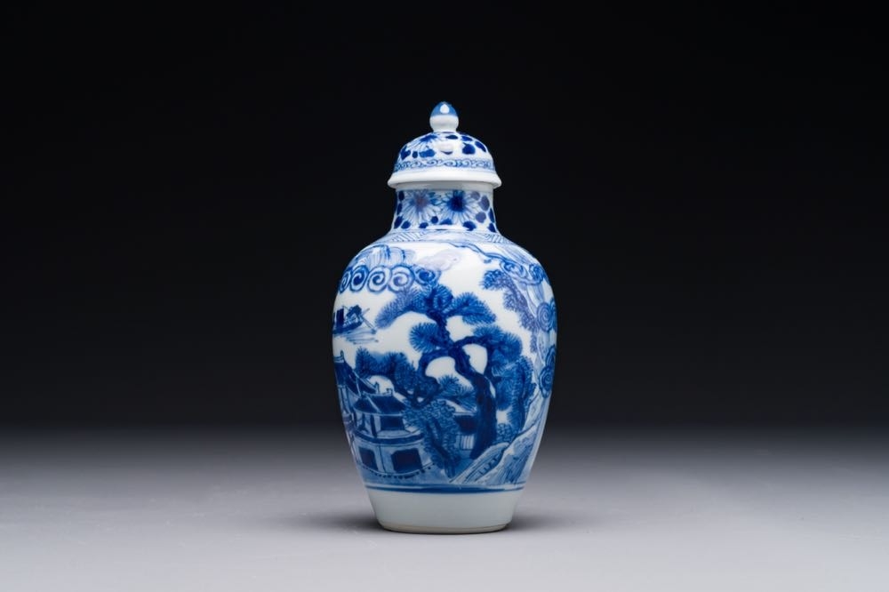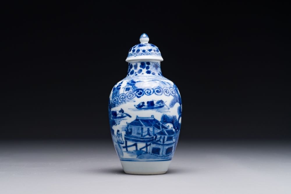 A Chinese blue and white covered vase with fishermen in a river landscape, jade mark, Kangxi