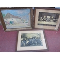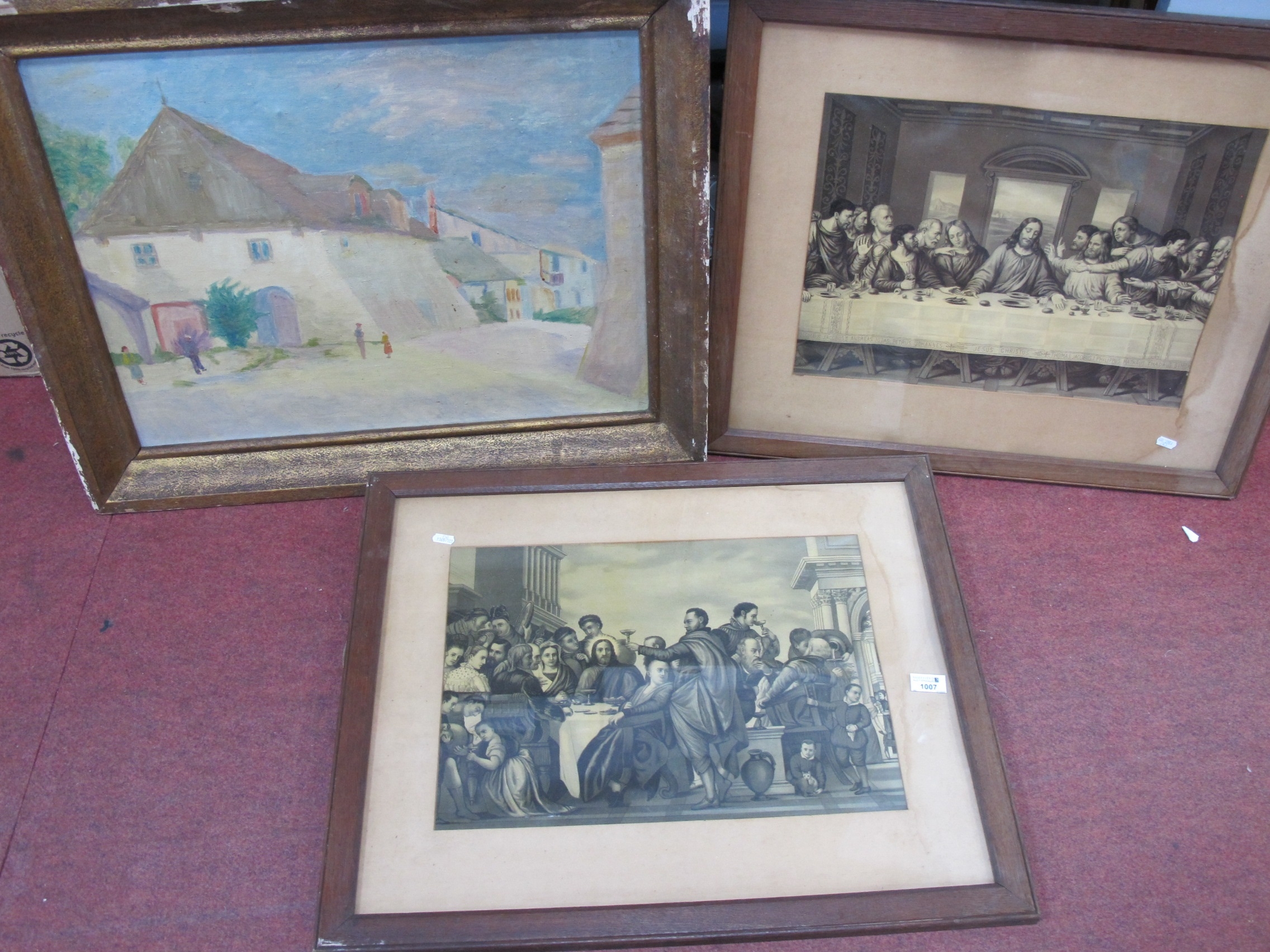 1958, Buildings with Figures in foregound, oil on canvas, details verso, 47 x 63cm, pair of sepia oileographs featuring The Last Supper (33