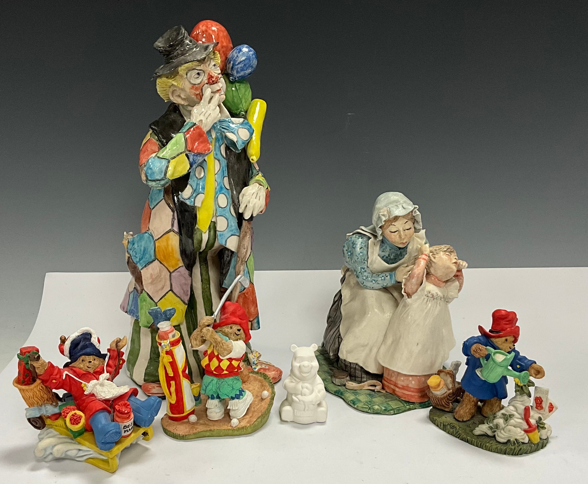 A studio pottery clown figure, by Brenda Garner , Clowning Around, 28cm, signed, original purchase receipt; another, Ouch You're Hurting, signed; three Royal Doulton resin Paddington Bear models; a miniature Winne-the-Pooh (6)
