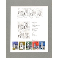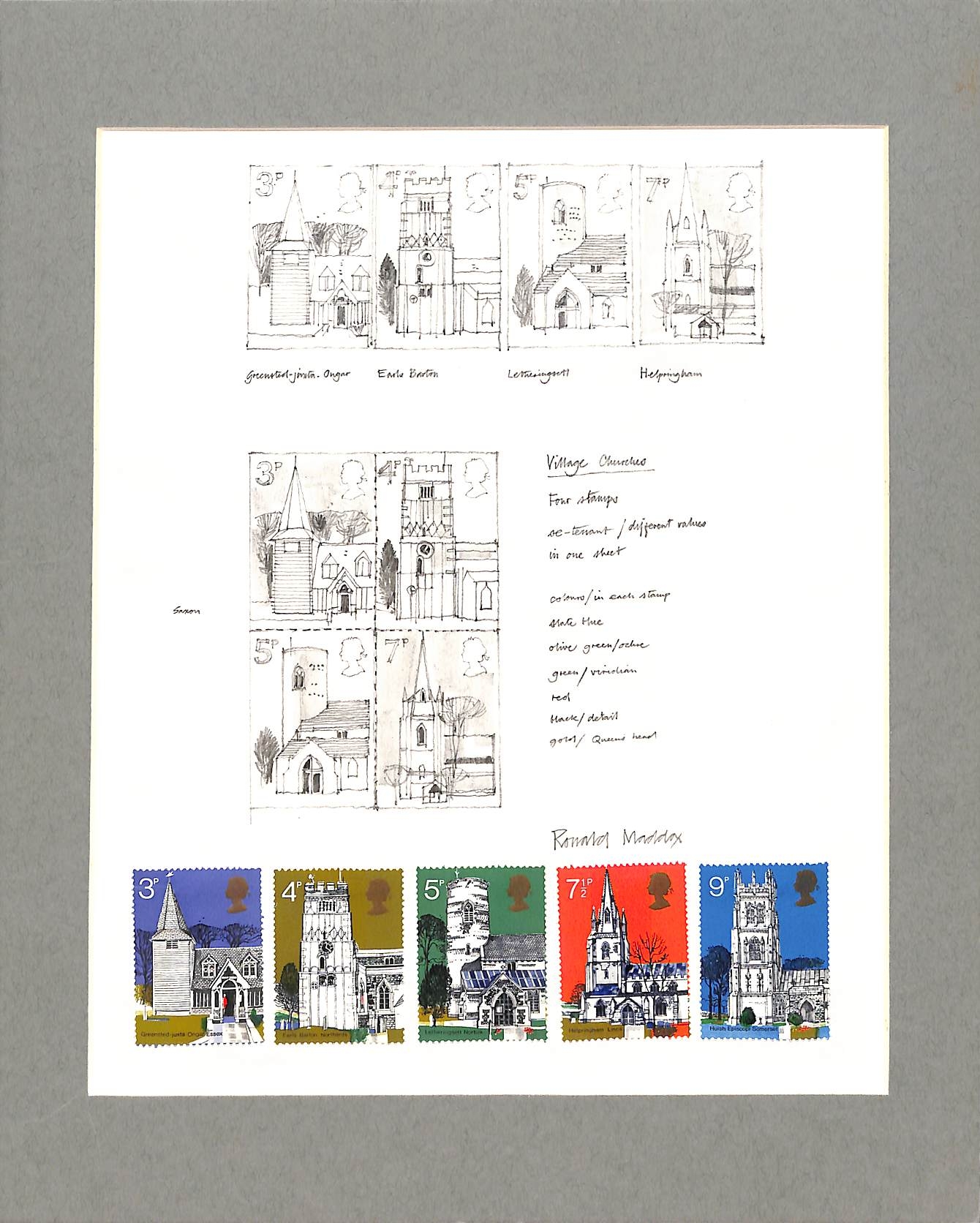 1972 British Architecture, page with stamp size pencil drawings by the designer Ronald Maddox, four designs very similar to those of the issued 3p, 4p, 5p and 7½p stamps, the same designs below in se-tenant format, notes on colours and church names alongside, the five issued stamps hinged below. An attractive and unique page, mounted with card surround, 22x28cm.