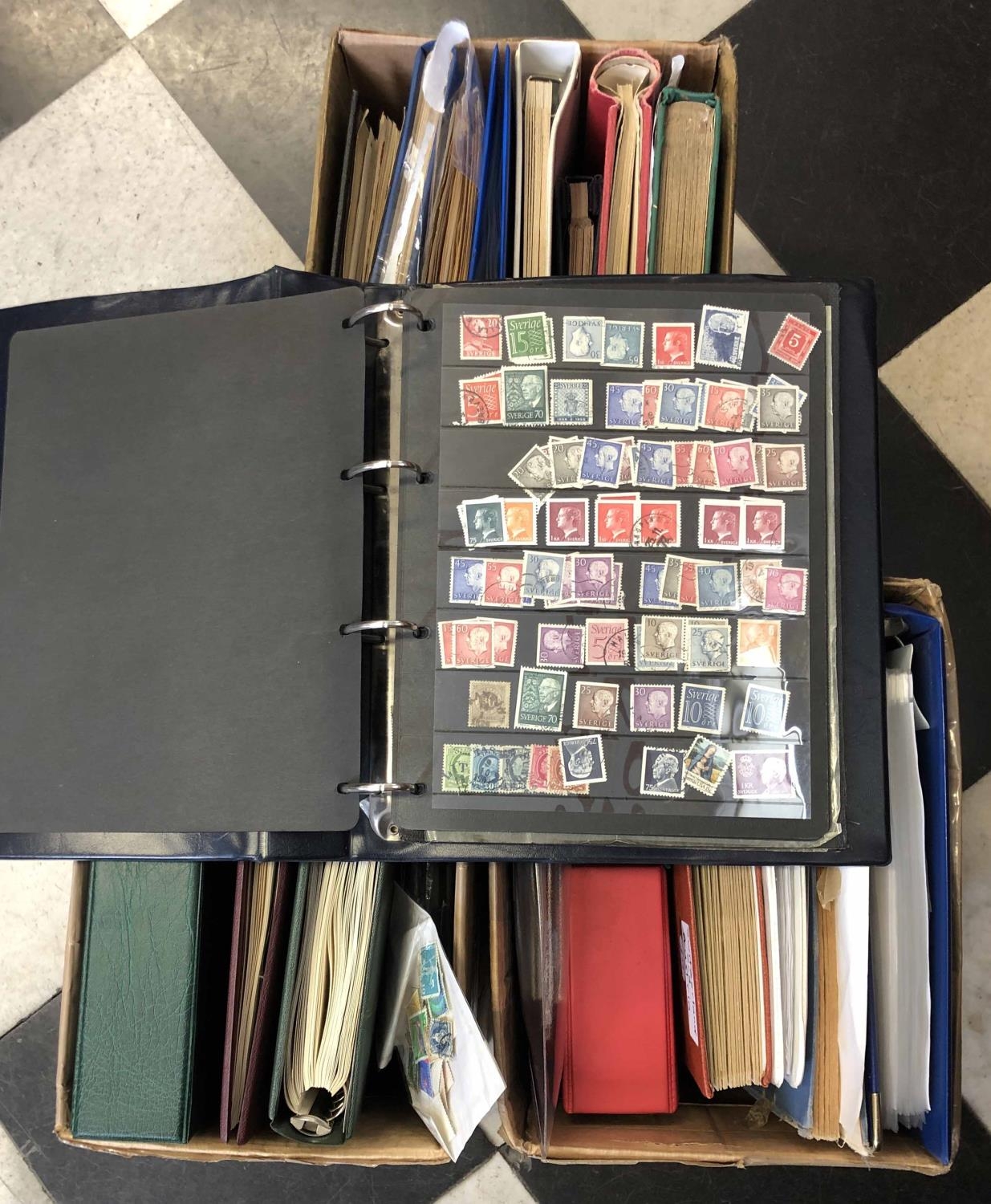 SWITZERLAND & AUSTRIA; Three cartons containing an accumulation of mint & used stamps of Austria & Switzerland. Inc. a 'SAFE' printed album for mostly mint issues 1950-80, + a 'Lighthouse' hingeless printed album for issues 1912-2000 (sparsely filled). Great value. (Many 1000s) Cross Reference: AUSTRIA, SWITZERLAND