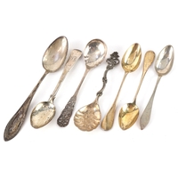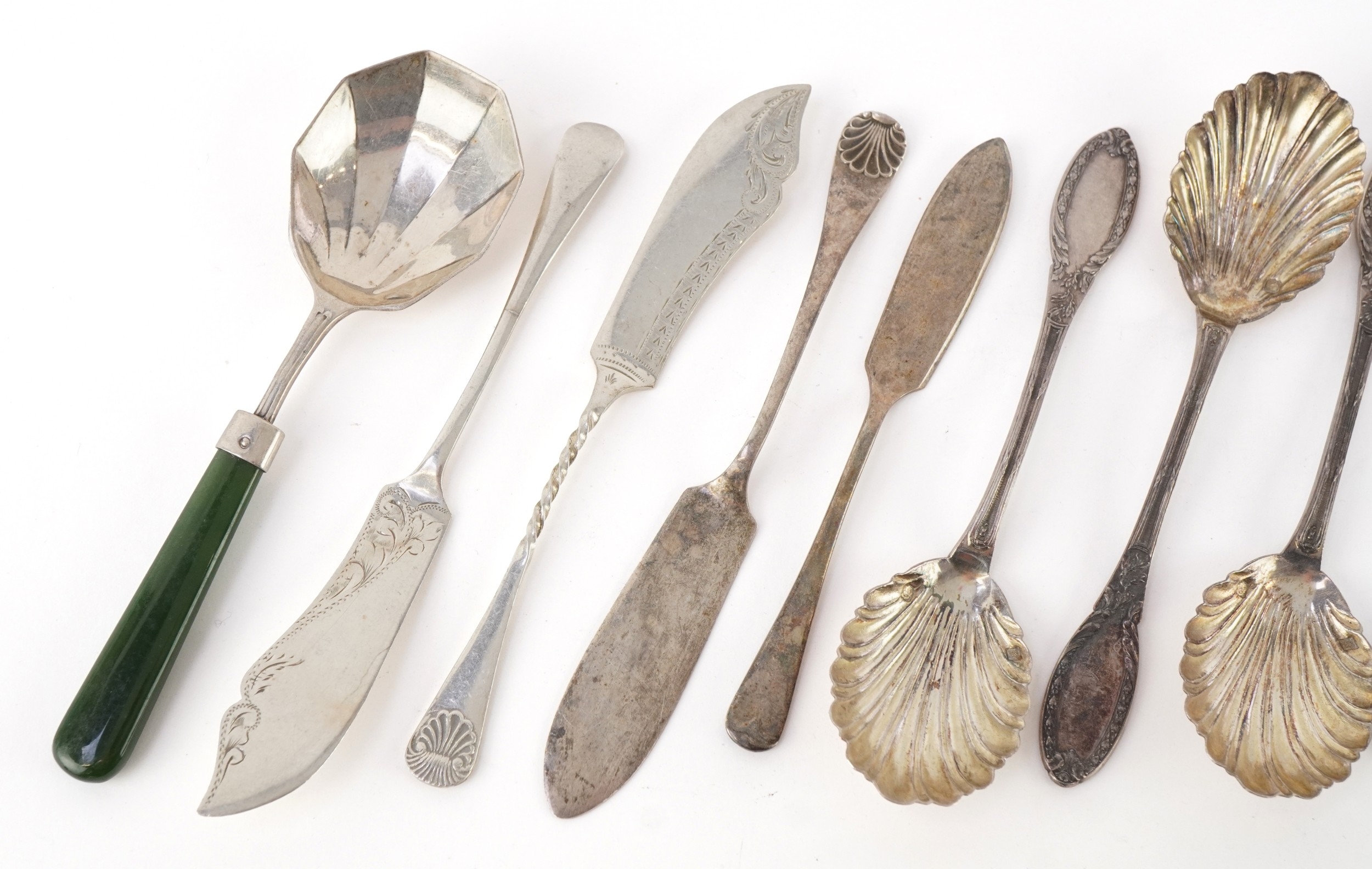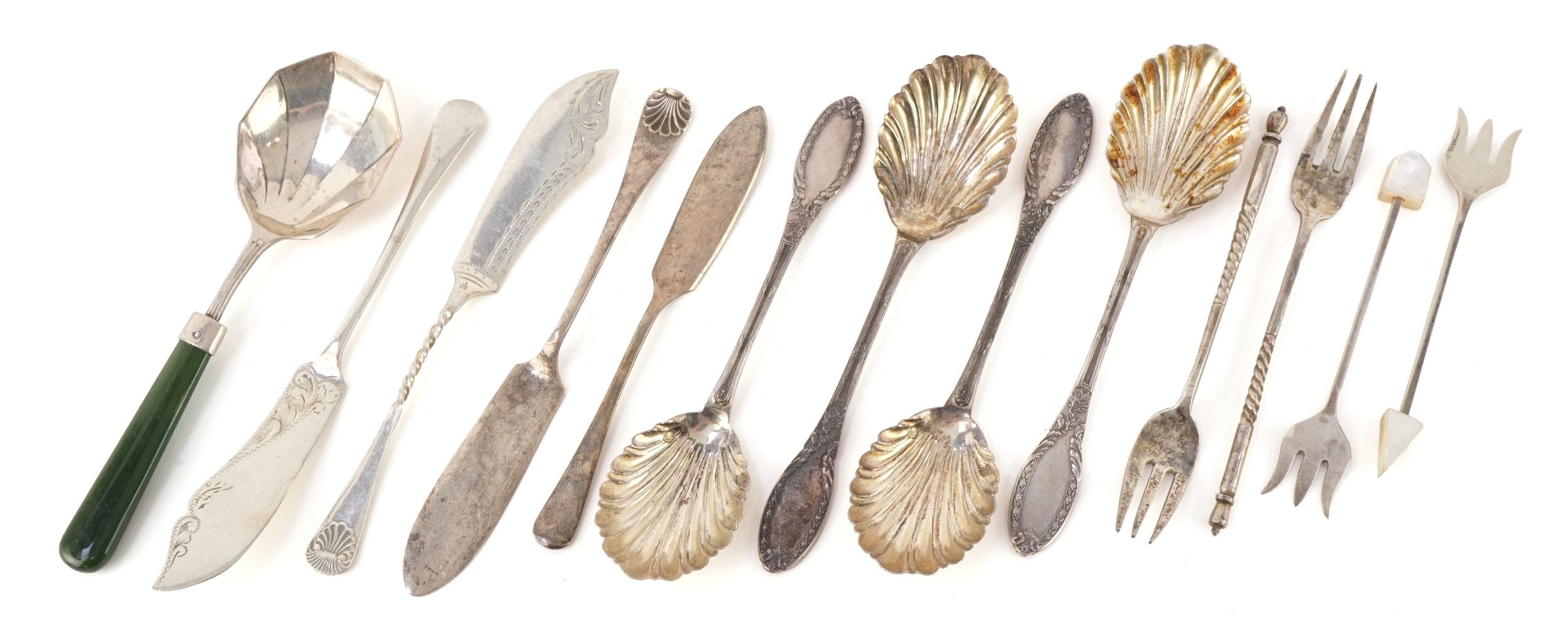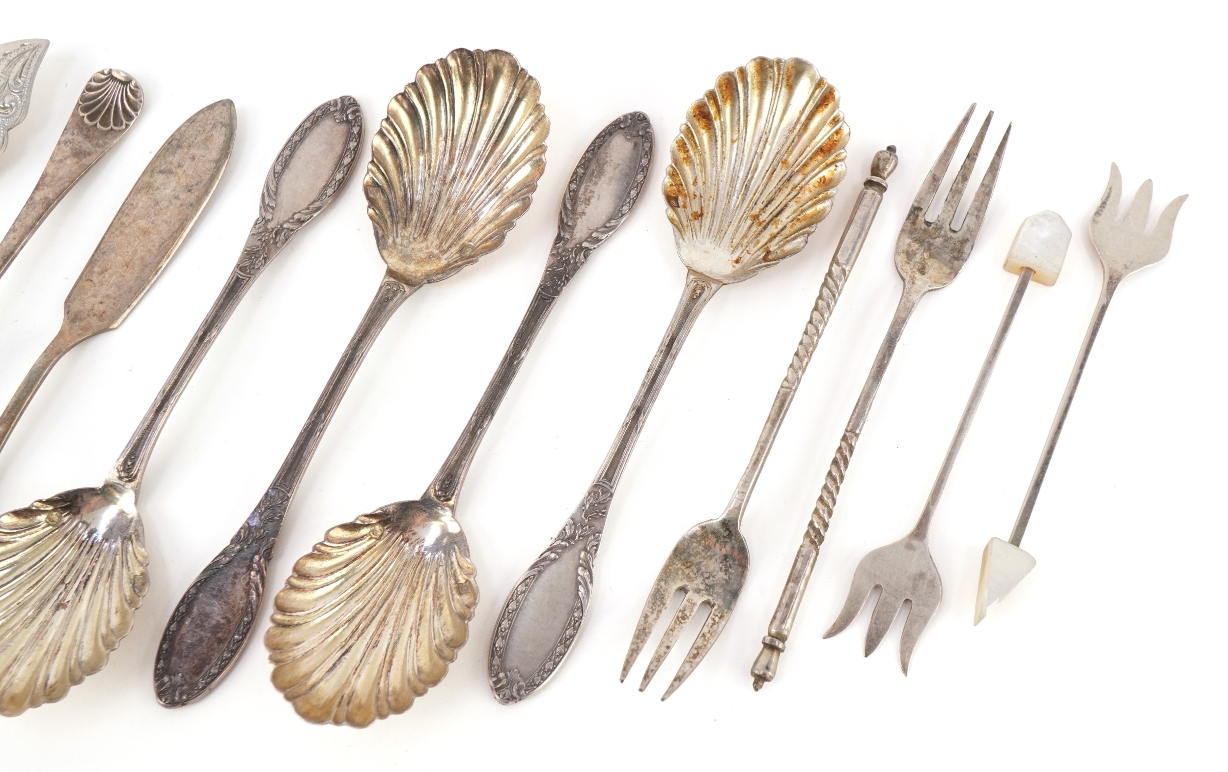 Victorian and later silver comprising cocktail forks with mother of pearl handles, butter knives and caddy spoons, the largest 13cm in length, total 167.2g.
