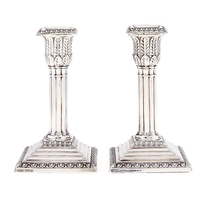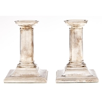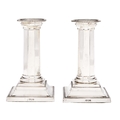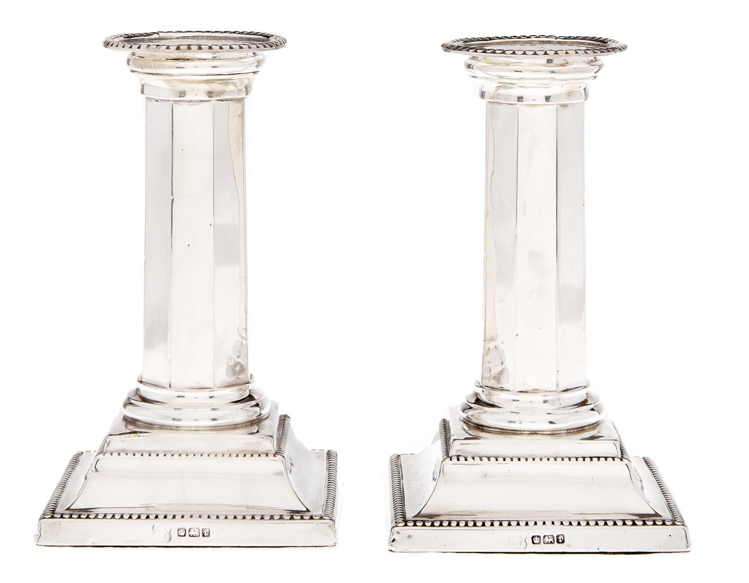 A pair of George V silver dwarf columnar candlesticks, on beaded square foot, nozzles, 13cm h, by George Edward & Sons, Sheffield 1911, loaded