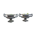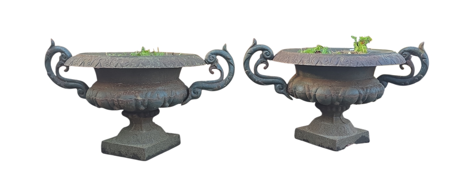 A pair of cast iron twin-handled Campana urns of classical form, each approx 54cms diameter (2).