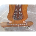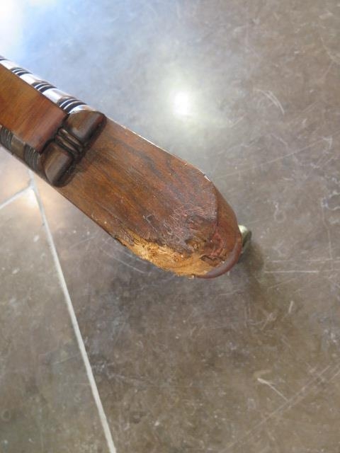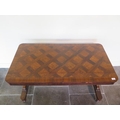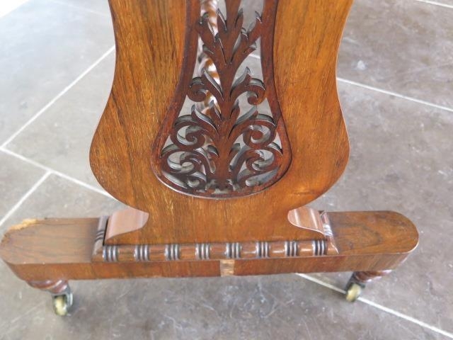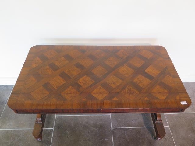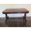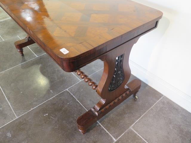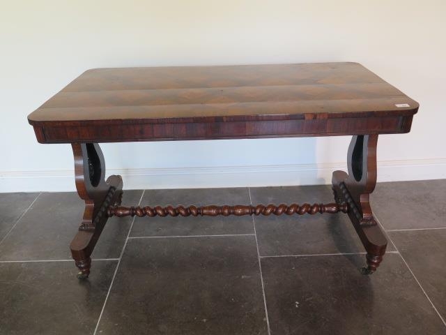 A 19th century rosewood and burr walnut stretcher table on lyre end supports united by a barley twist turned stretcher on brass casters, one support has wear, some cracking to veneer but in polished condition and a good colour