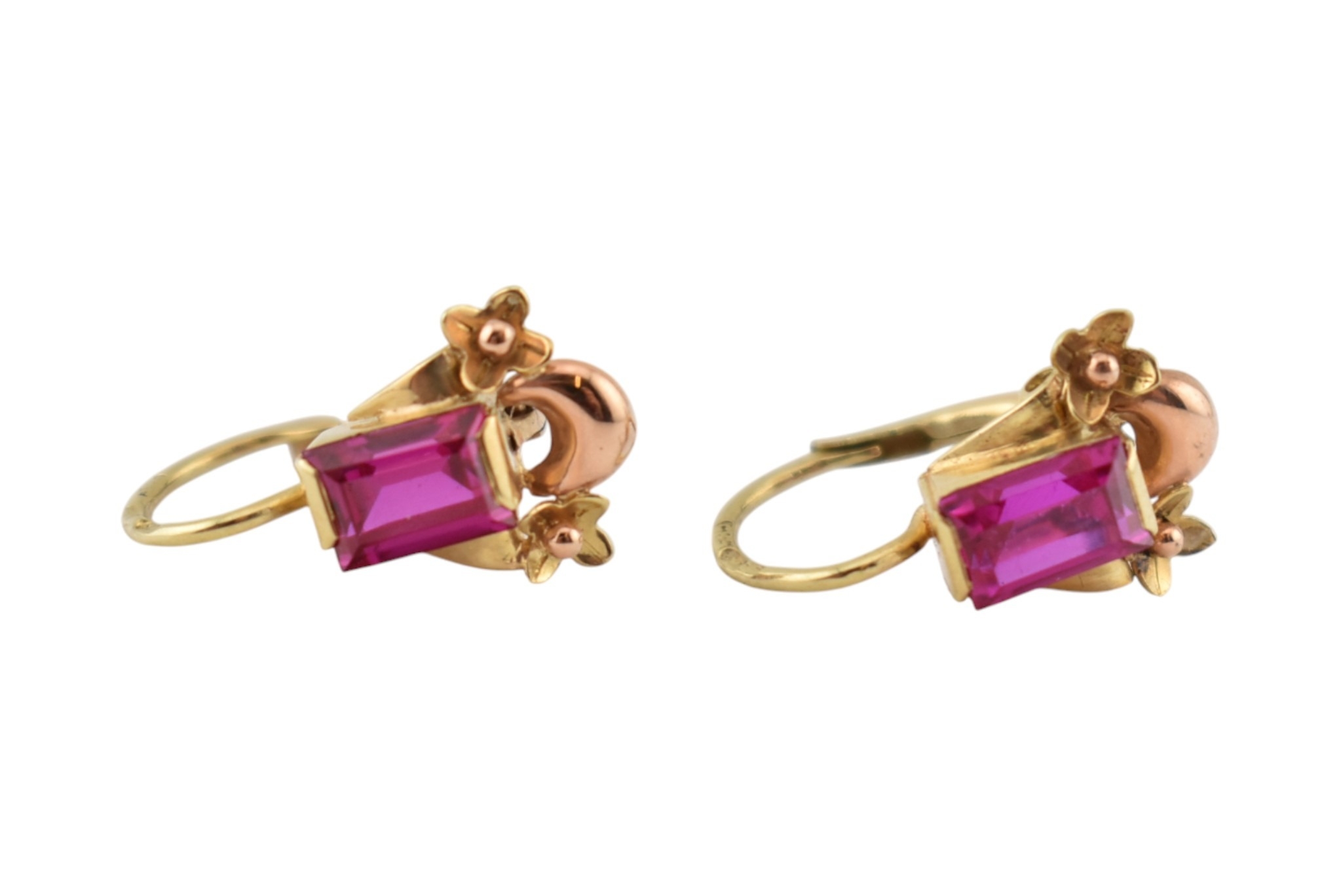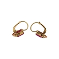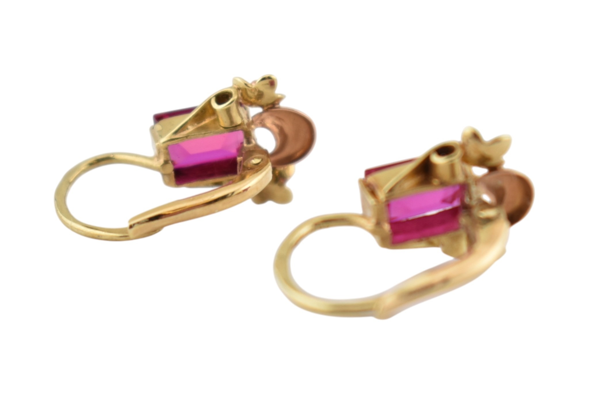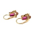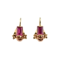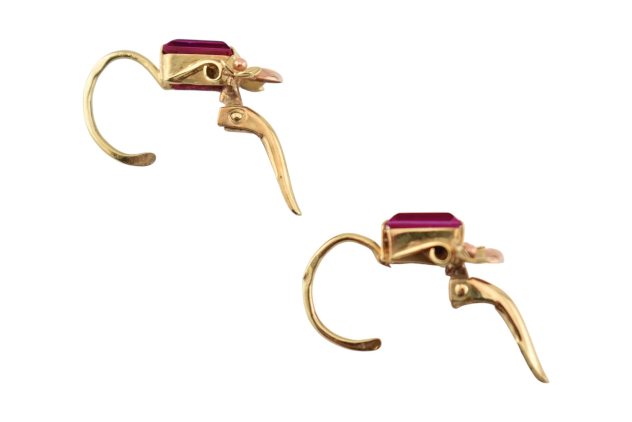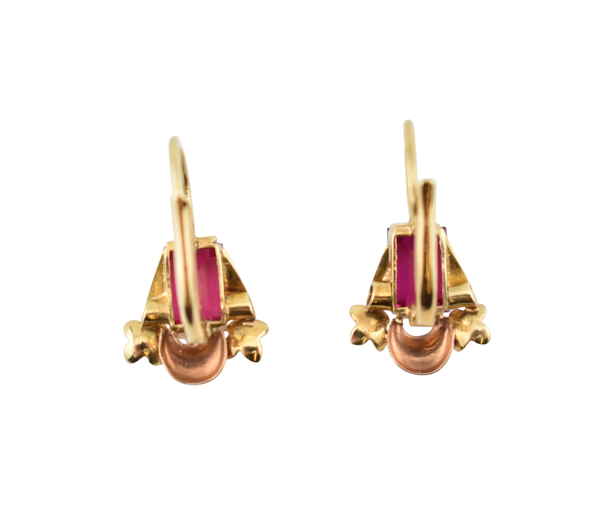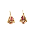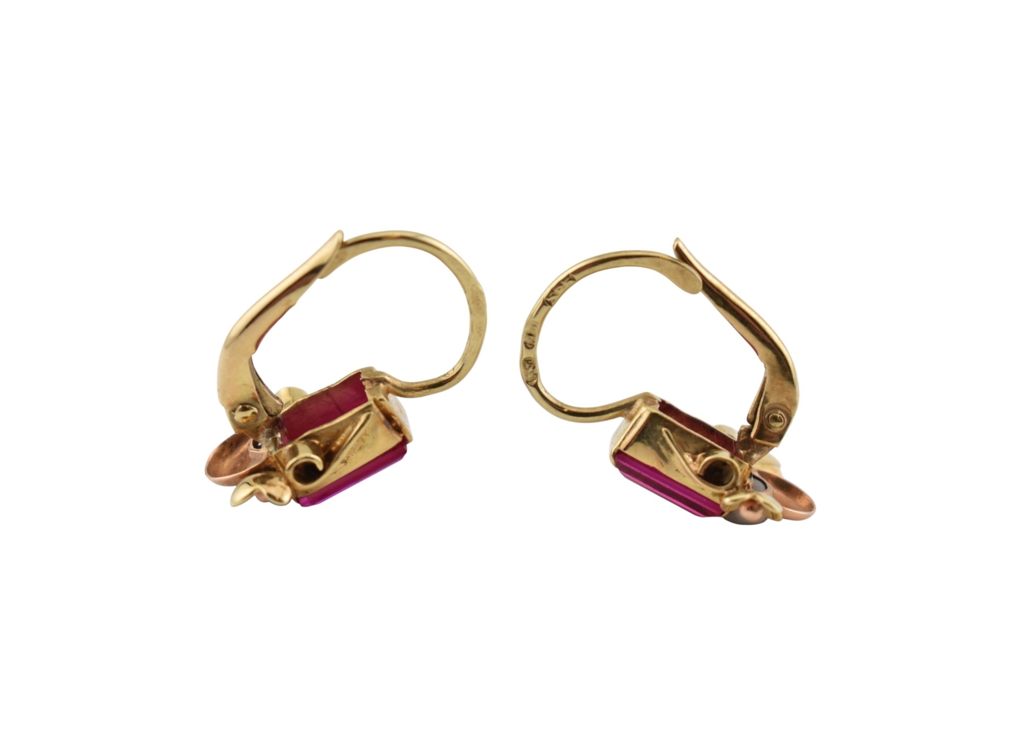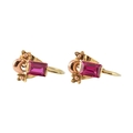 A pair of 14ct gold and synthetic ruby pendant earrings. The earrings set with emerald cut synthetic rubies with flower and crescent motif, to French lever clasp fasteners. Assay mark to clasp. Weight 2.1g. Measures 1.7cm.