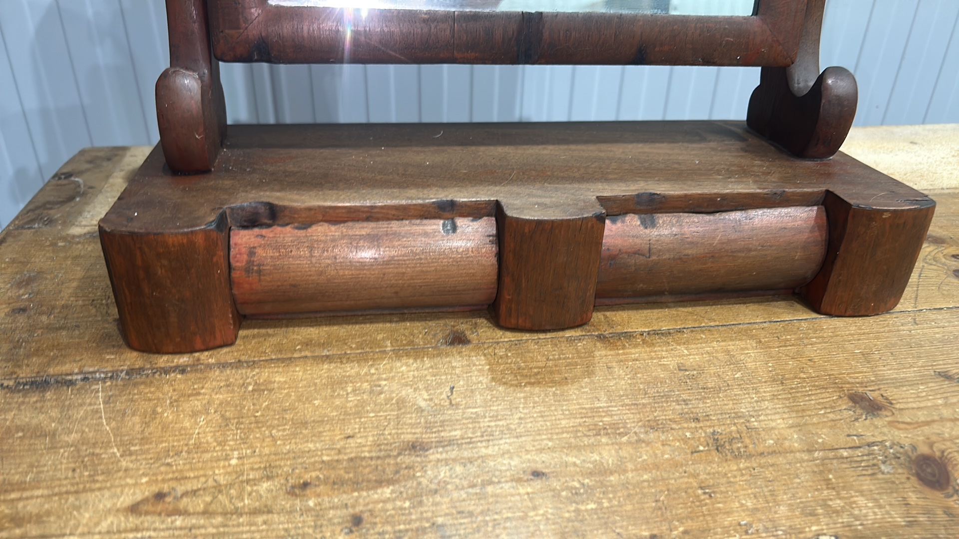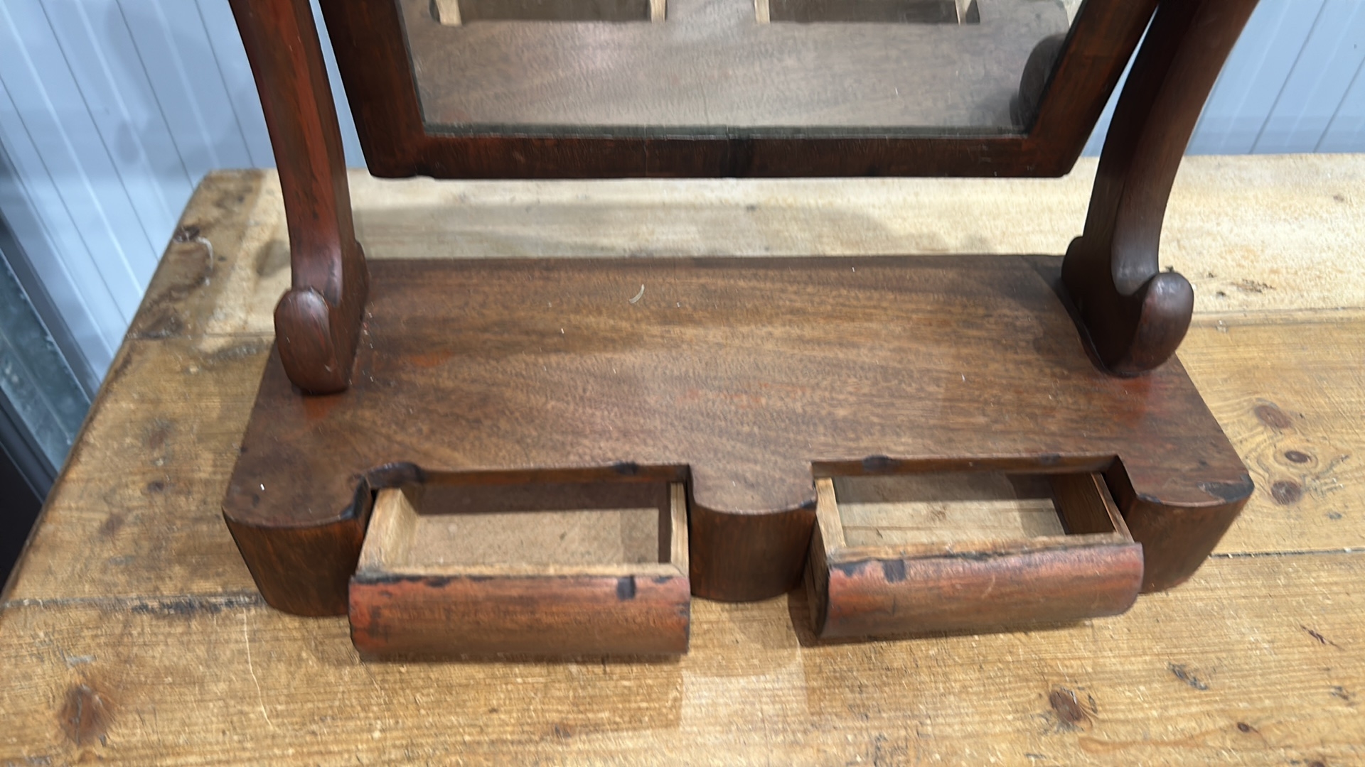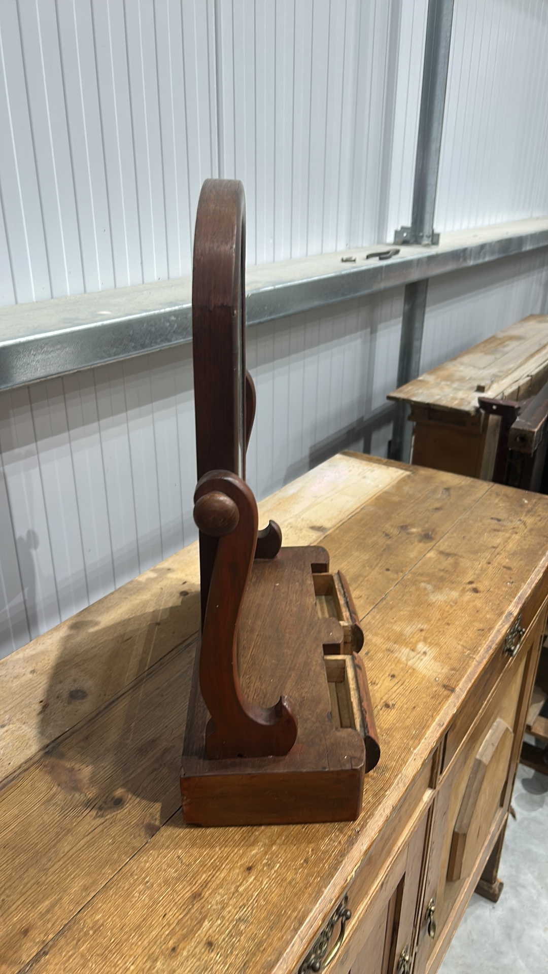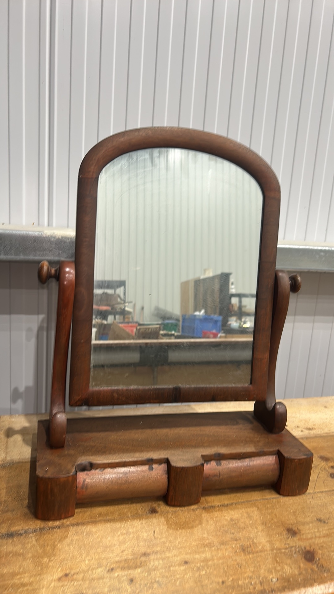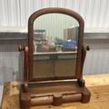 Mahogany swing dressing-table mirror, arched plate within turned supports above a shaped base fitted with twin cylindrical drawers, late 19th century.