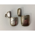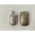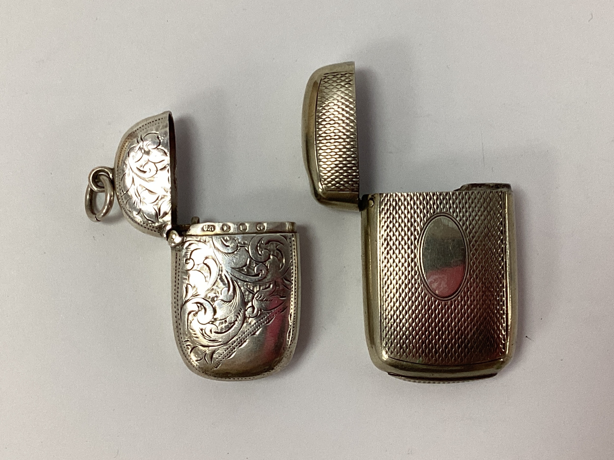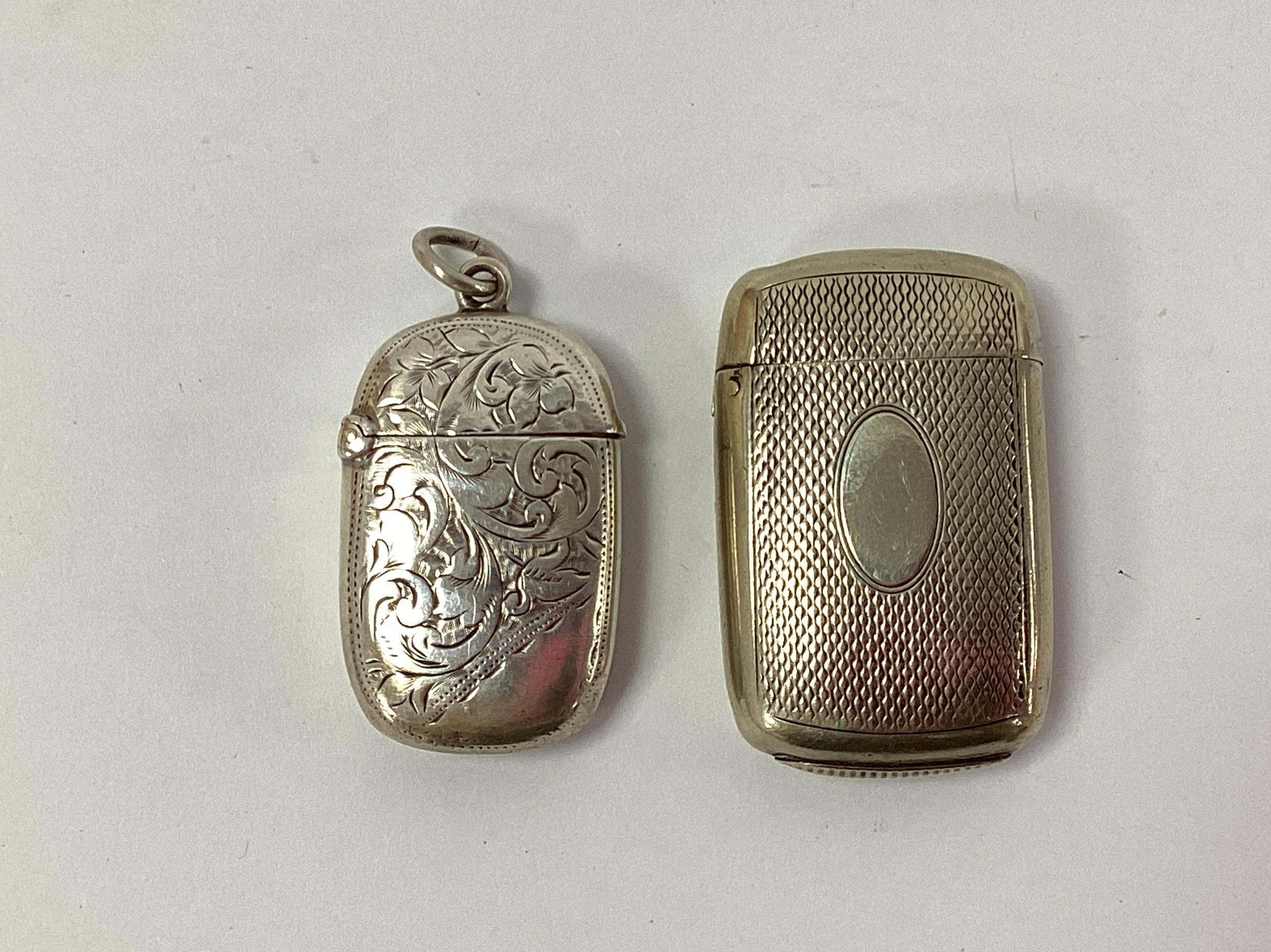 A Hallmarked Silver Vesta Case, with allover foliate style decoration, Birmingham 1886, measuring approximately 4 x 2.5cm (dents); Together with A Larger Vesta Case, of engine turned design with vacant cartouche, stamped "H J & Co", approximately 4.9 x 3cm (dents). (2)