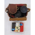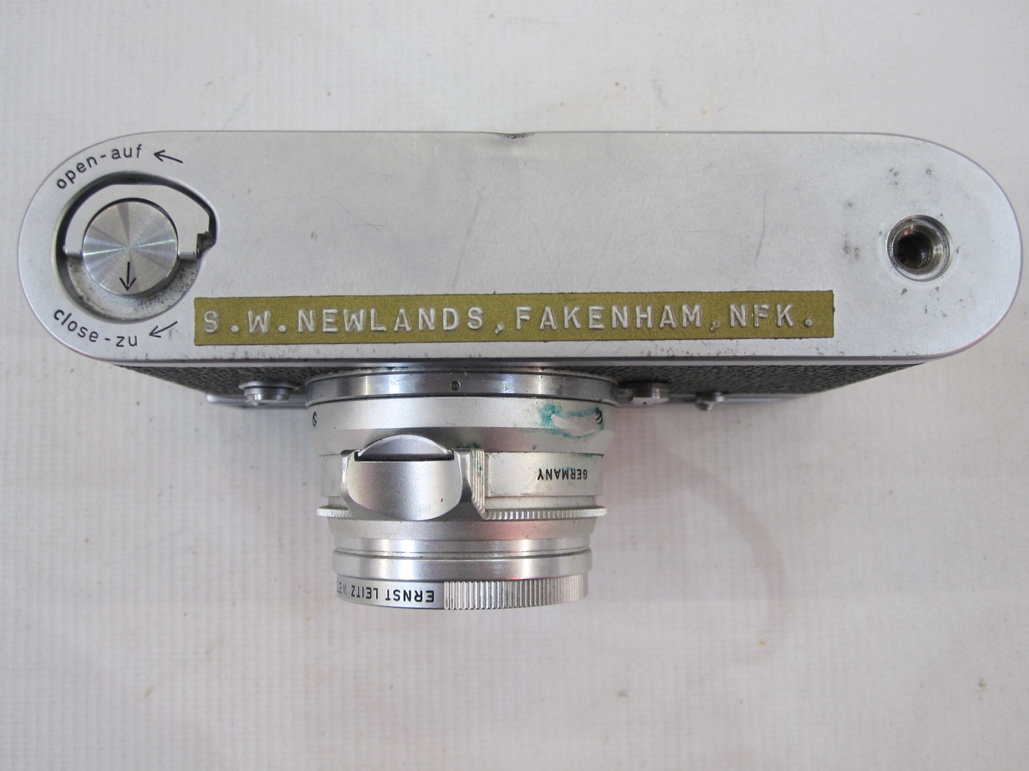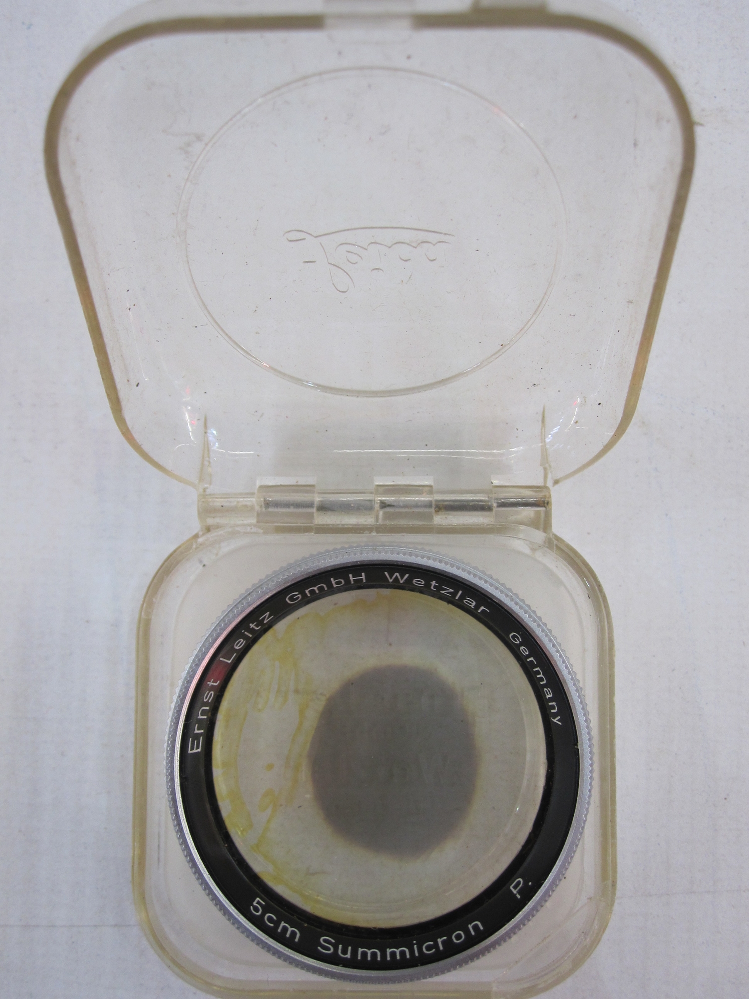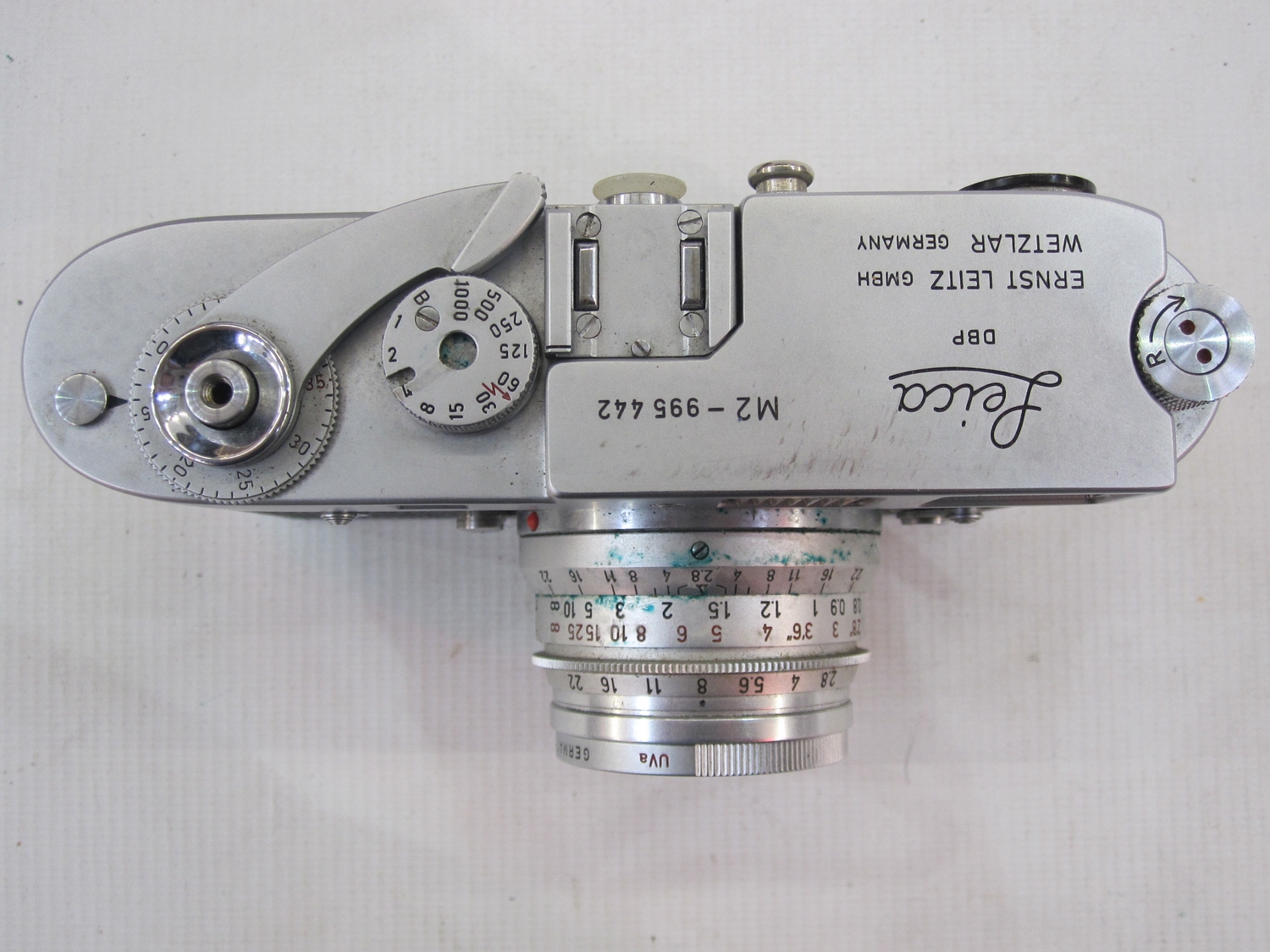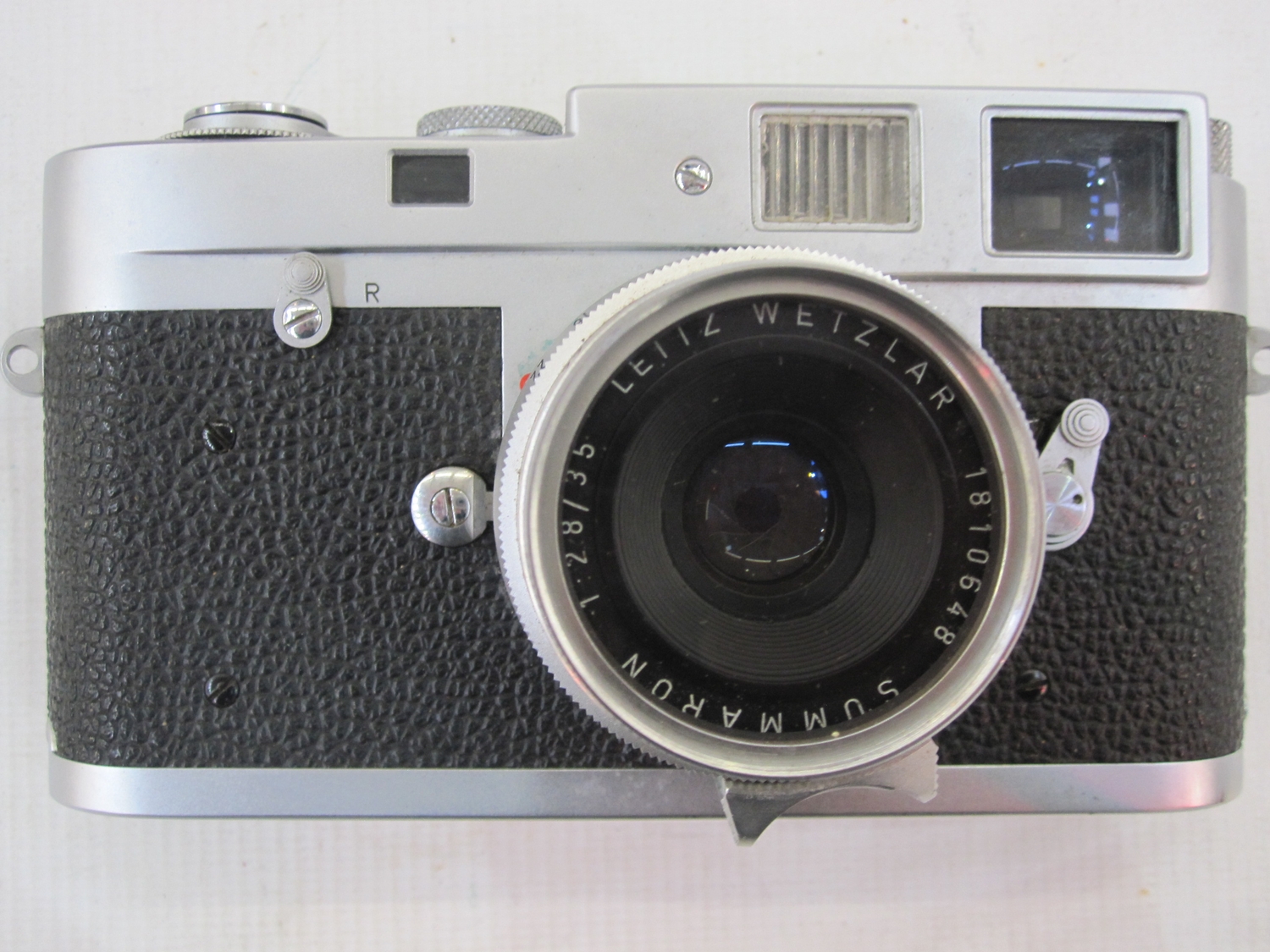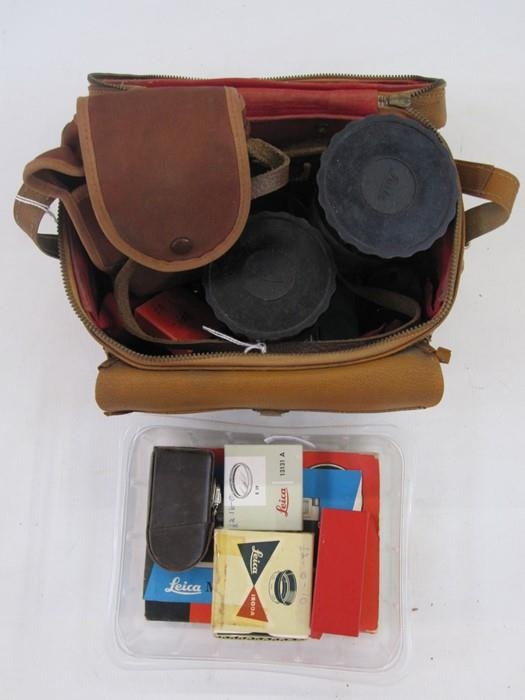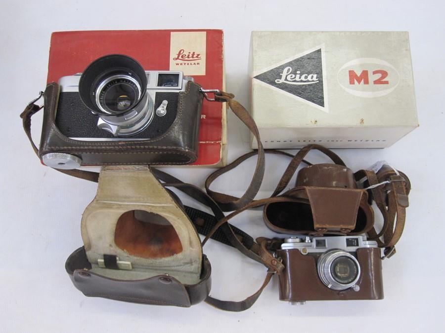 Leica M2-995 442 rangefinder camera, a Summaron lens serial number 1810648, an IROOA lens hood, in brown leather case, a brown carrying case containing a Leitz Wetzlar Elmar lens 1:4/90 serial number 1726298 in plastic case, an Ernst Leitz GmbH Wetzlar Elmar lens f+5cm 1:28 Nr. 1600391 in plastic case, a Gegenlichtblende 29mm lens hood, boxed, a Japanese self timer, an Ernst Leitz GmbH Wetzlar Summicron 5cm flter in plastic case, Voigtlander normal 25-29 in plastic box, various empty Leica boxes, Leica Guide and Leica M2 instructions in brief and a PaX M3 camera no.81886 in leather case