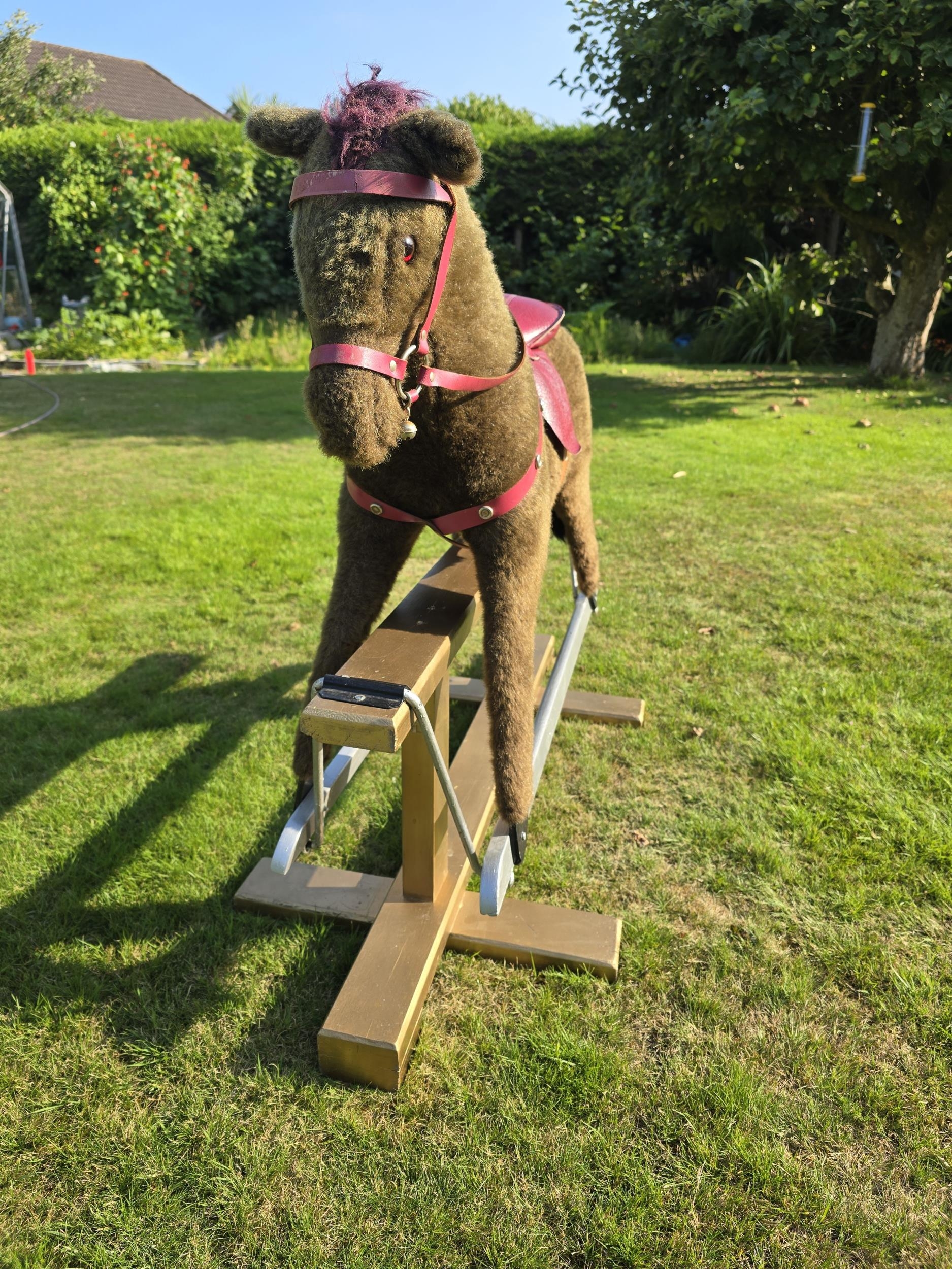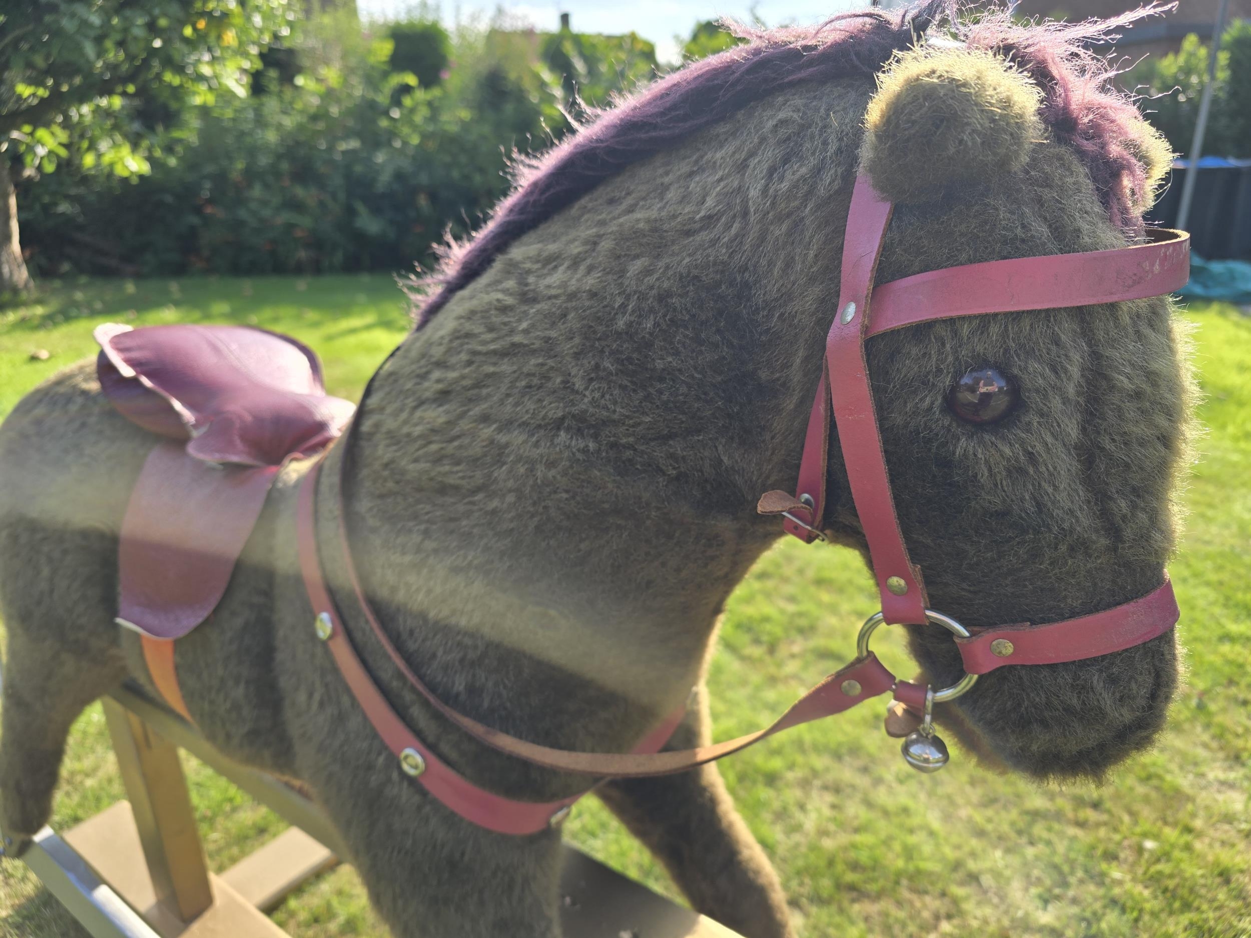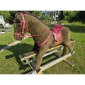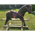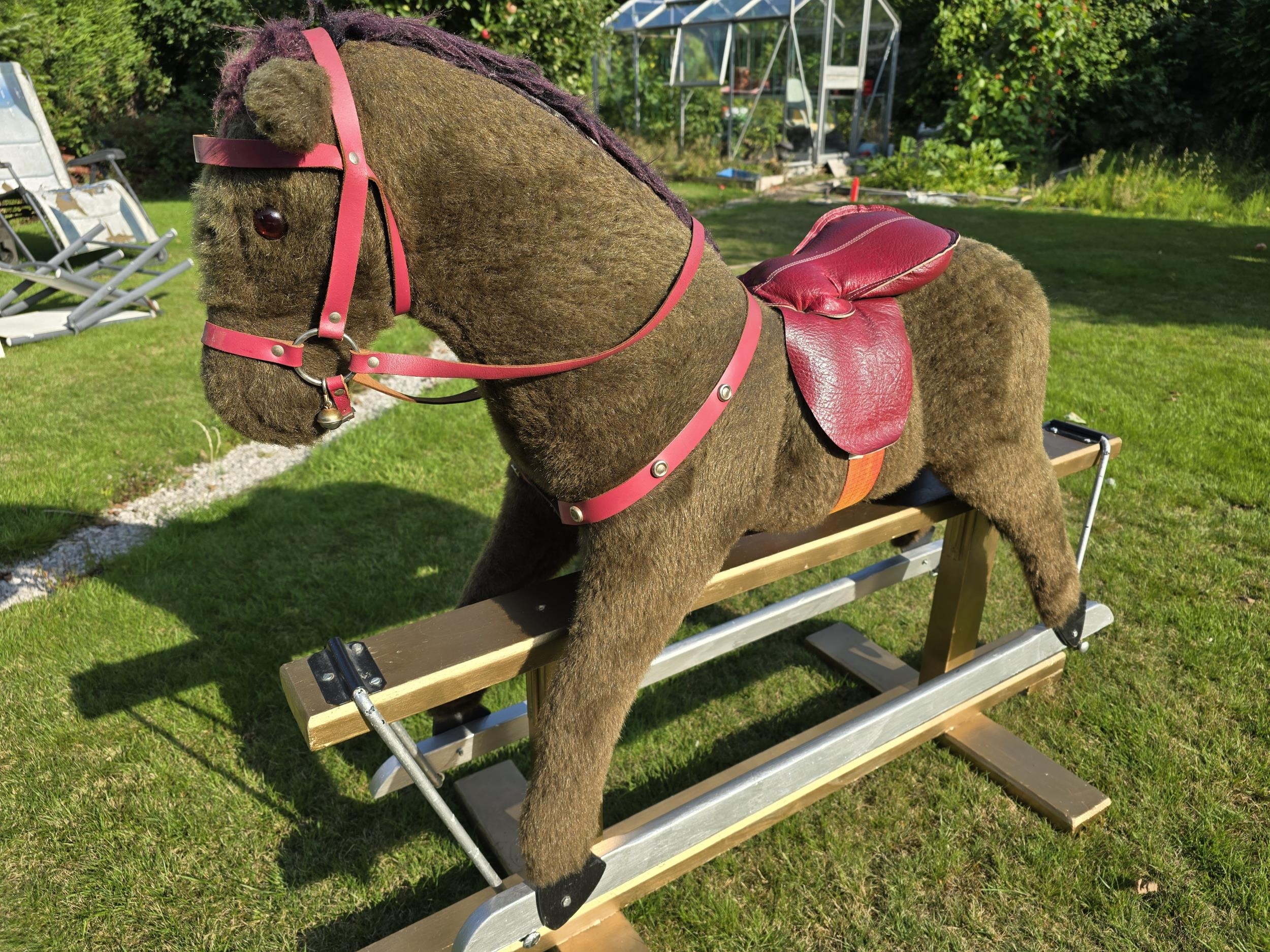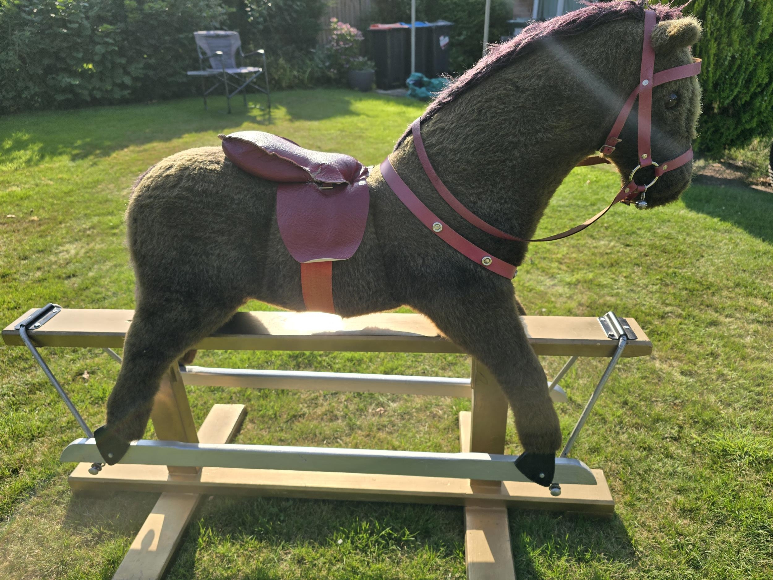 Vintage Rocking Horse. Plush fur covered. Leather padded saddle.Pegasus brand (Crewe). Trestle style. Great Xmas gift. Missing stirrups but not a concern as this is for bigger kids. Works very well. Height approx 1 m floor to top of head. COLLECTION ONLY from Ellesmere Port, by appointment