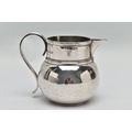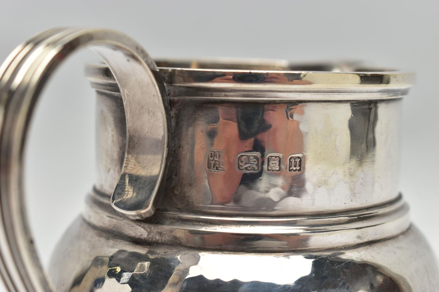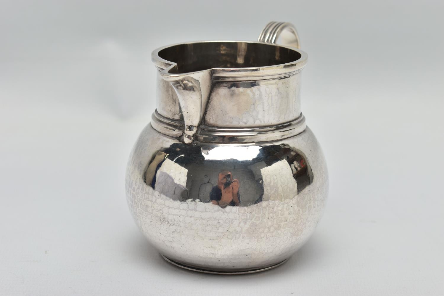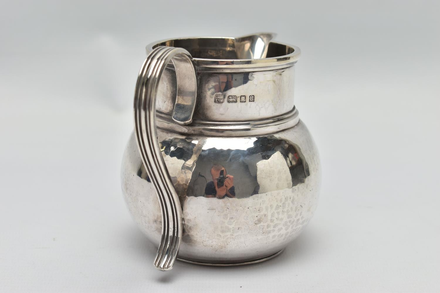 A GEORGE V SILVER JUG OF SQUAT BALUSTER FORM, the S scroll reeded handle on a planished body, makers C J Vander Ltd, London 1935, 7.03ozt, 218.6 grams, height 9.5cm (Condition report: a few tiny dints, interior requires cleaning but good condition overall)
