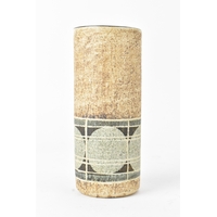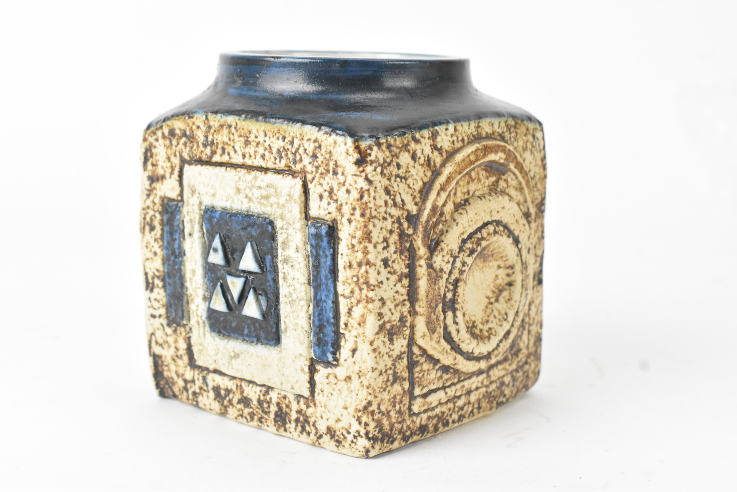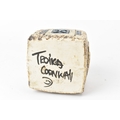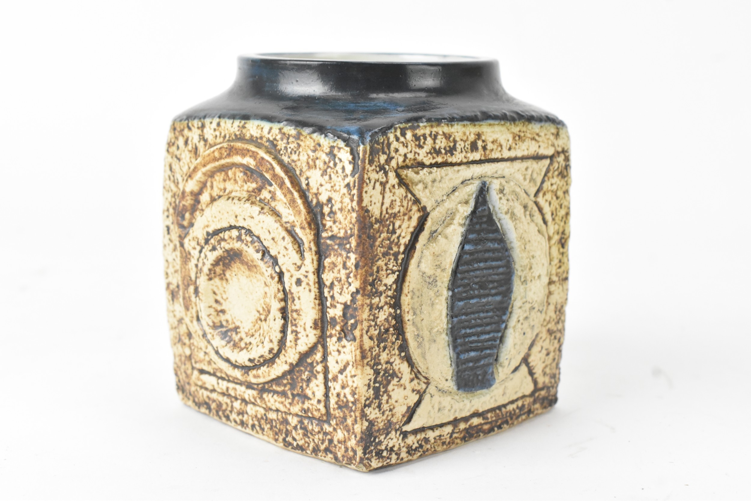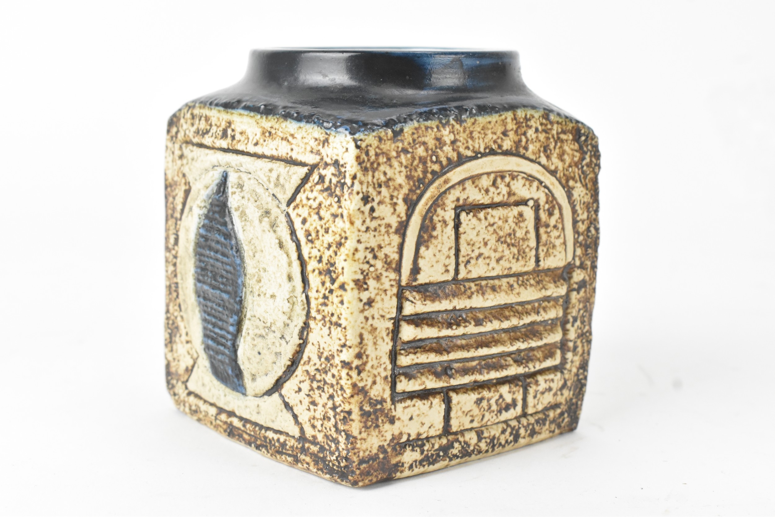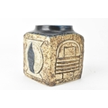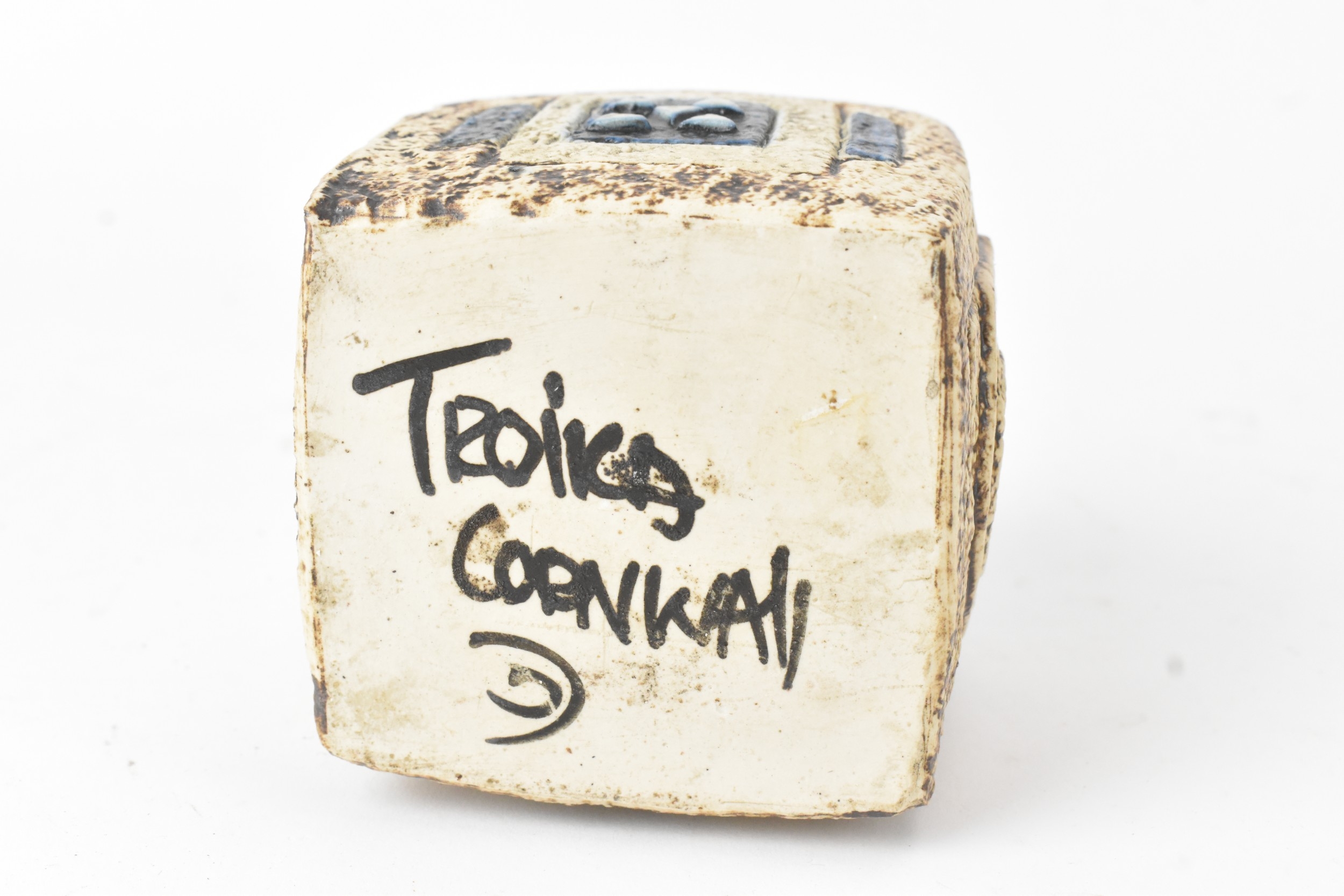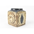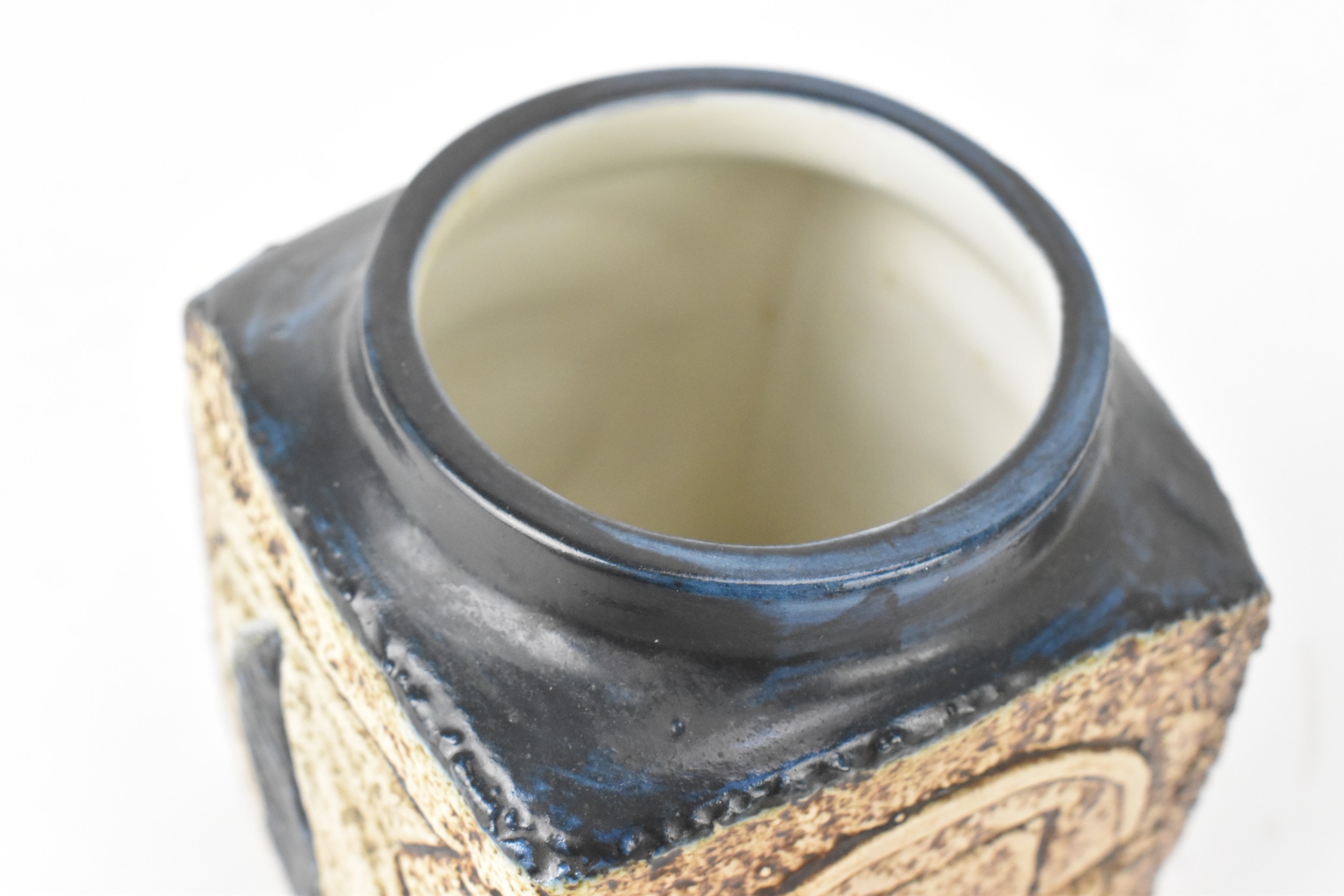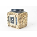 A Troika pottery marmalade pot by Tina Doubleday, having Aztec designs in relief and incised on a brown ground, signed and initialled to the base, 9cm high x 8cm wide