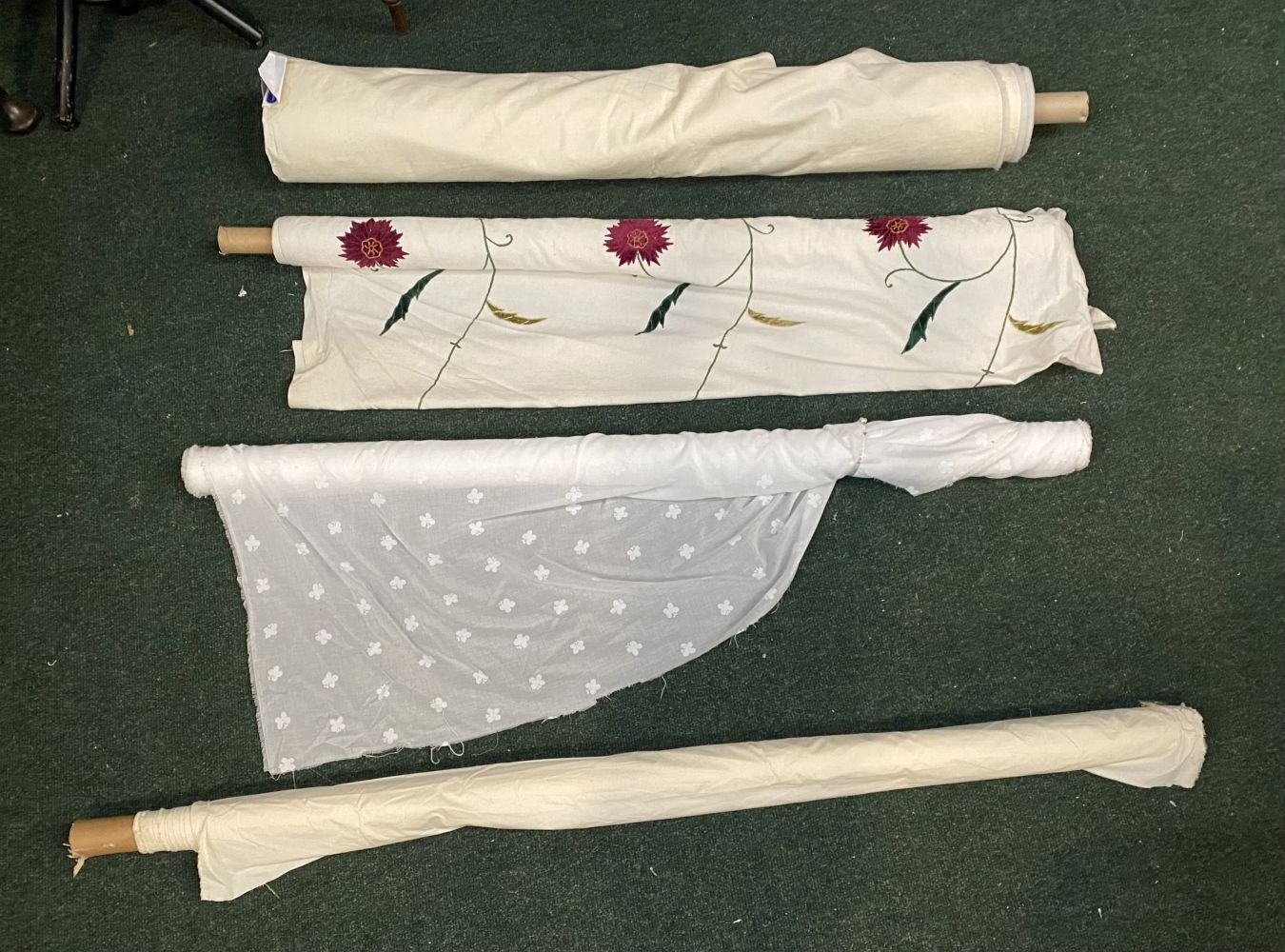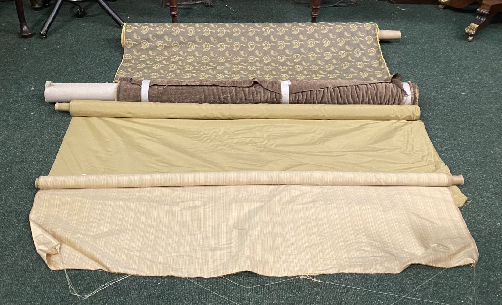 A LARGE COLLECTION OF ROLLS OF FABRICS, by a variety of Makers and in a variety of patterns etc. As photographed. Dimensions: widest: 144cm wide approx. 14 rolls total