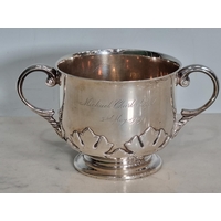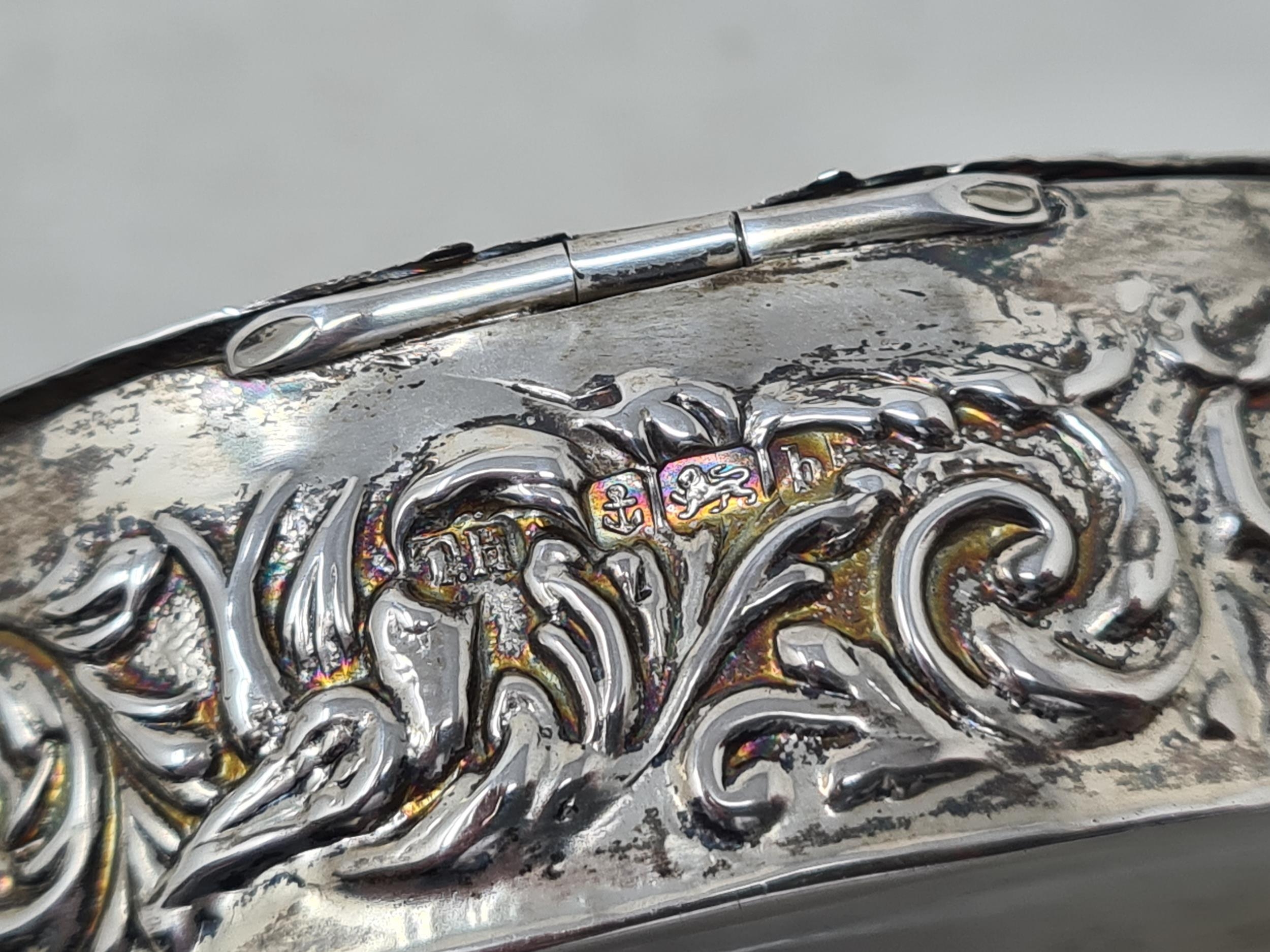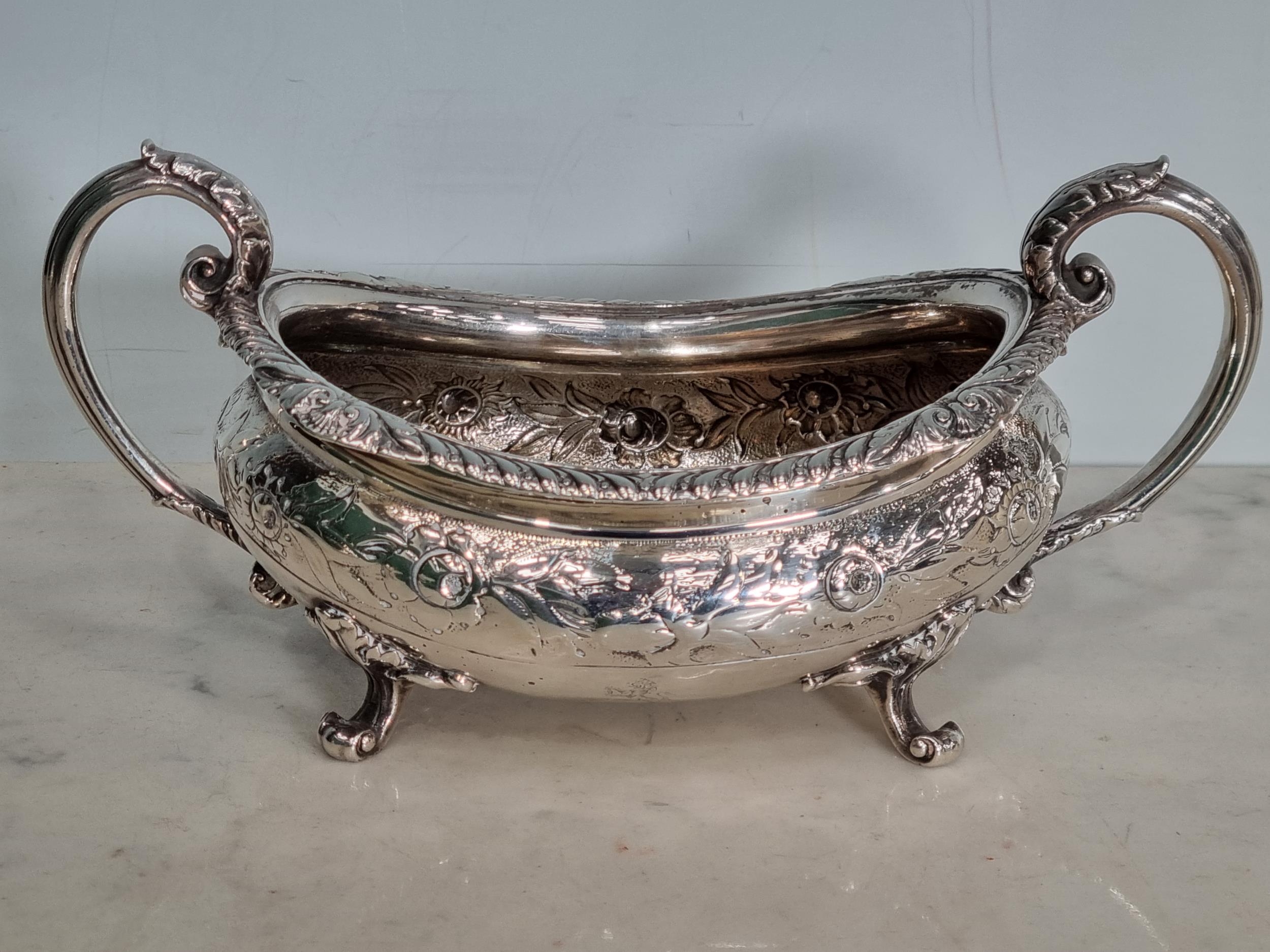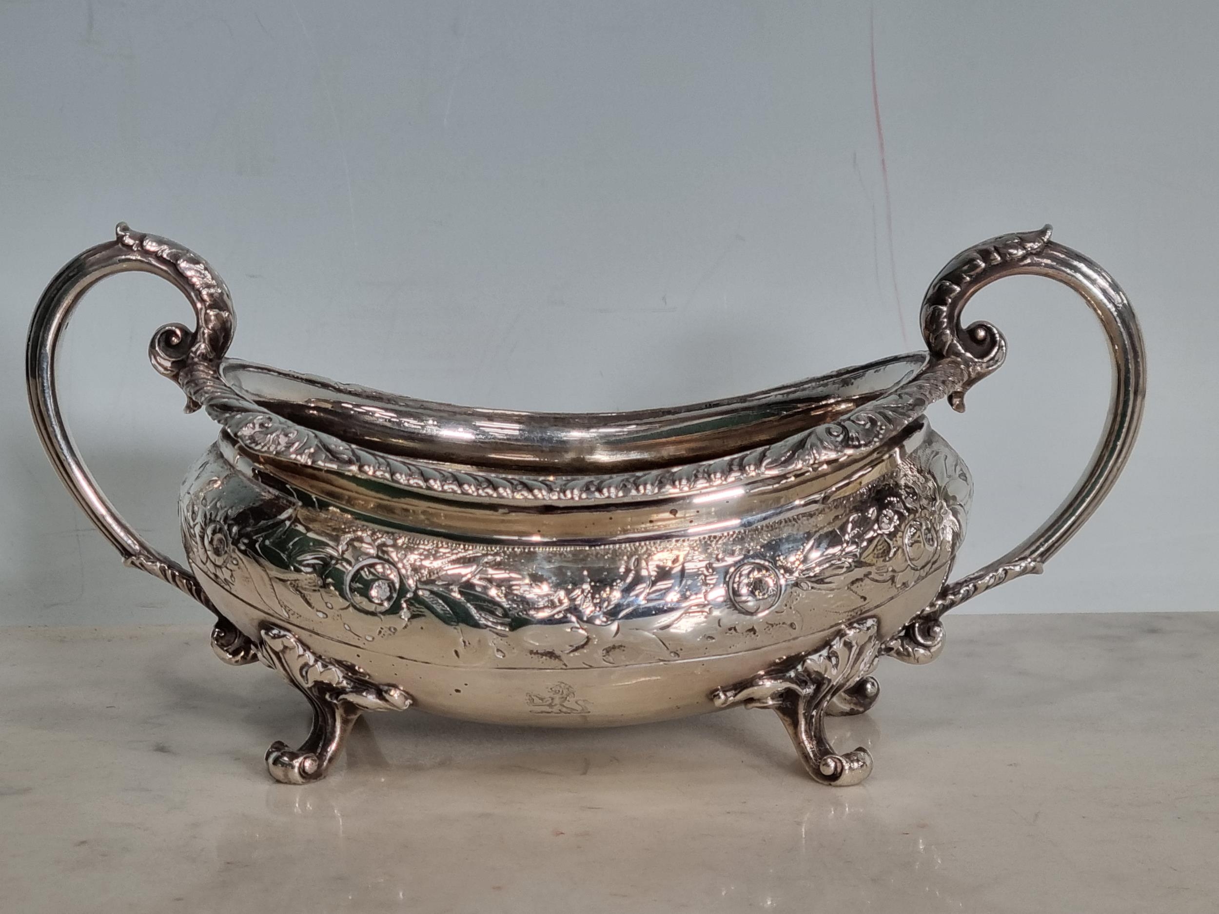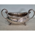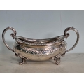 A George IV silver two handled boat shape Sugar Bowl with embossed floral frieze, engraved crest, gadroon rim, London 1823, maker: B.S, 420gms