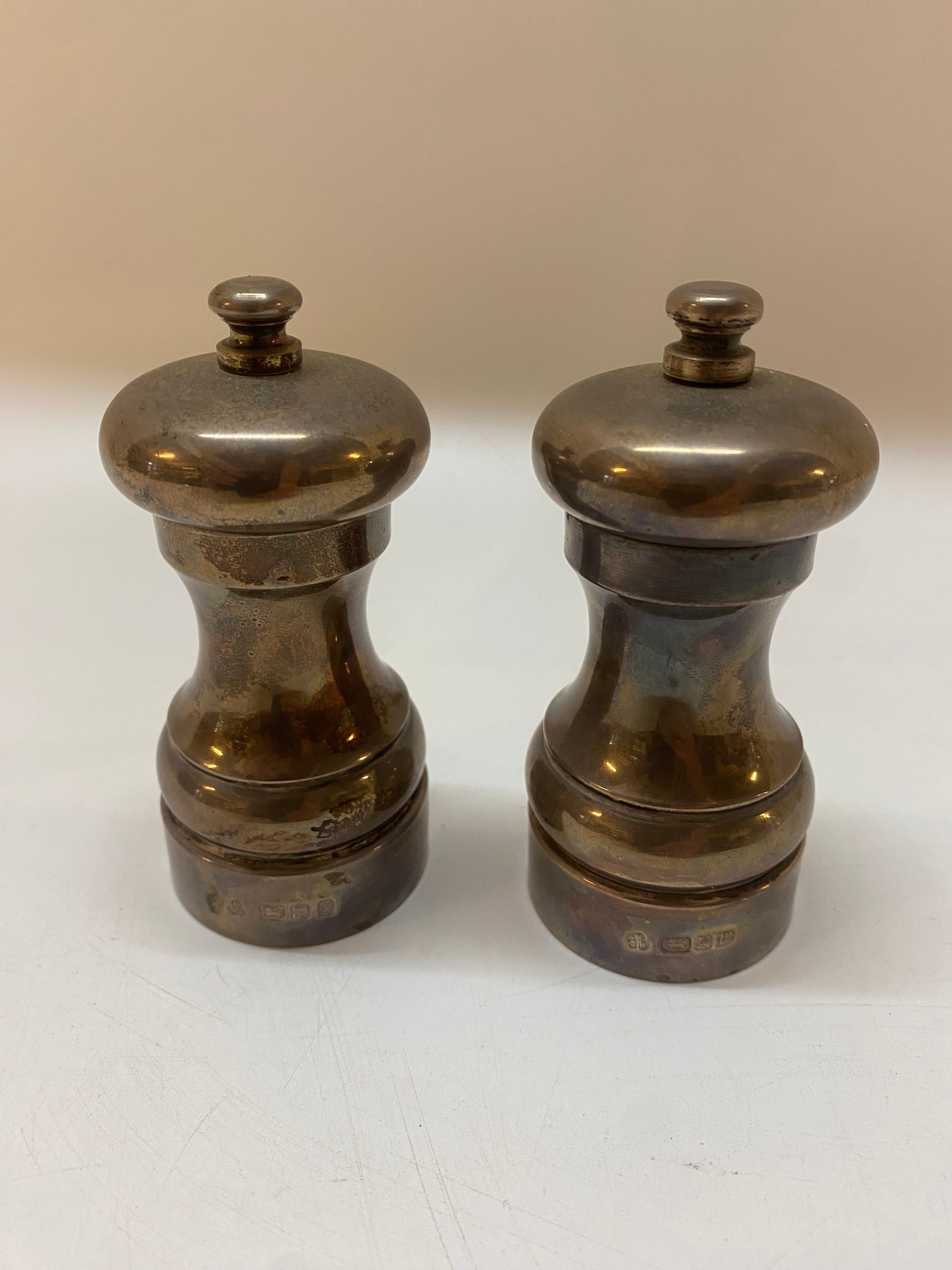 A Peter Piper salt and pepper mill mounted in plain silver - London 1996 and 1997, makers marks for M C Hersey & Son Ltd