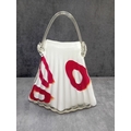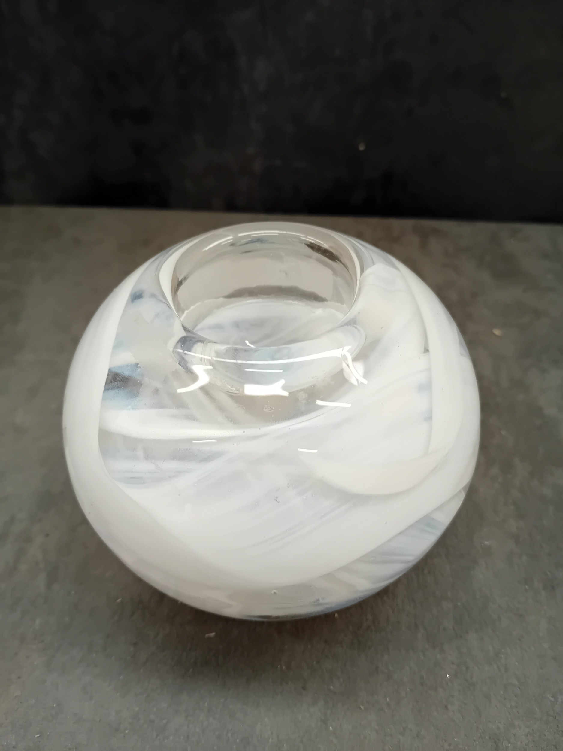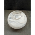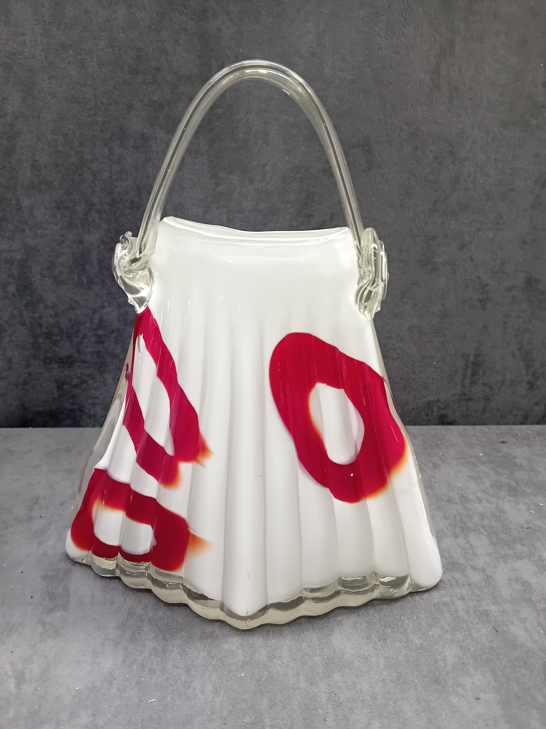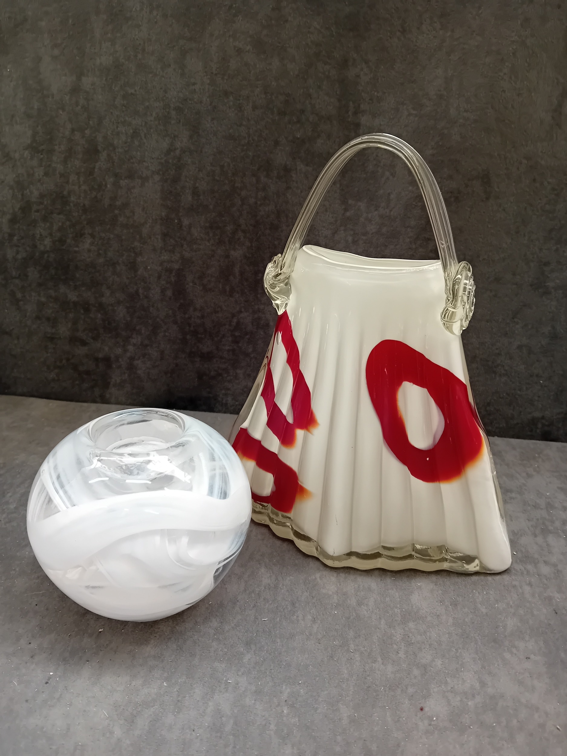 The first object is a stylized, fluted glass vessel, resembling a handbag or purse. It is crafted from opaque white glass with bold, irregular curvilinear designs in translucent red glass, and finished with a clear glass handle. The form and decoration are consistent with Murano style art glass. The second item is a spherical or ovoid art glass votive or candle holder, featuring a swirling pattern of opaque white and clear glass, with subtle hints of light blue or grey, surrounding a central clear circular opening. Both pieces exhibit a modern or studio glass aesthetic.