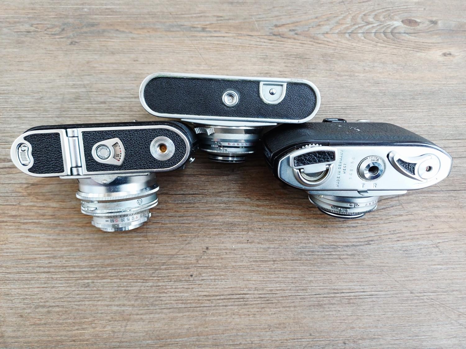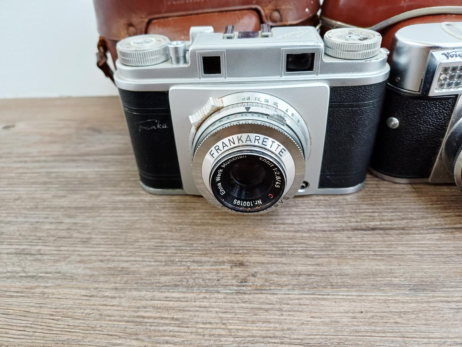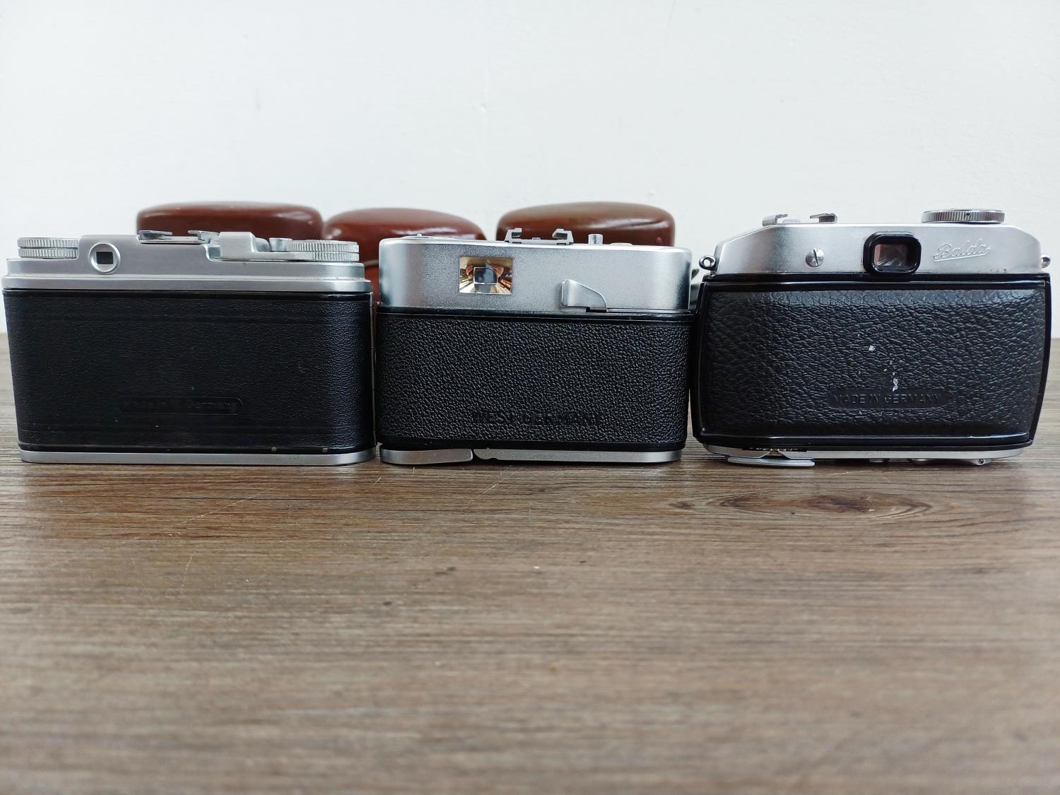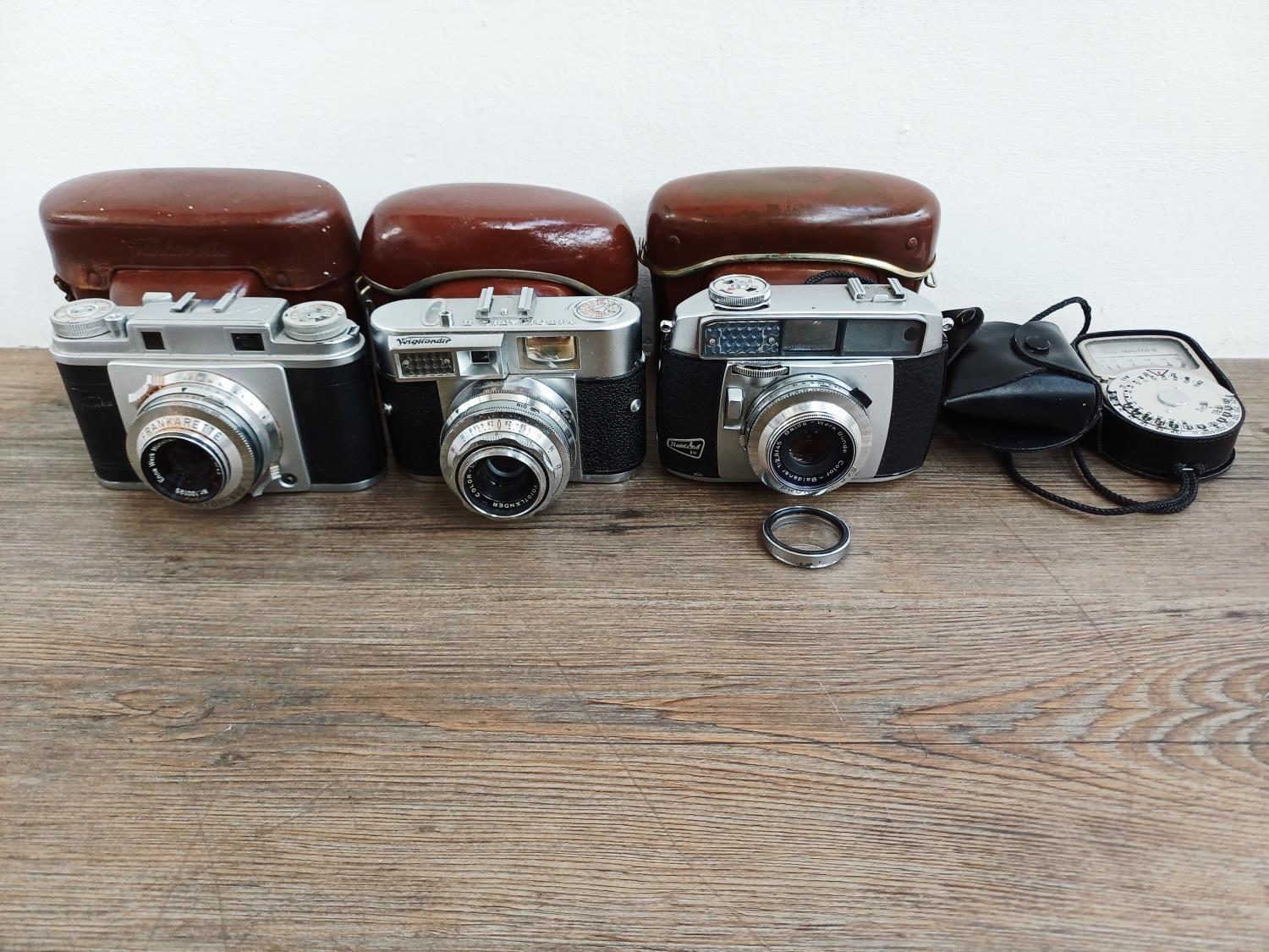 Three cased 1950s German 35mm rangefinder cameras, one Voigtländer Vitomatic II, one Balda Baldessa Ib and one Franka Frankarette (Super Frankarette R I) together with cased Euro-Master II light meter