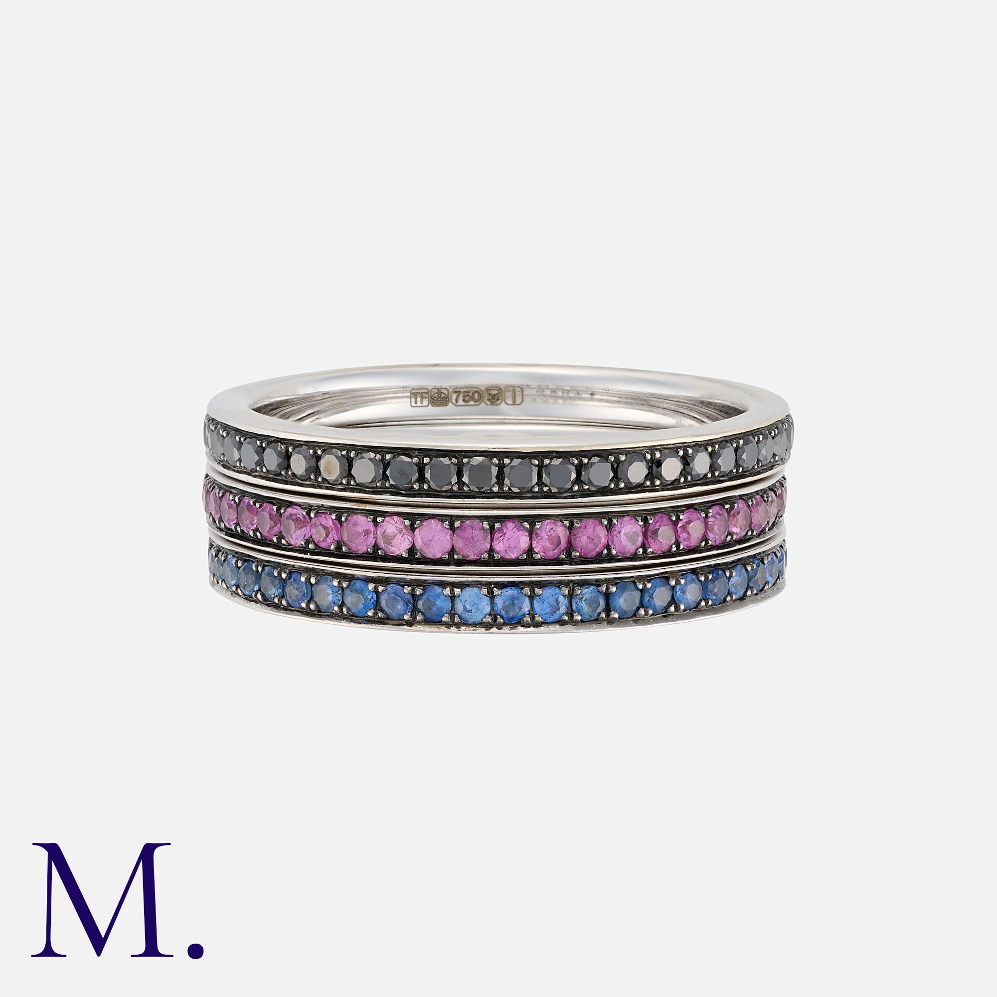 THEO FENNELL, A Set of Stacking Rings in 18 carat white gold, one set with round cut black diamonds, one with round cut blue sapphires and one with round cut pink sapphires. Each Signed THEO FENNELL, Hallmarked for 18 carat gold. Accompanied by Theo Fennel Pouch.