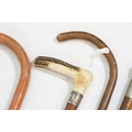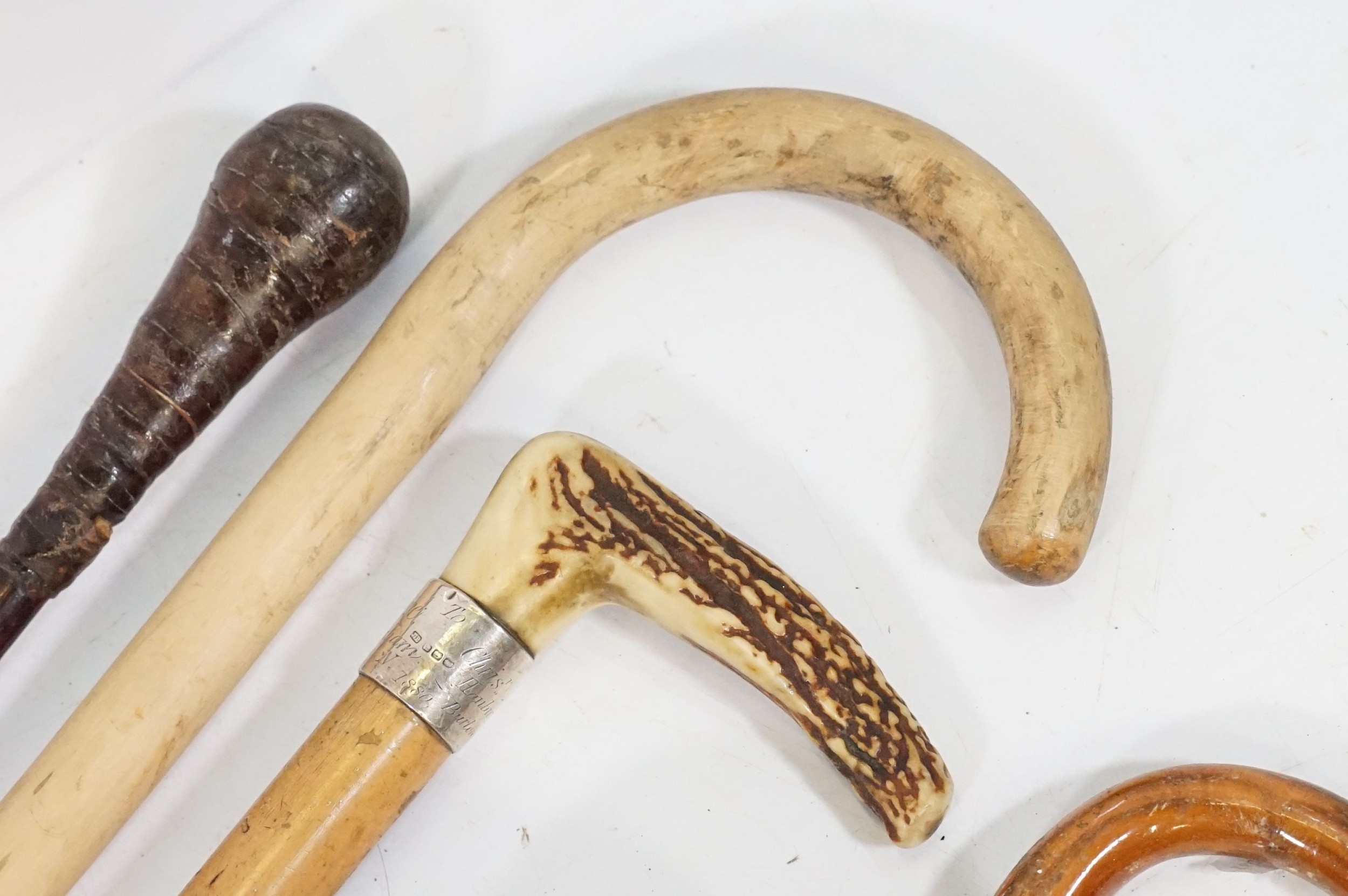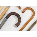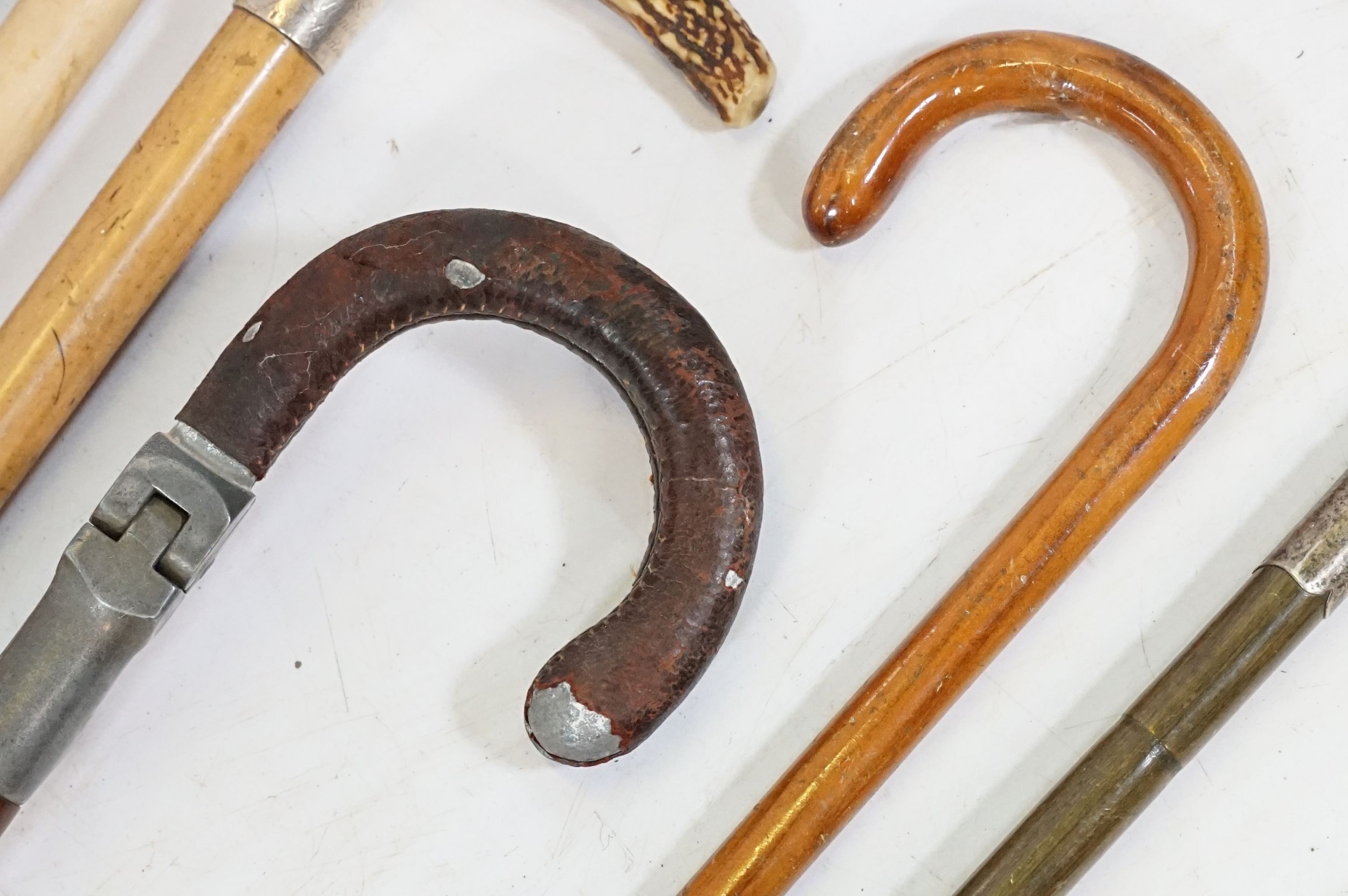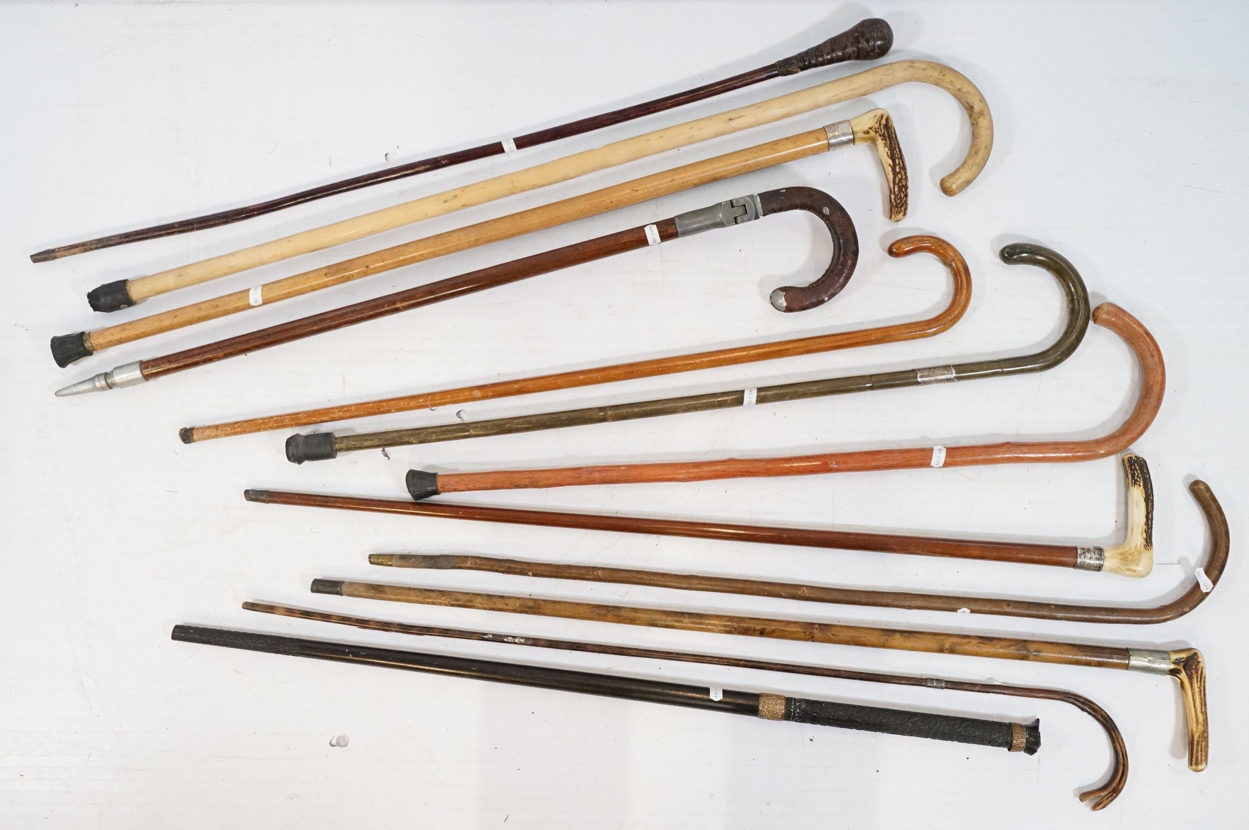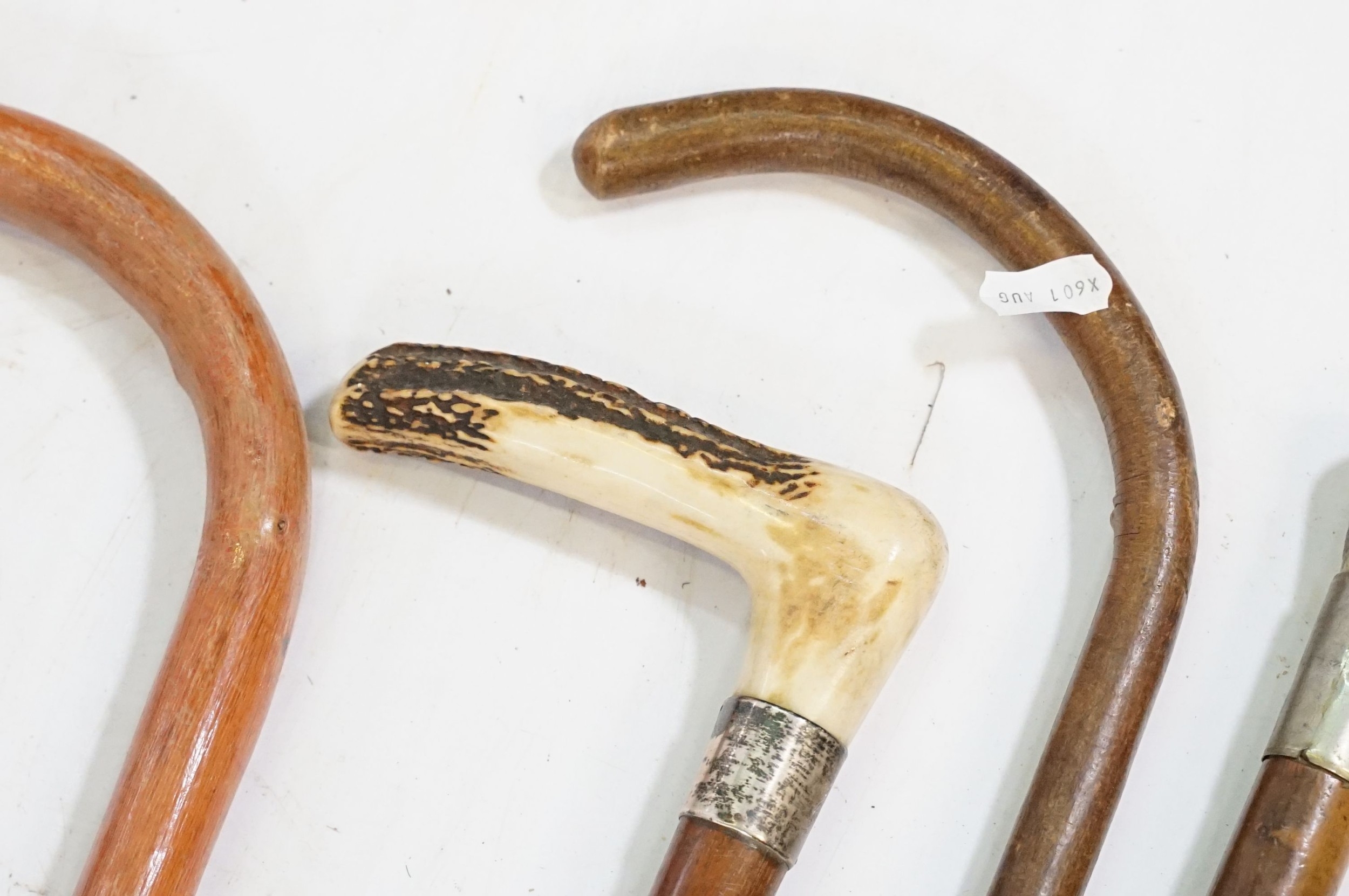 Collection of antique and later walking sticks, comprising two with silver collar and antler handle, two cane examples, a shooting stick, etc. (12)