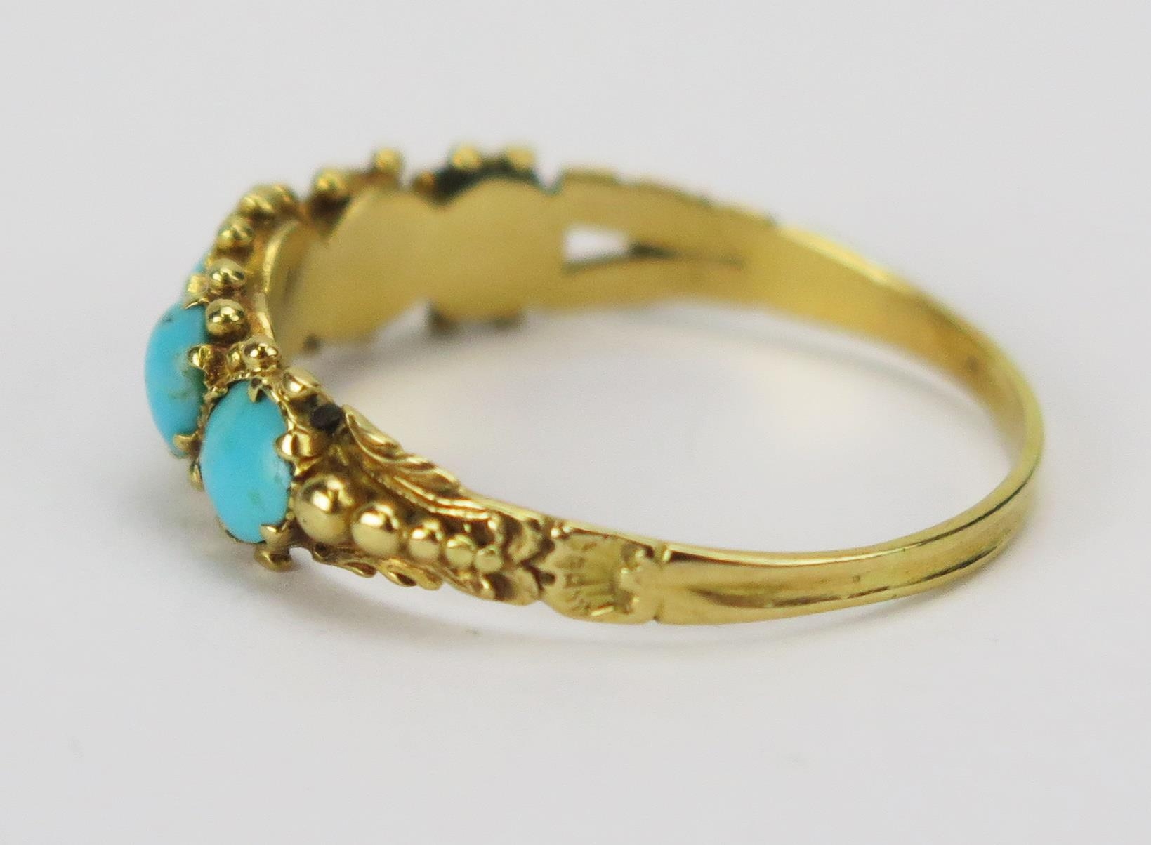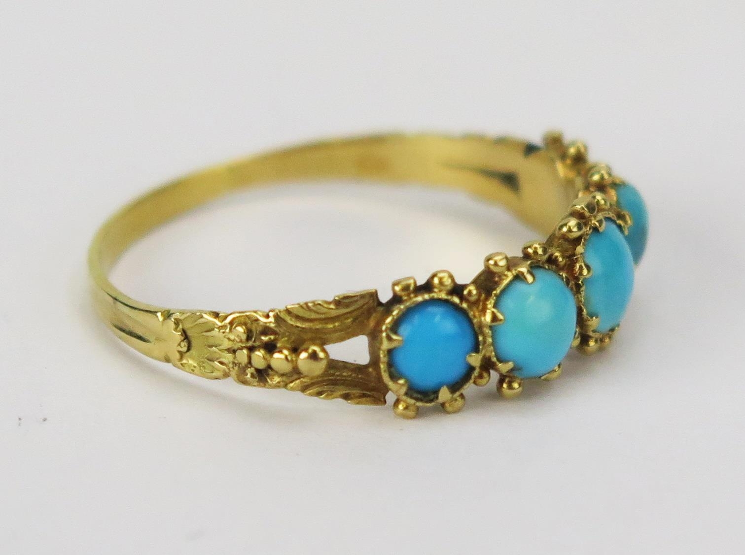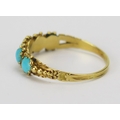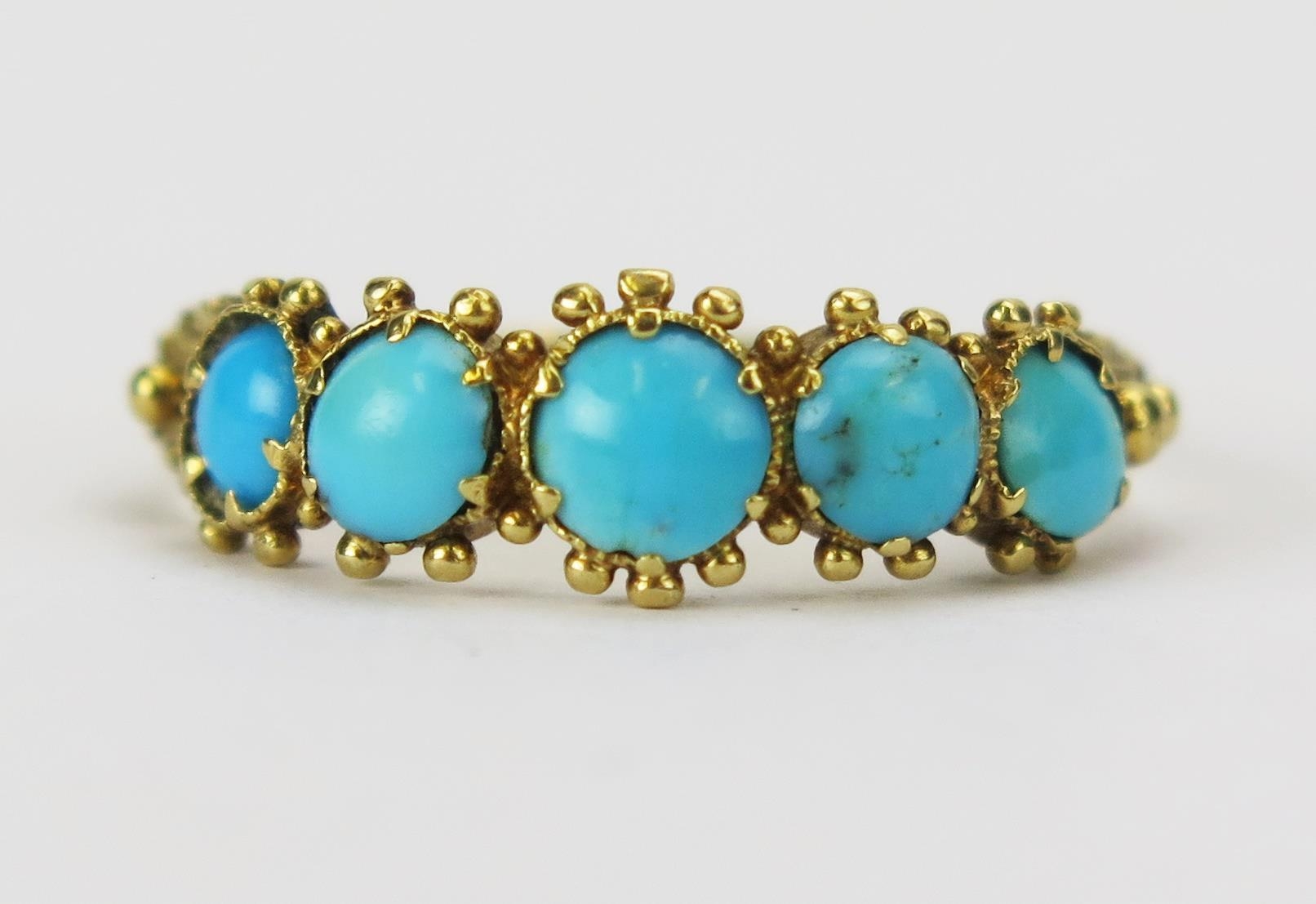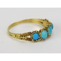 A Victorian Turquoise Five Stone Ring in a precious yellow metal setting, KEE tests as 15ct, size Q, 1.72g. UNLESS OTHERWISE STATED, THE KEE TEST IS A SURFACE TEST ONLY AND IS NOT A GUARANTEE OF GOLD PURITY.