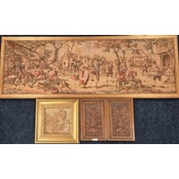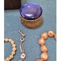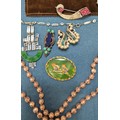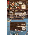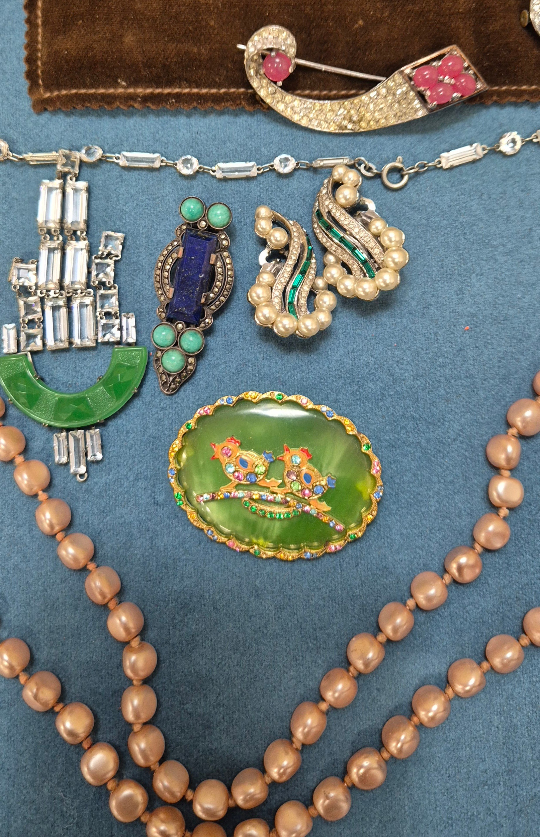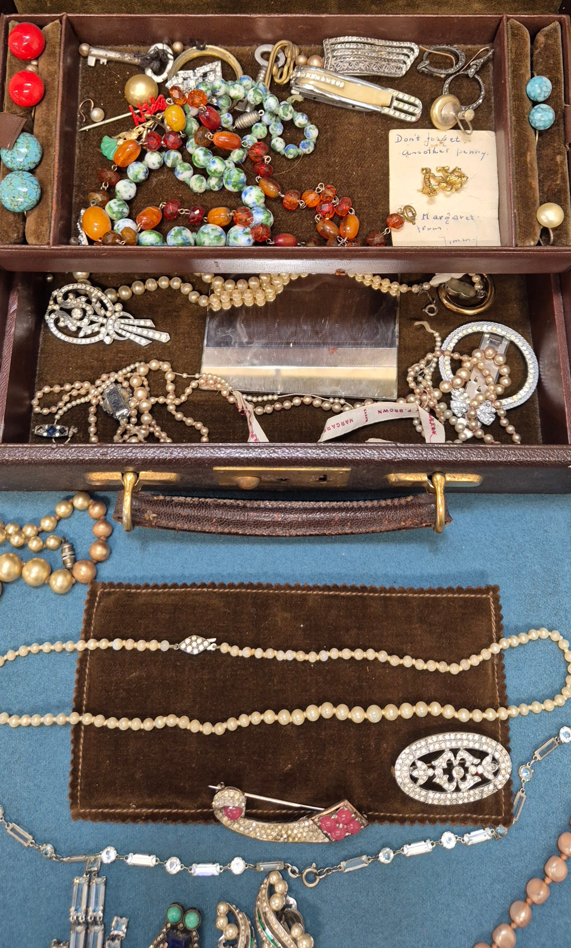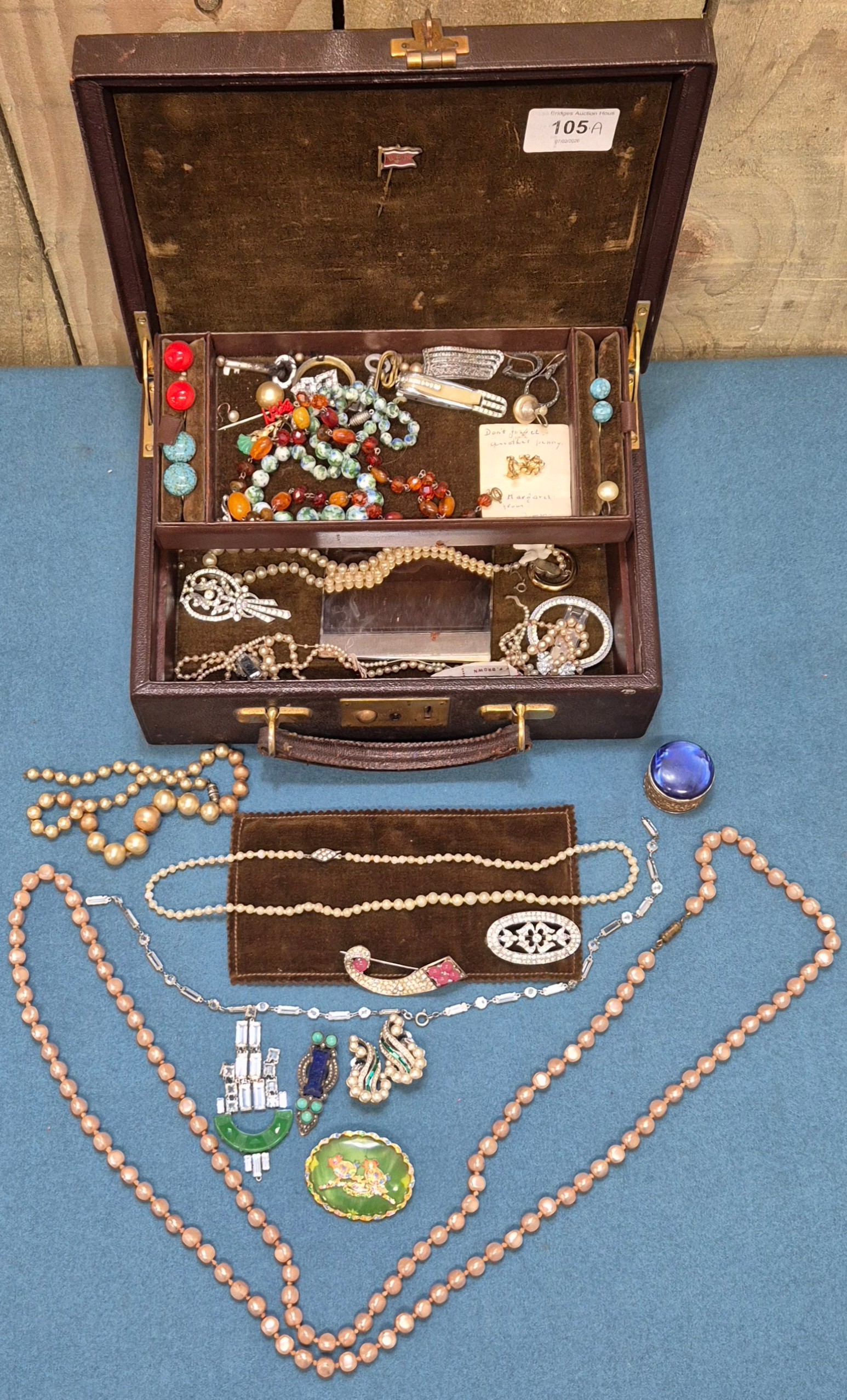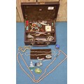 Antique London made leather jewellery carry case containing art deco and later jewellery; Reja Sterling horn shaped brooch, Art deco pendant, Clip on earrings. 935 silver, lapis lazuli, marcasite and green stone clip on brooch and other items.