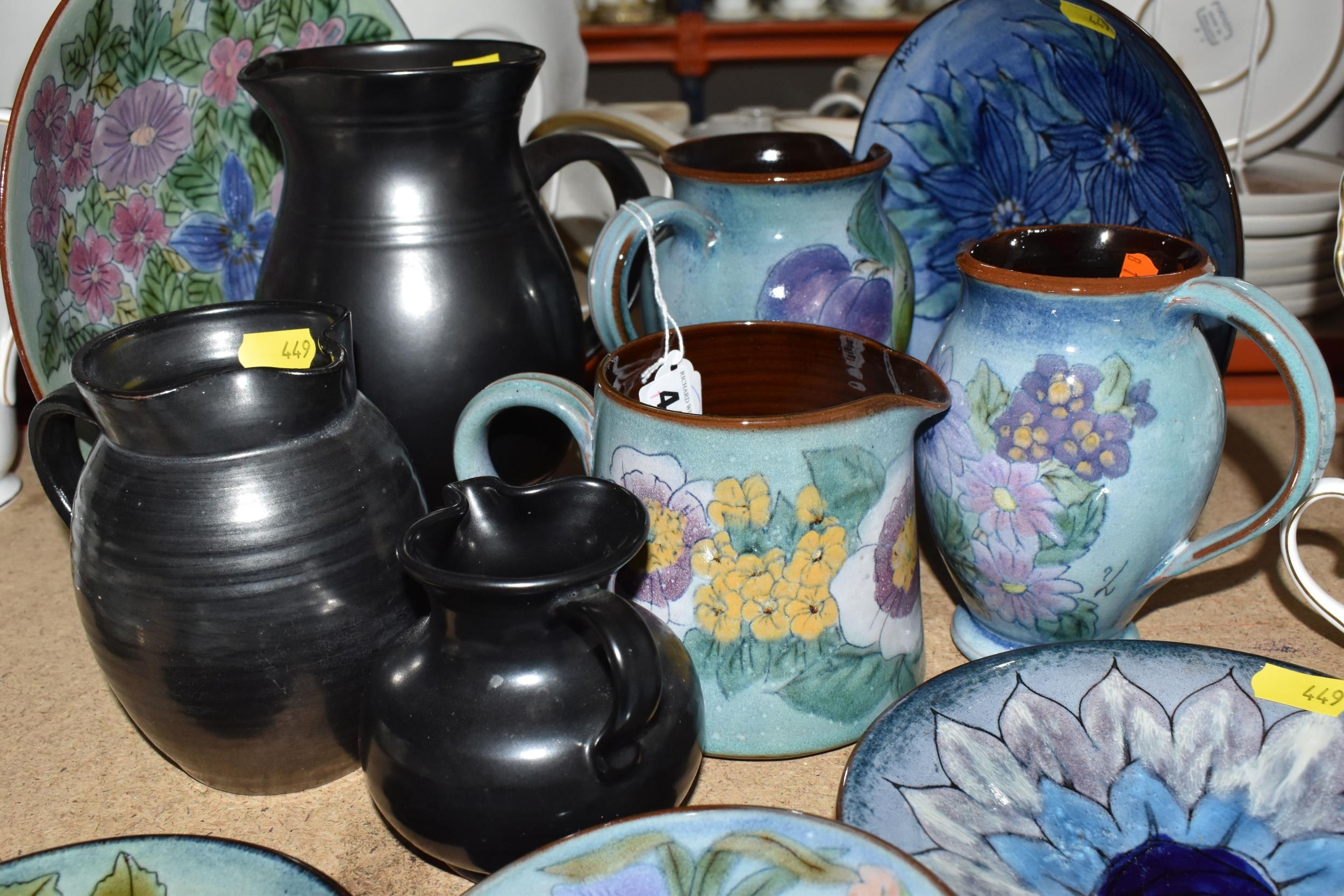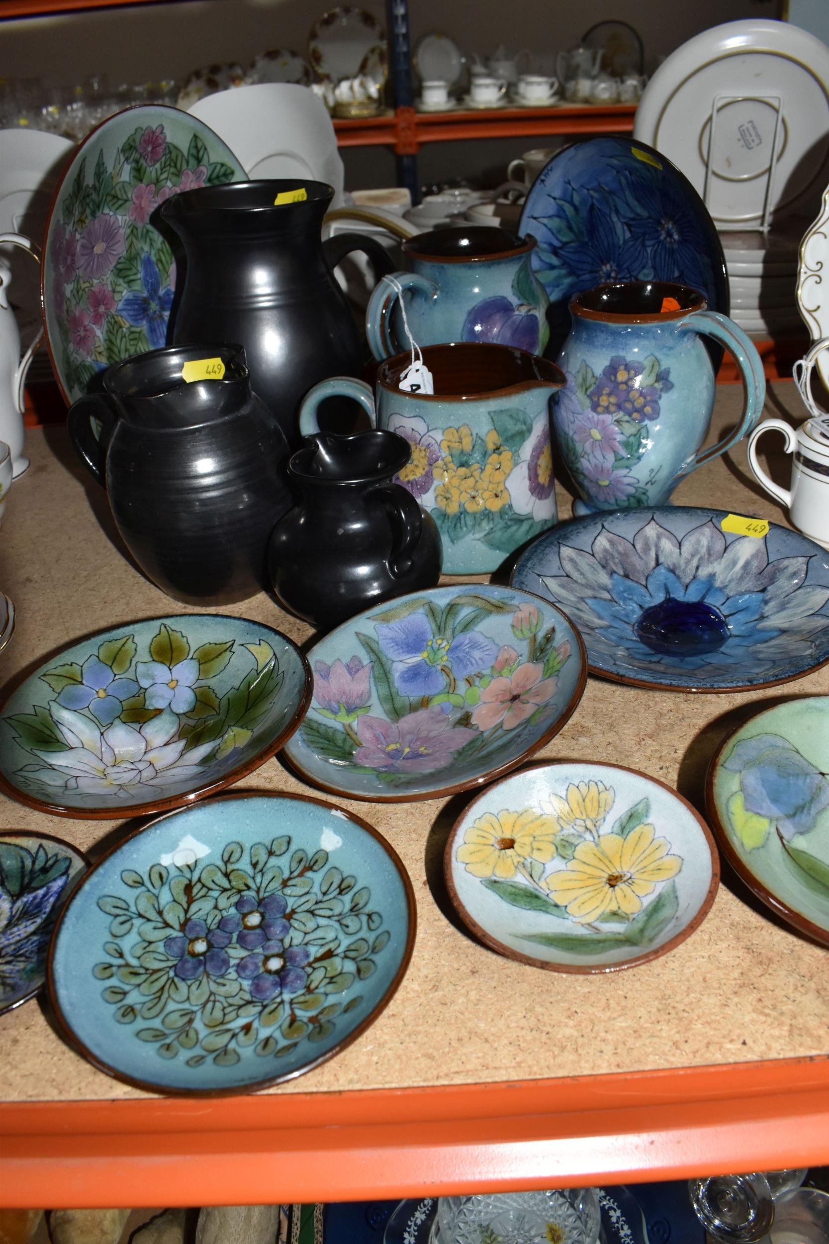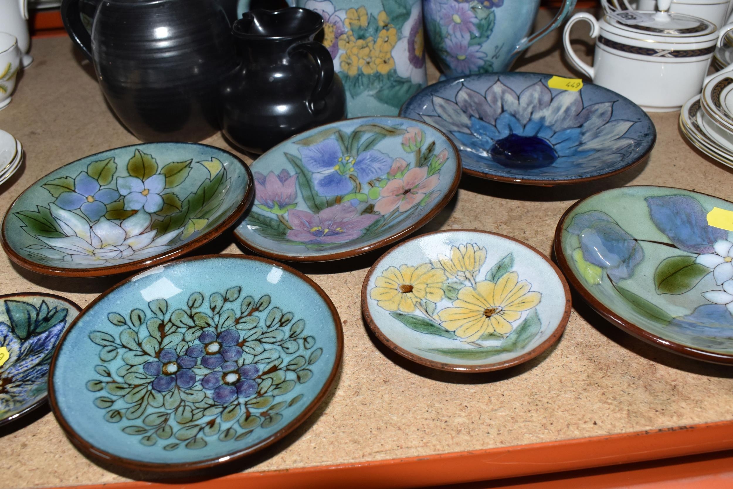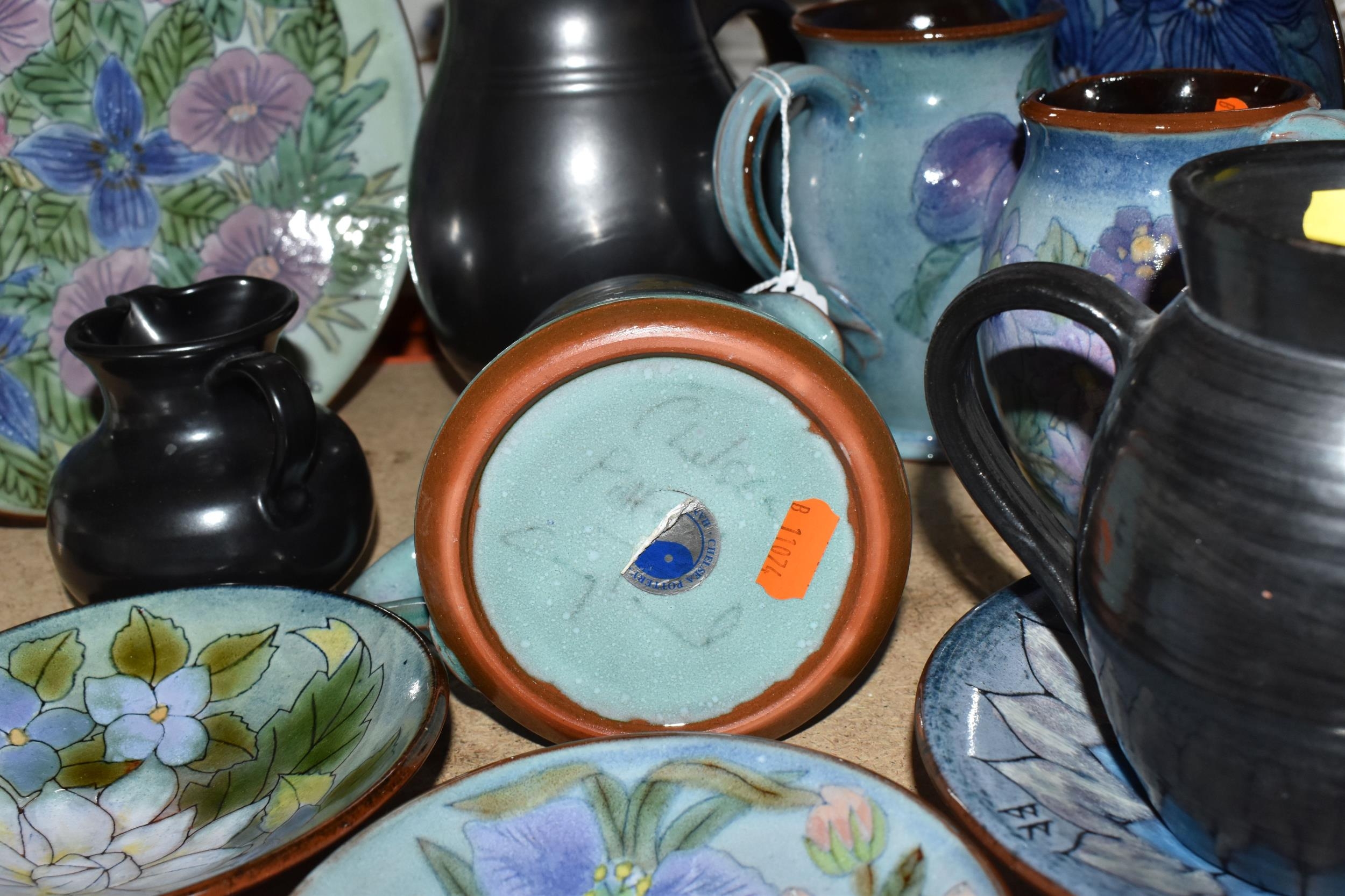 A GROUP OF CHELSEA AND PRINKNASH CERAMICS comprising a group of nine Chelsea Pottery floral dishes and three jugs, all marked by various designers to include marks from 'M. Tomlin,' diameters vary from 9cm to 35cm 'B.R,' and 'A.B,' and three Prinknash jugs of descending size (15) (Condition: overall in fair condition, some original retail stickers to the base)