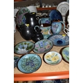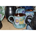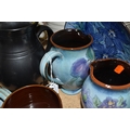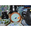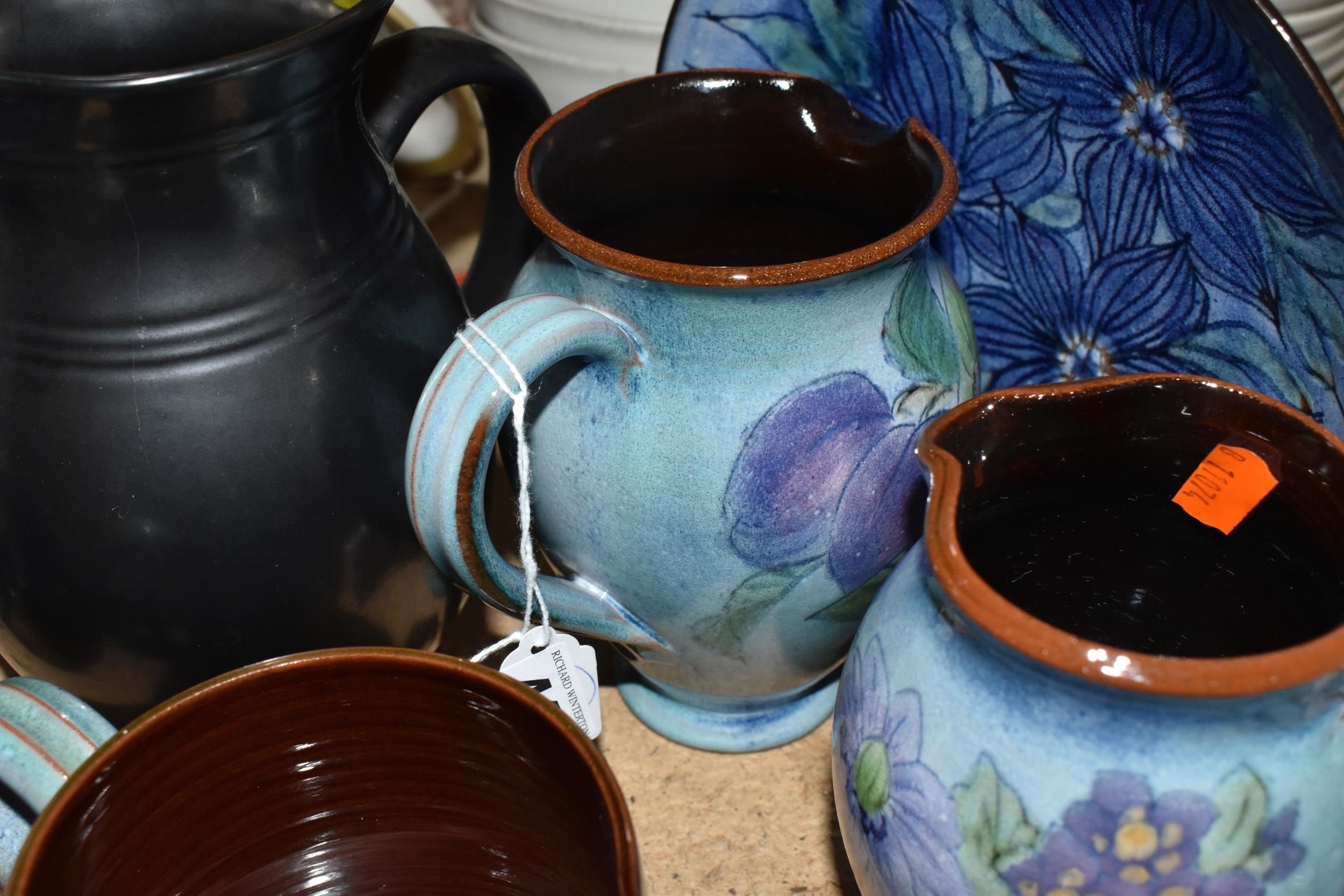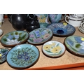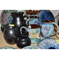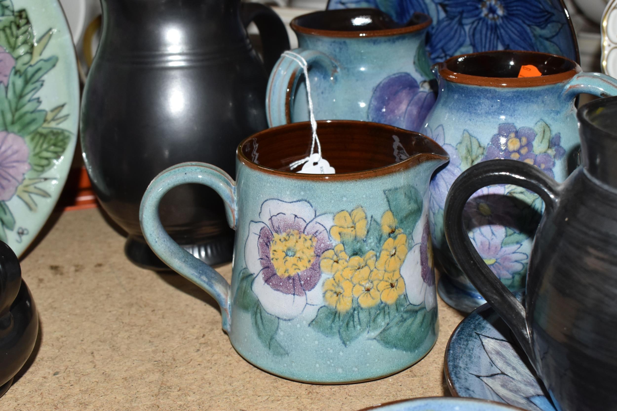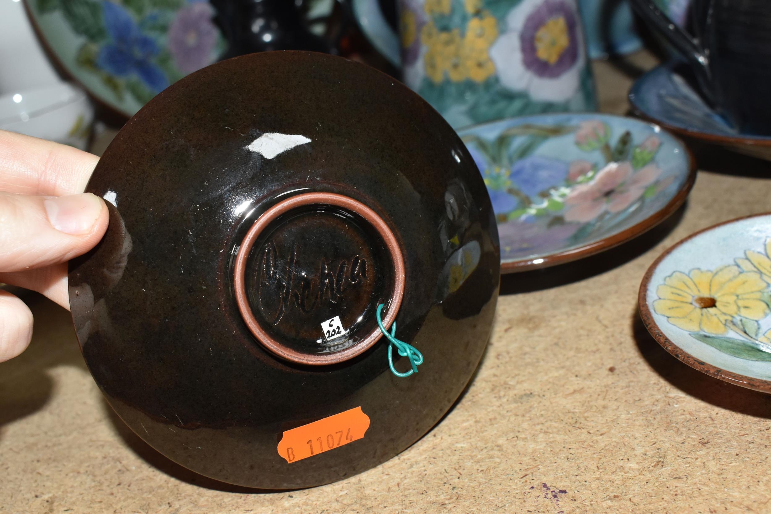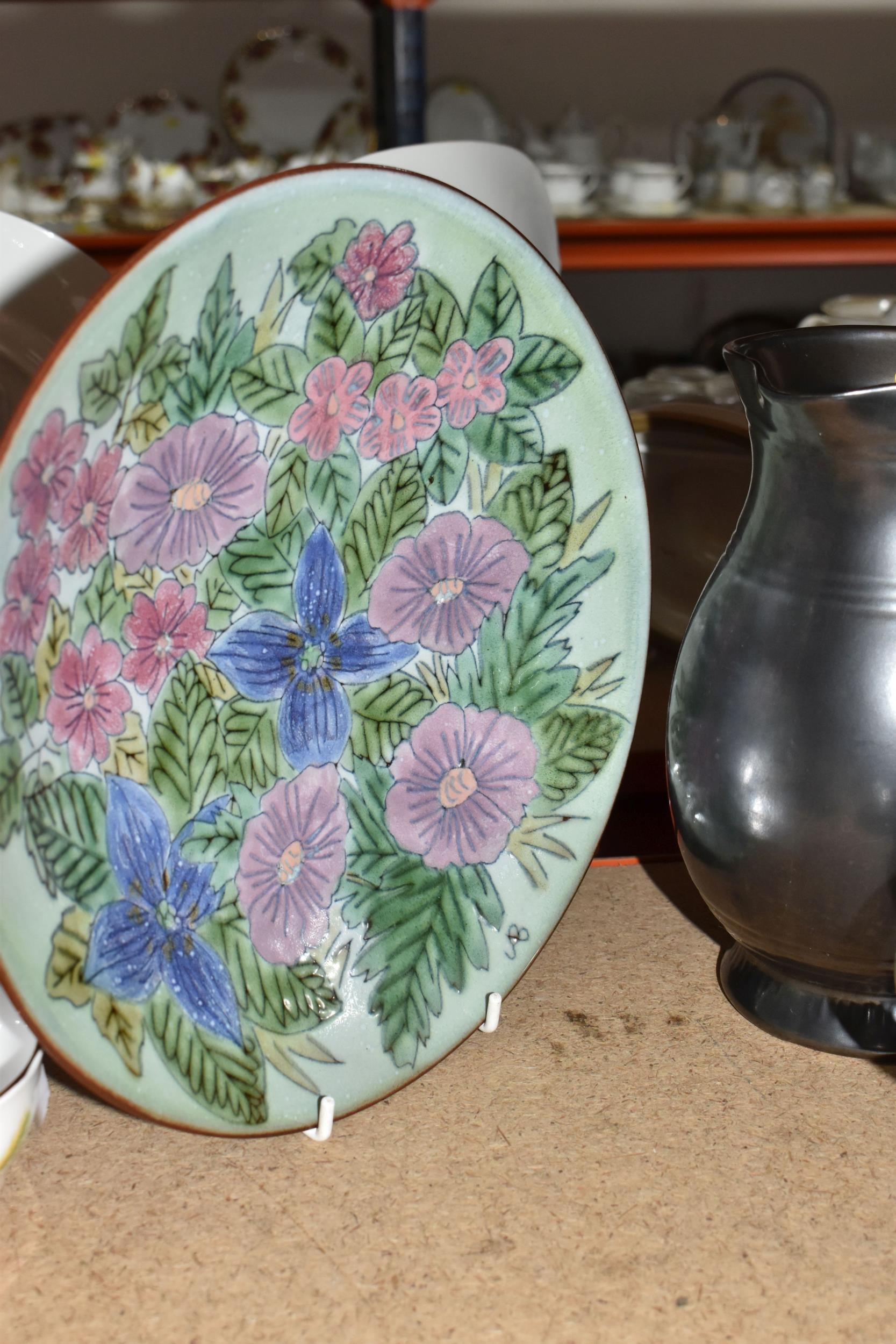 A GROUP OF CHELSEA AND PRINKNASH CERAMICS comprising a group of nine Chelsea Pottery floral dishes and three jugs, all marked by various designers to include marks from 'M. Tomlin,' diameters vary from 9cm to 35cm 'B.R,' and 'A.B,' and three Prinknash jugs of descending size (15) (Condition: overall in fair condition, some original retail stickers to the base)