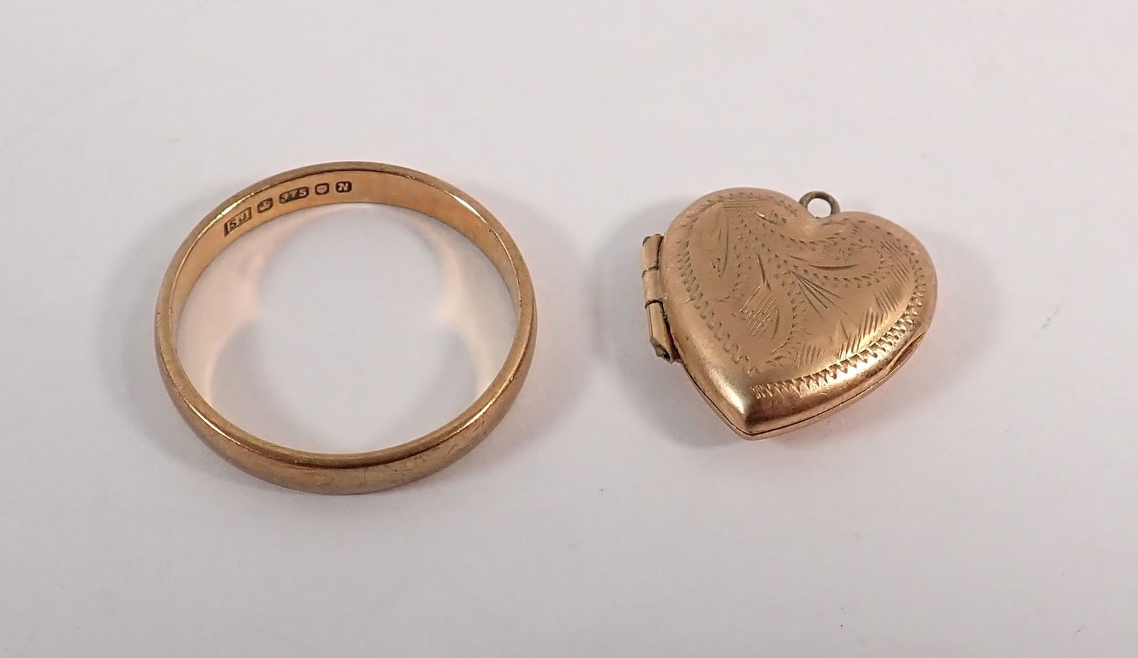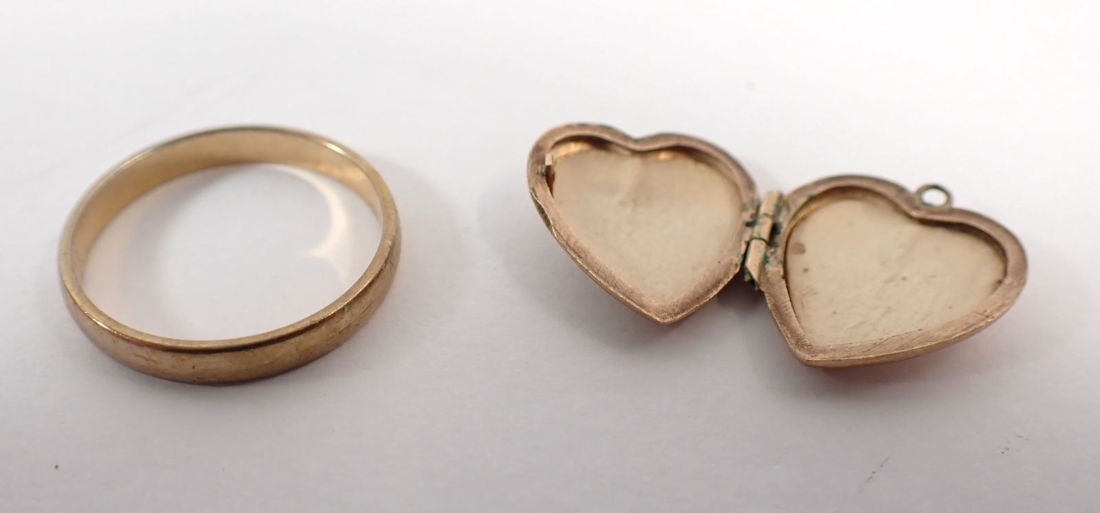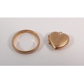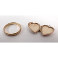 A 9ct gold wedding band size I-J 1.2g and a 9ct gold heart locket 1g