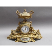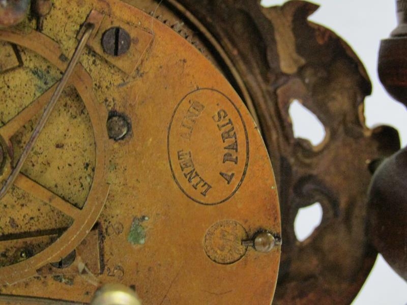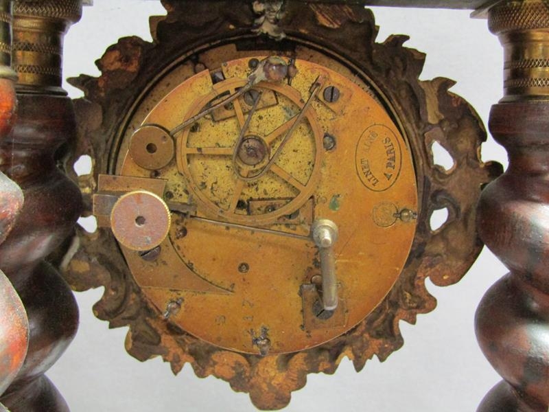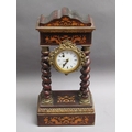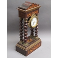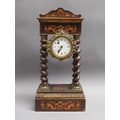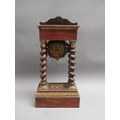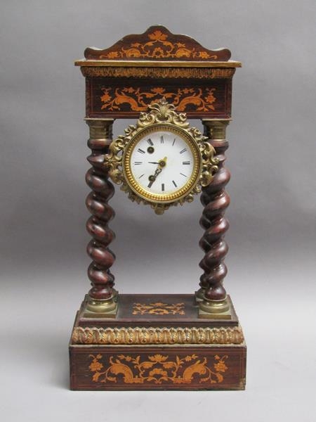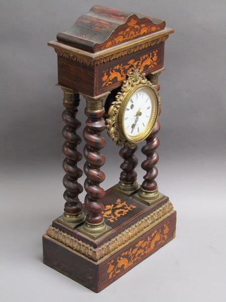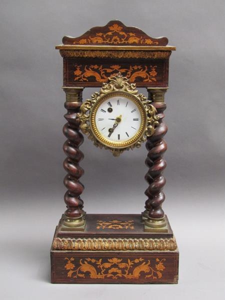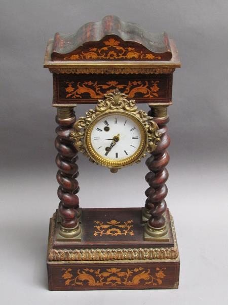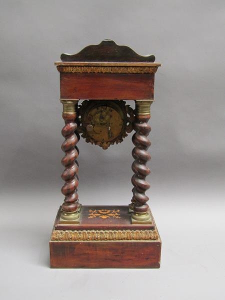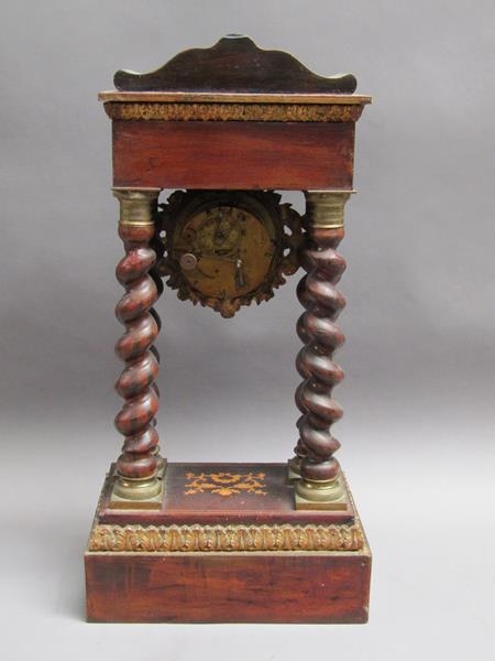 A mid 19c French portico clock, the movement held between four barley sugar twist columns which stand on a rectangular step base and support a pediment with wavy top. The case is veneered in rosewood with boxwood floral inlays and has cast brass decoration around the base and pediment and around the dial. The movement is countwheel striking on a bell (missing) and is lacking its pendulum. The clocks stands 50cm tall overall.