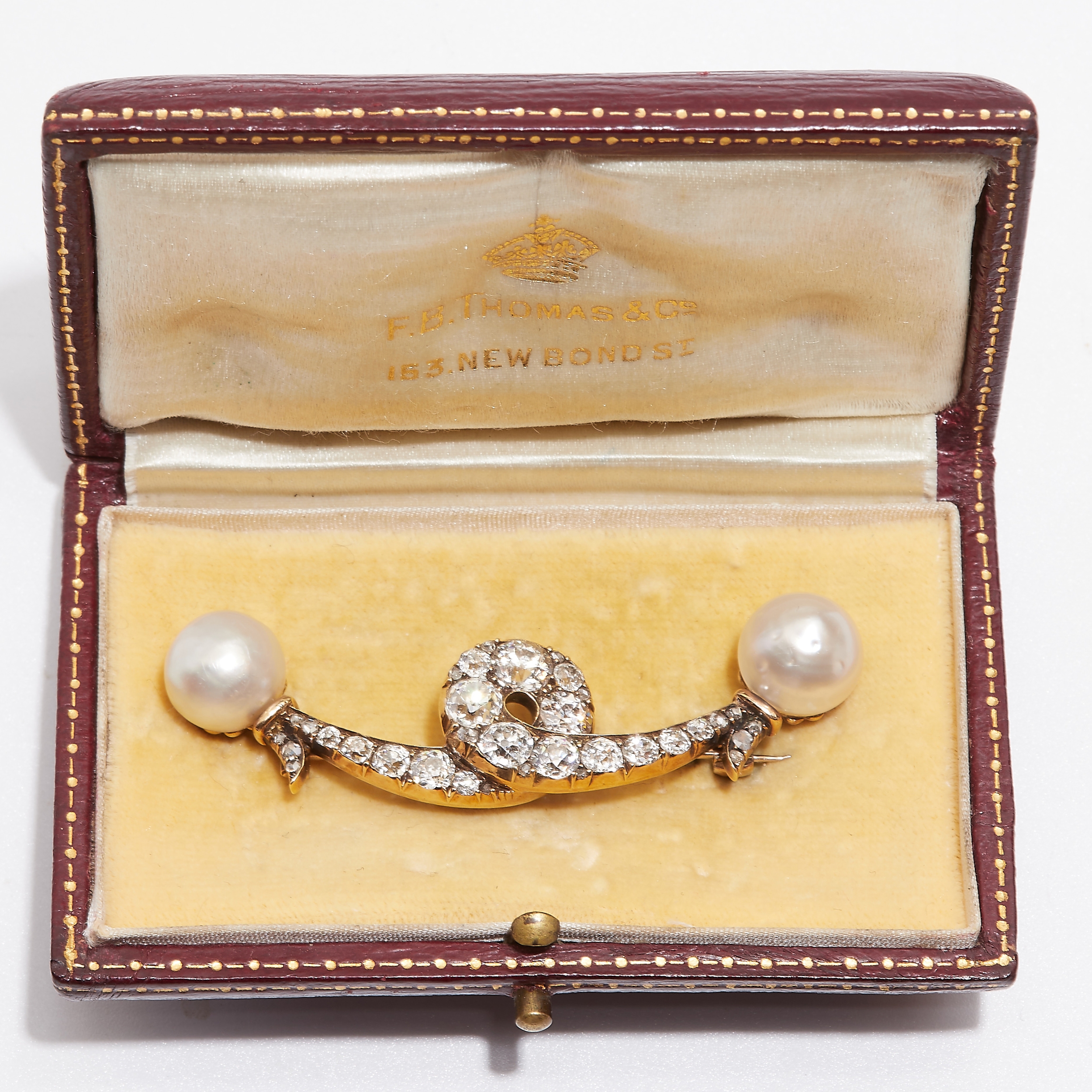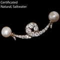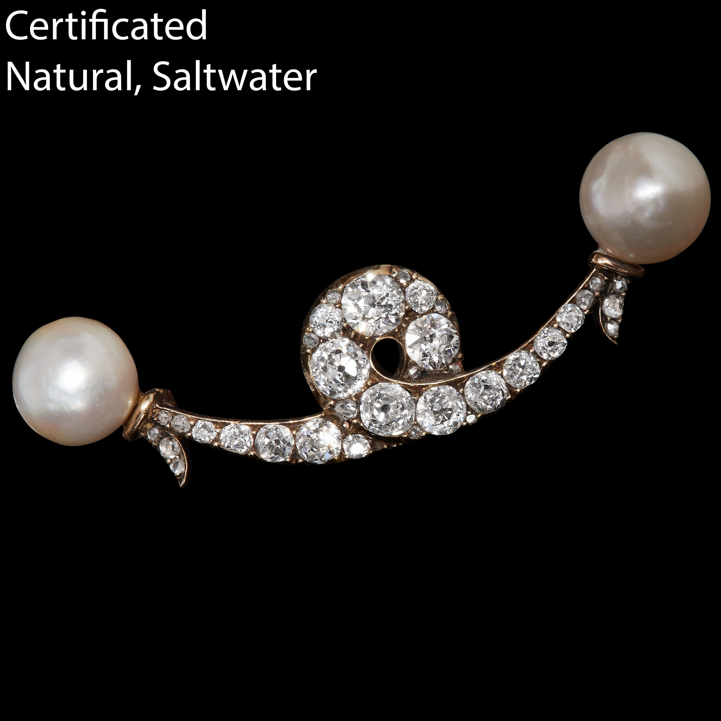 IMPRESSIVE TWO PEARL SET ON A BROOCH WITH DIAMONDS. set with two cream natural saltwater pearls with good Luste according to the report. Diameters of the pearls : 9.2- 9.4 x 7.4 mm approx. 9.5- 9.5 x 7.6 mm approx. set with diamonds totalling approx 2.45 ct. W: 5.3 cm. 8.3 grams. accompanied with gemmological certification services report. no: 5782-2657.