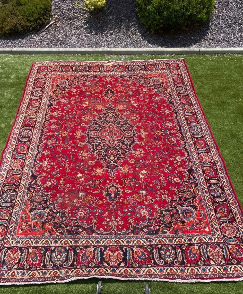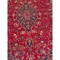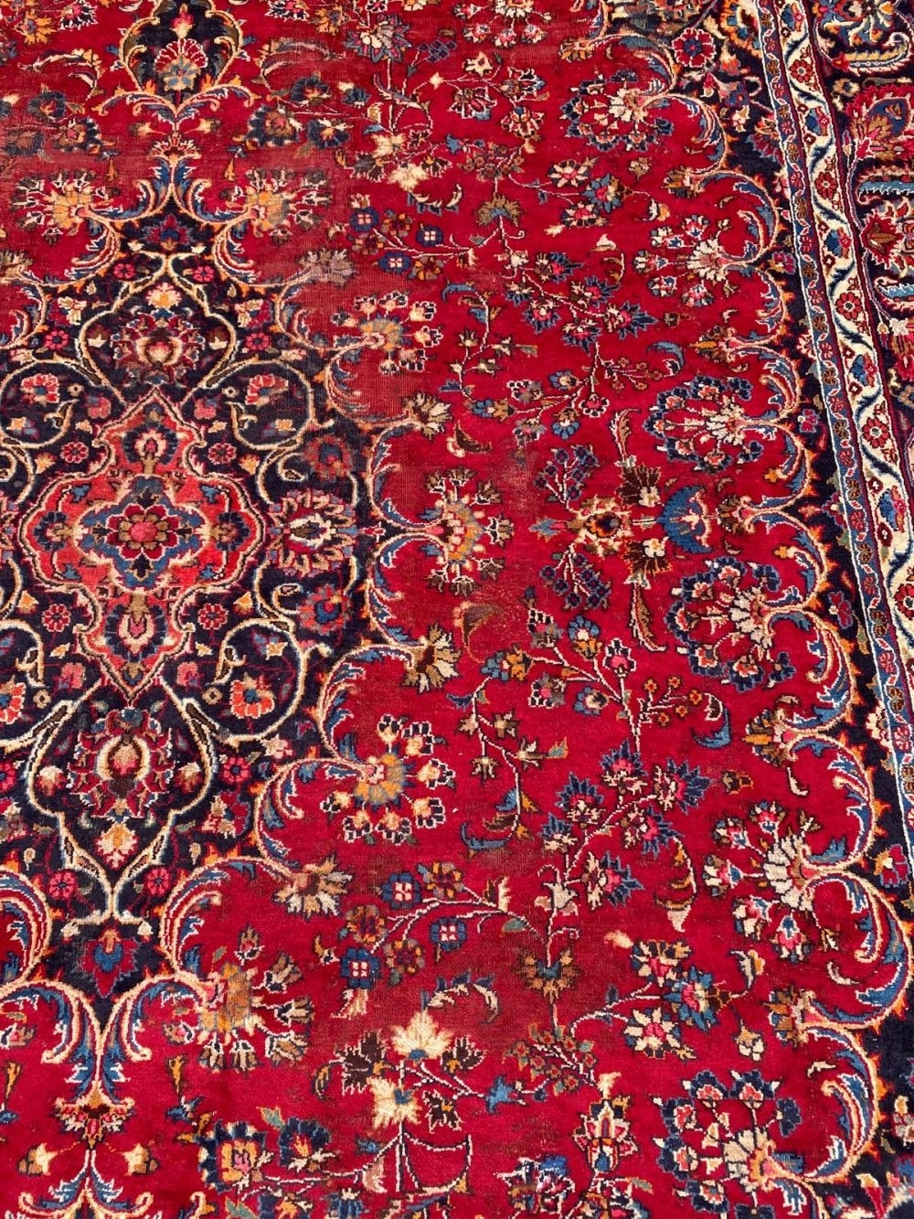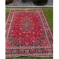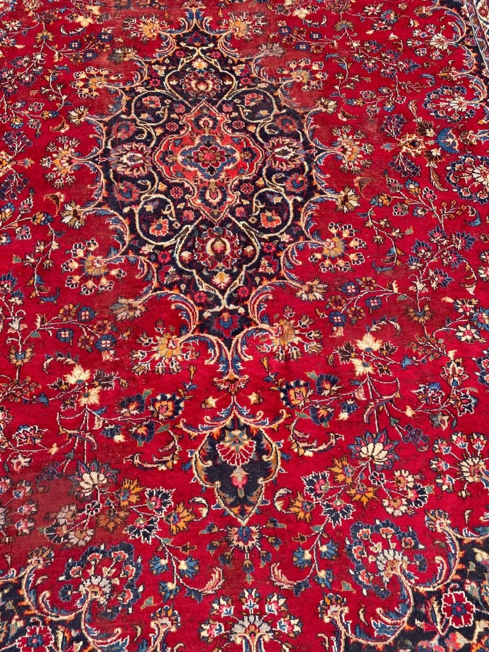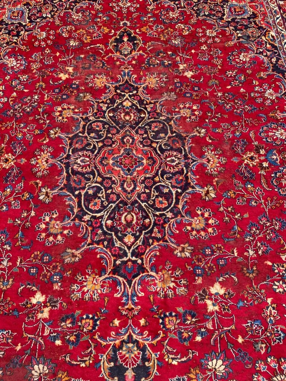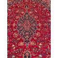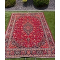 A VIBRANT PERSIAN KASHAN RUG, hand knotted, high knot density, dyed using natural vegetable dyes. In traditional Kashan design with central medallion surrounded by multiple intricate borders. In vibrant red, blue and ivory tones. Dimensions: 390cm x 290cm approx.