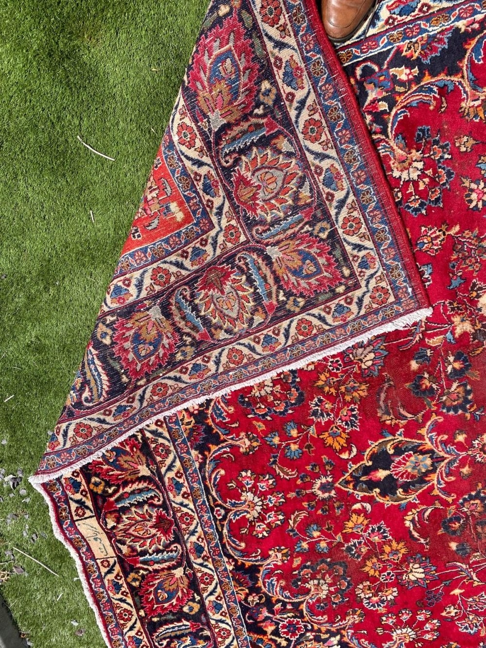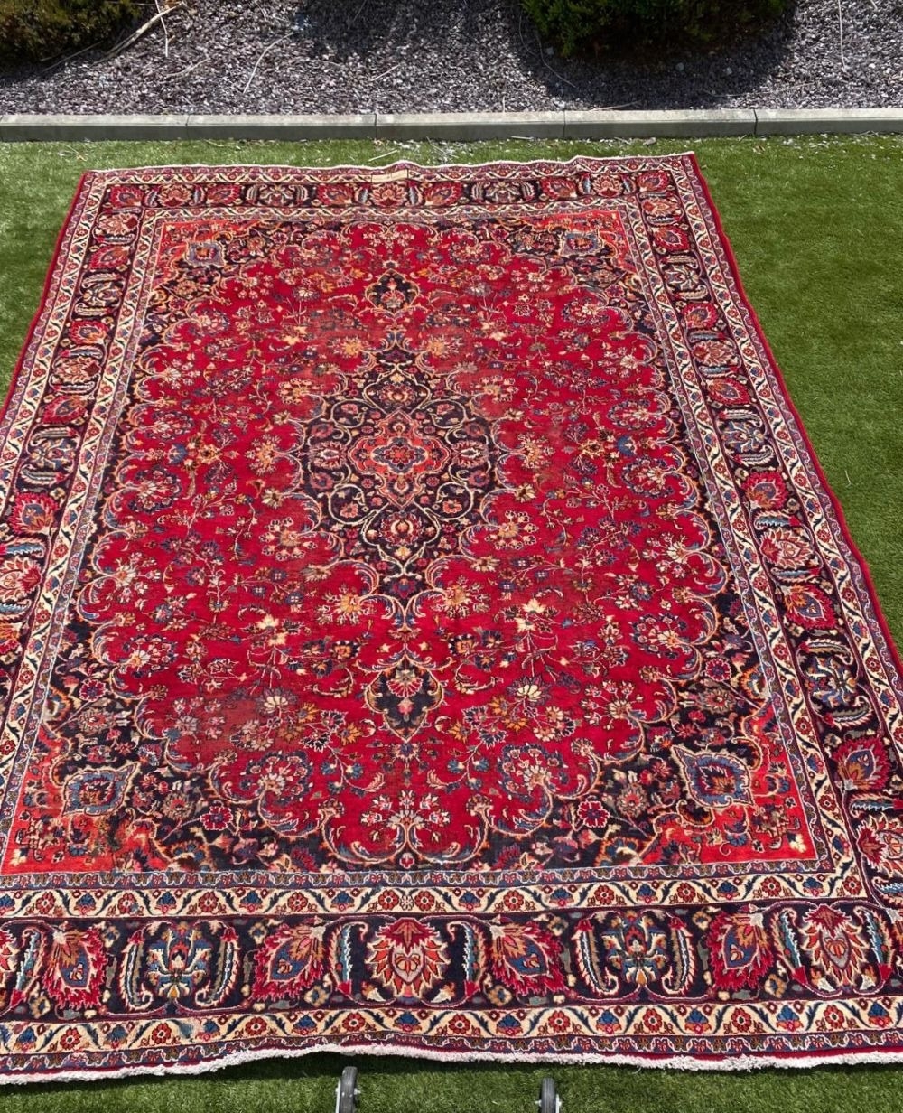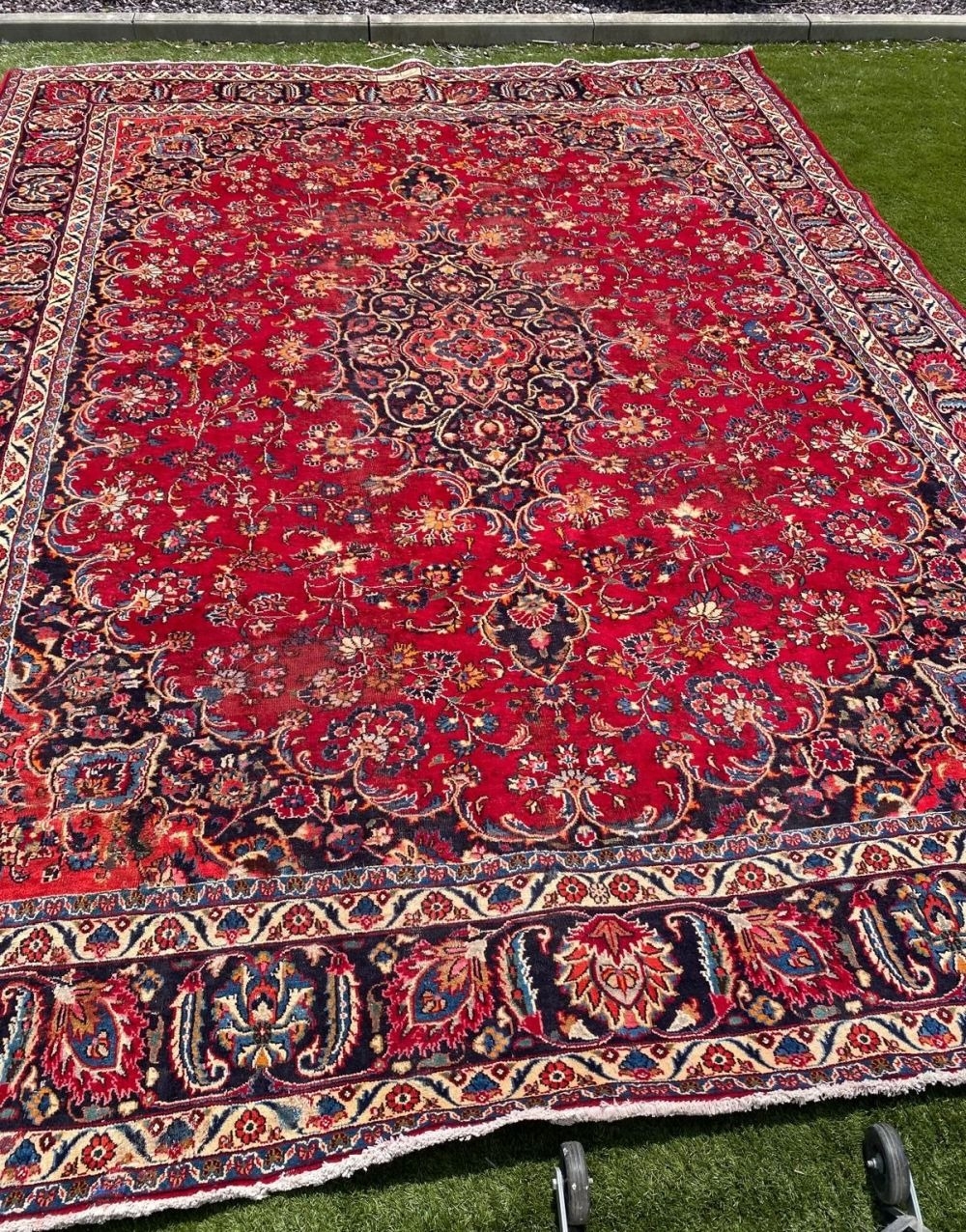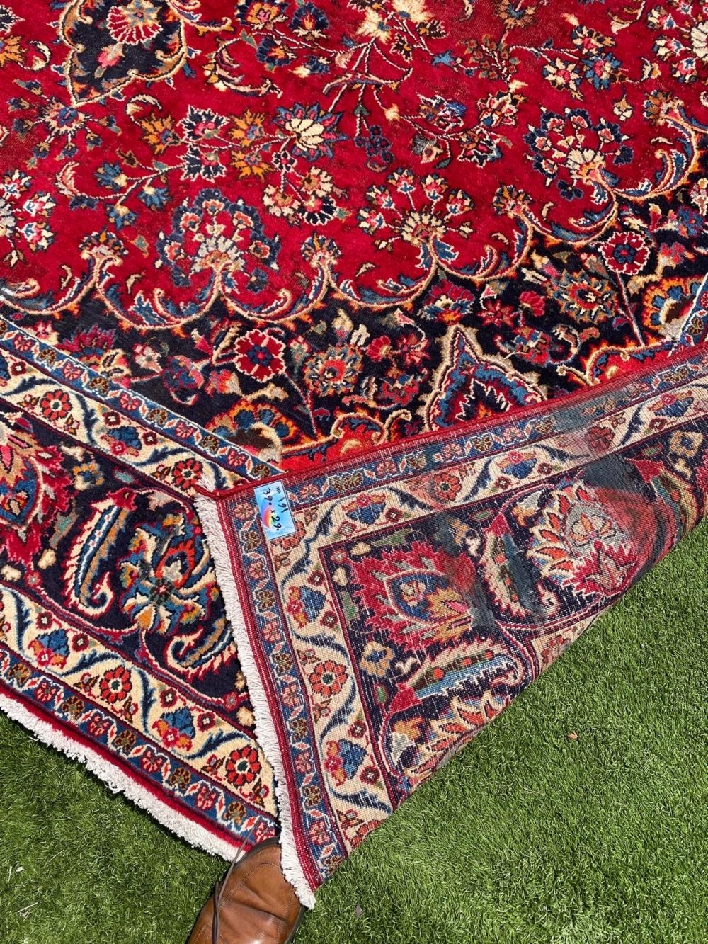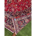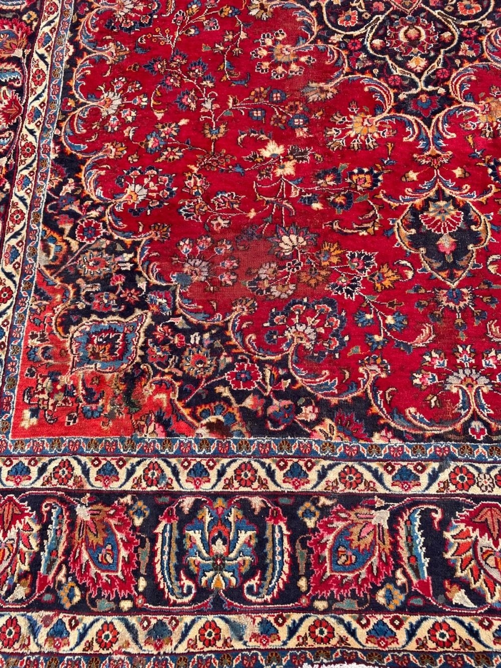 A VIBRANT PERSIAN KASHAN RUG, hand knotted, high knot density, dyed using natural vegetable dyes. In traditional Kashan design with central medallion surrounded by multiple intricate borders. In vibrant red, blue and ivory tones. Dimensions: 390cm x 290cm approx.