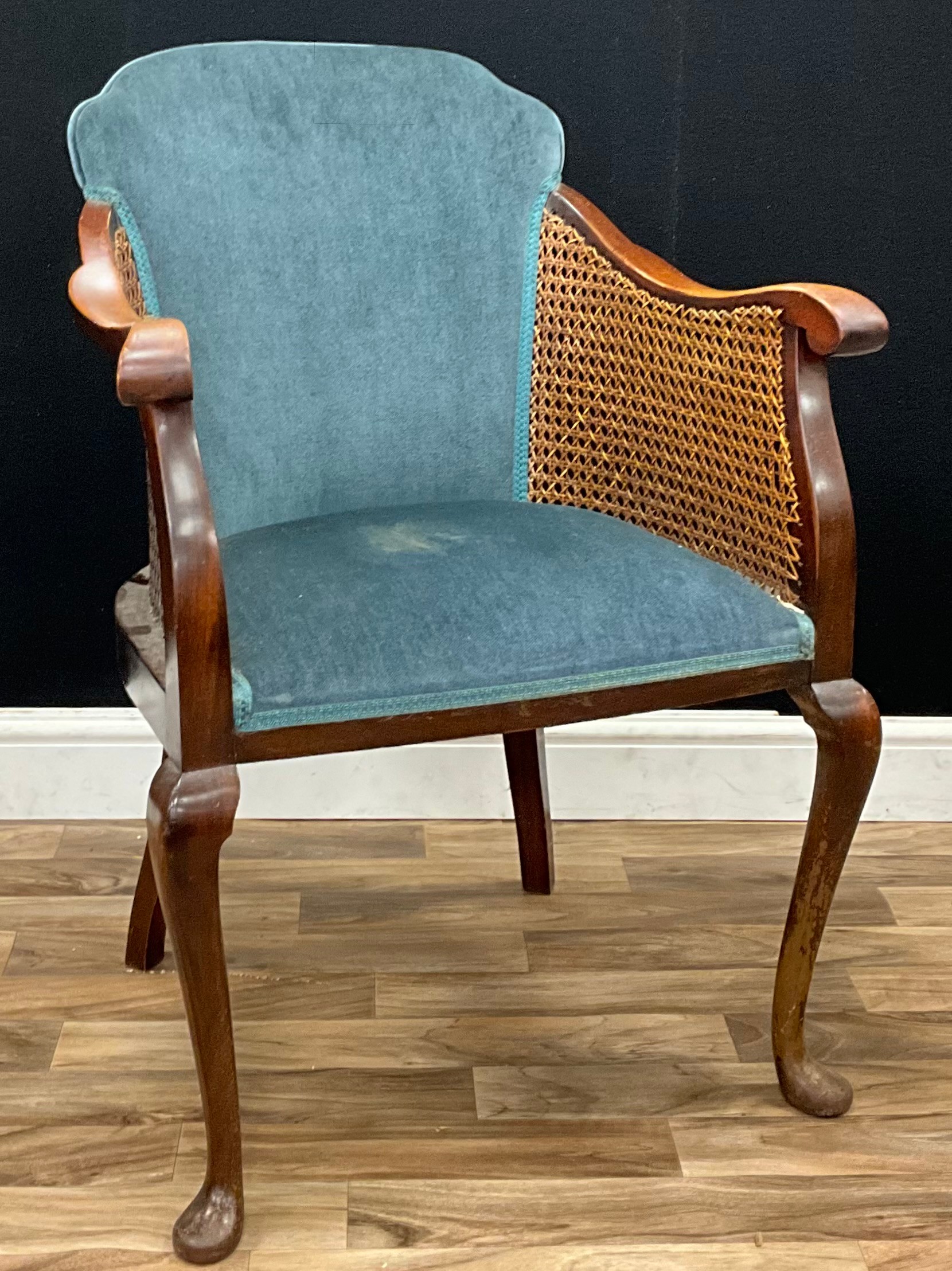 An early 20th century mahogany elbow chair, fabric seat and backrest, caned rattan armrest supports, cabriole legs, 86cm high, 61cm wide, 43cm seat depth