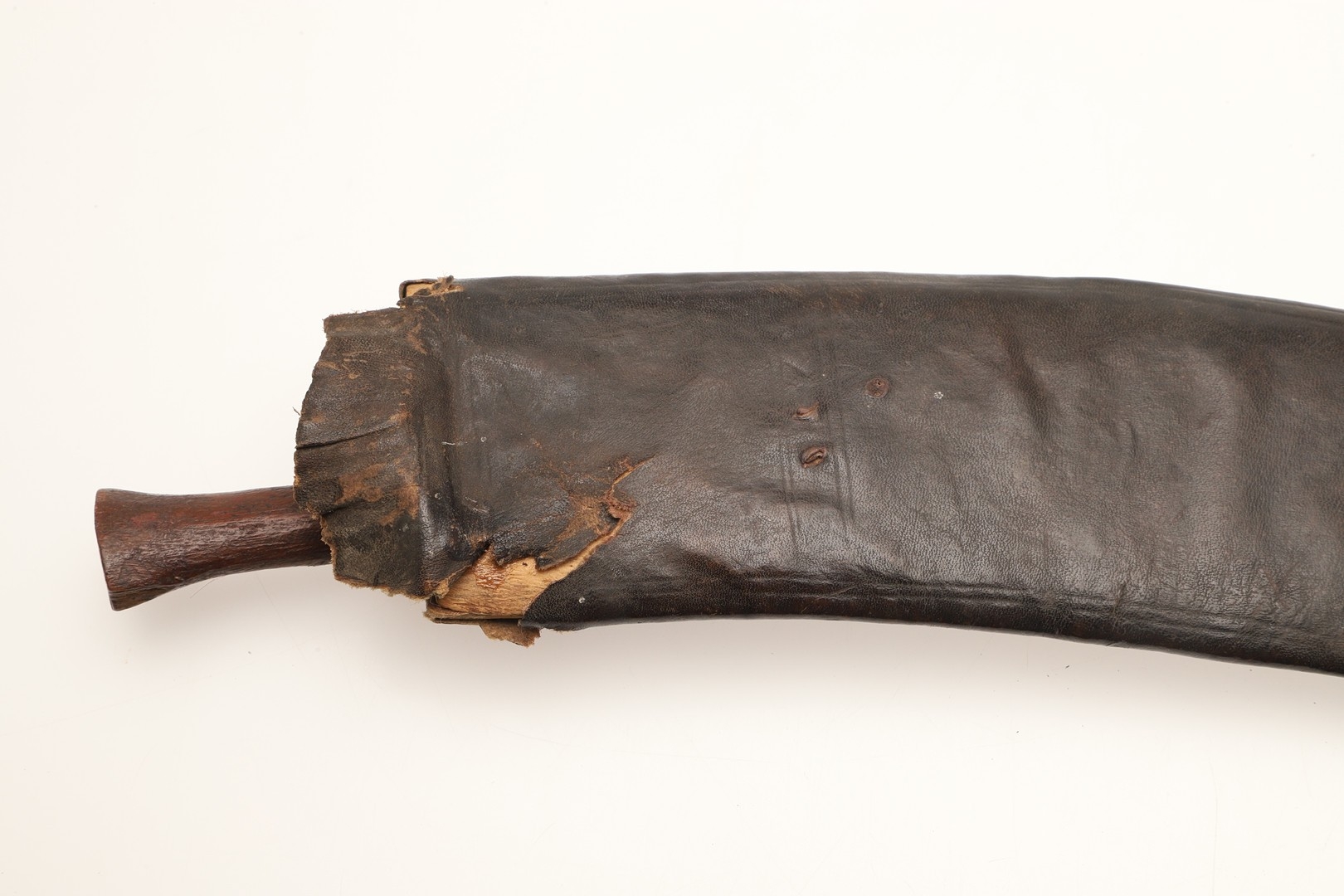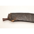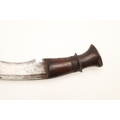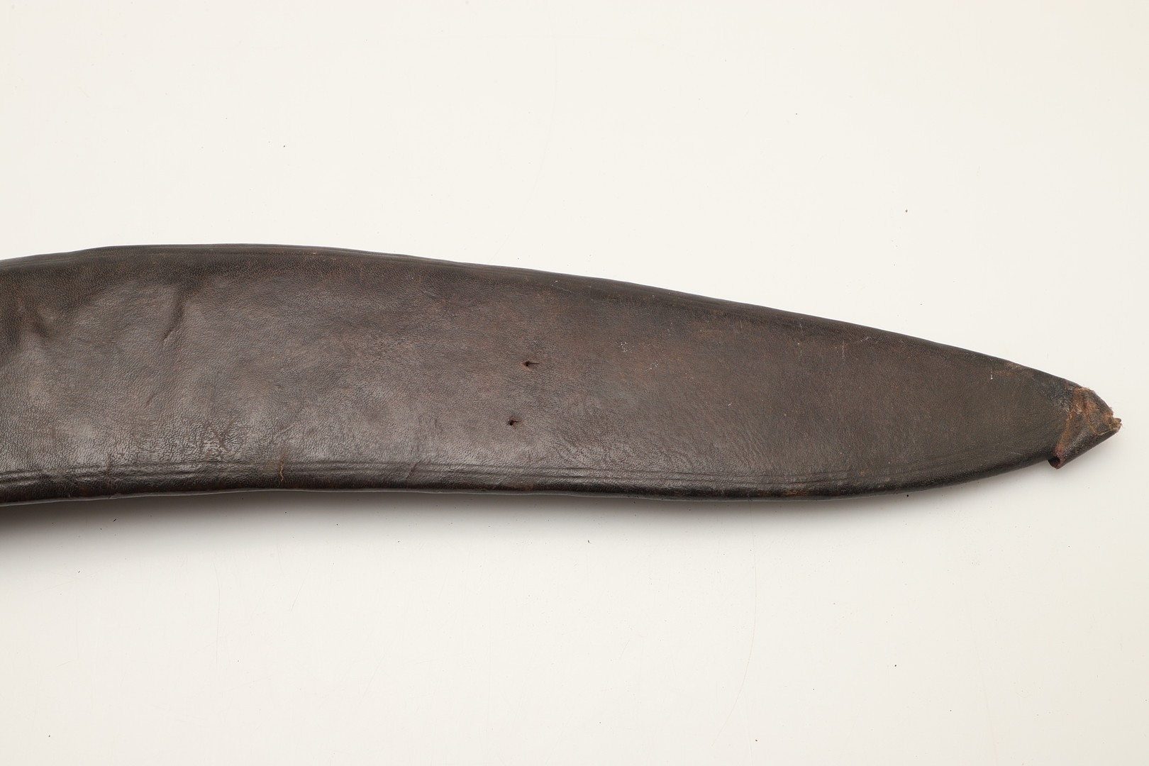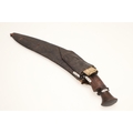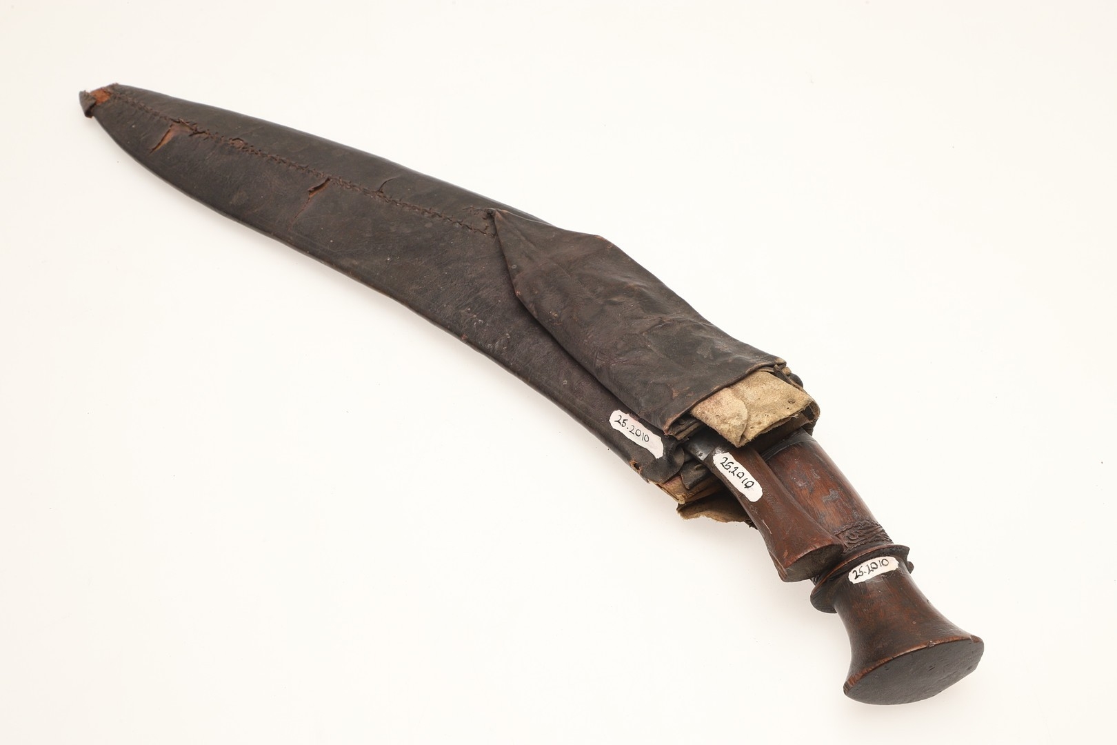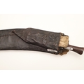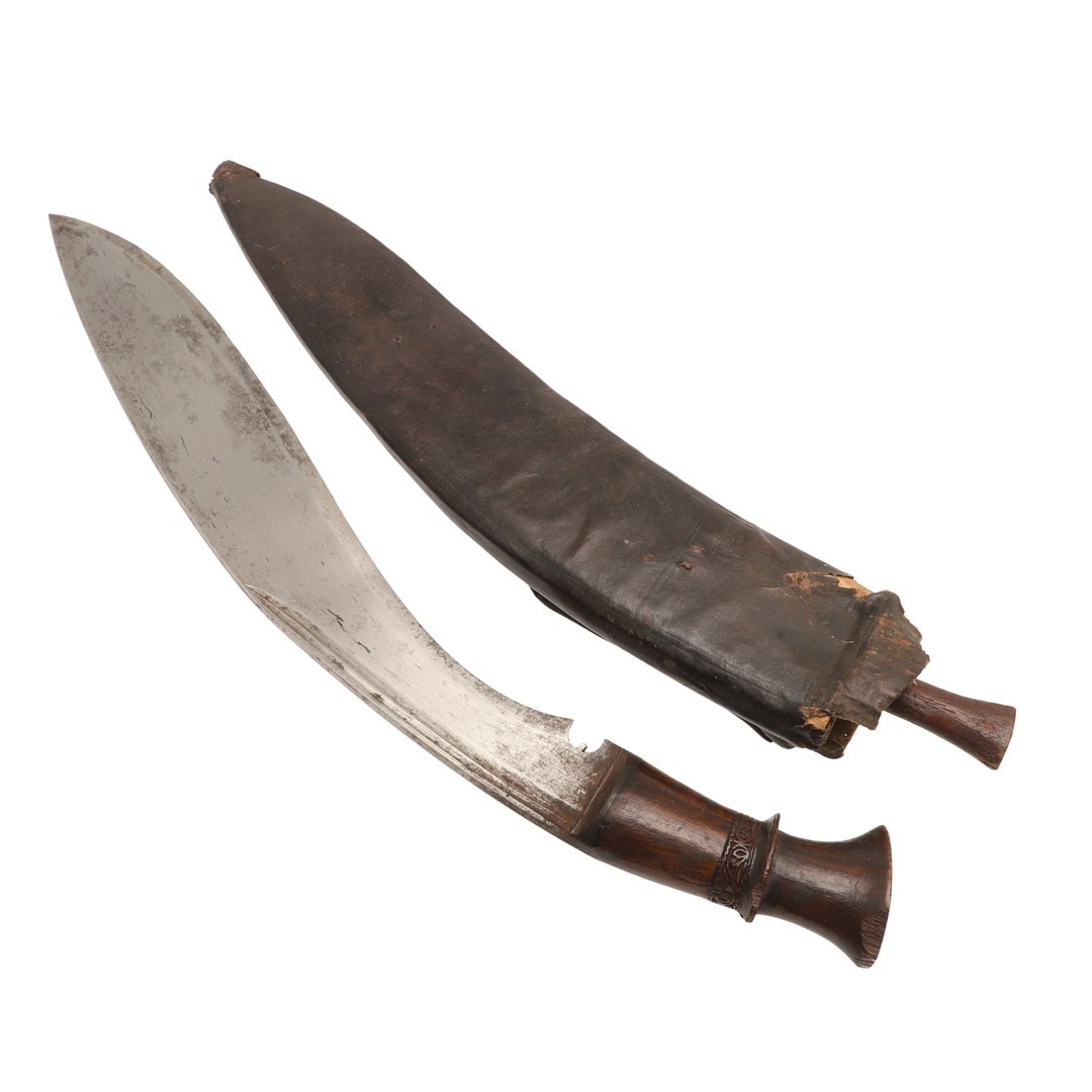 A NEPALESE KUKRI AND SCABBARD. The 36 cm long traditionally shaped blade with sharpened edge. On a short wooden hilt with carved band. In a black leather scabbard and a single additional small knife. 45 cm.