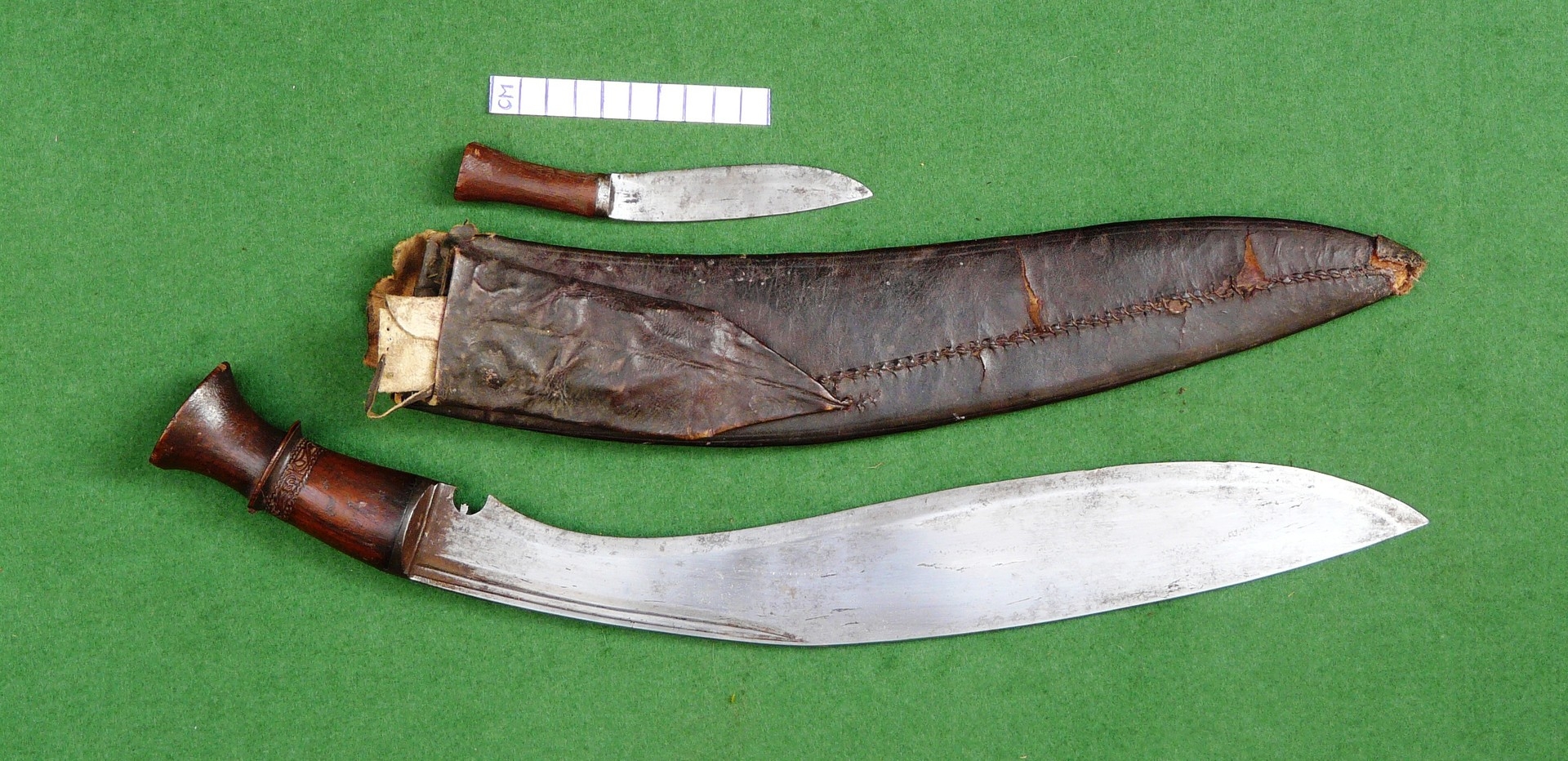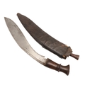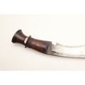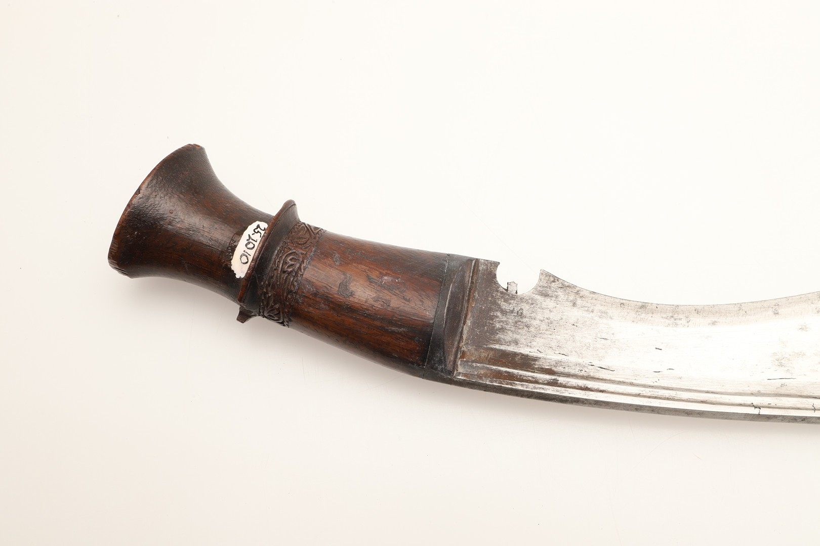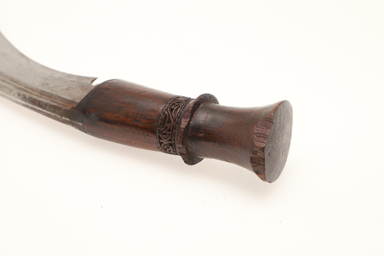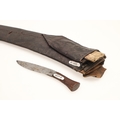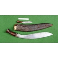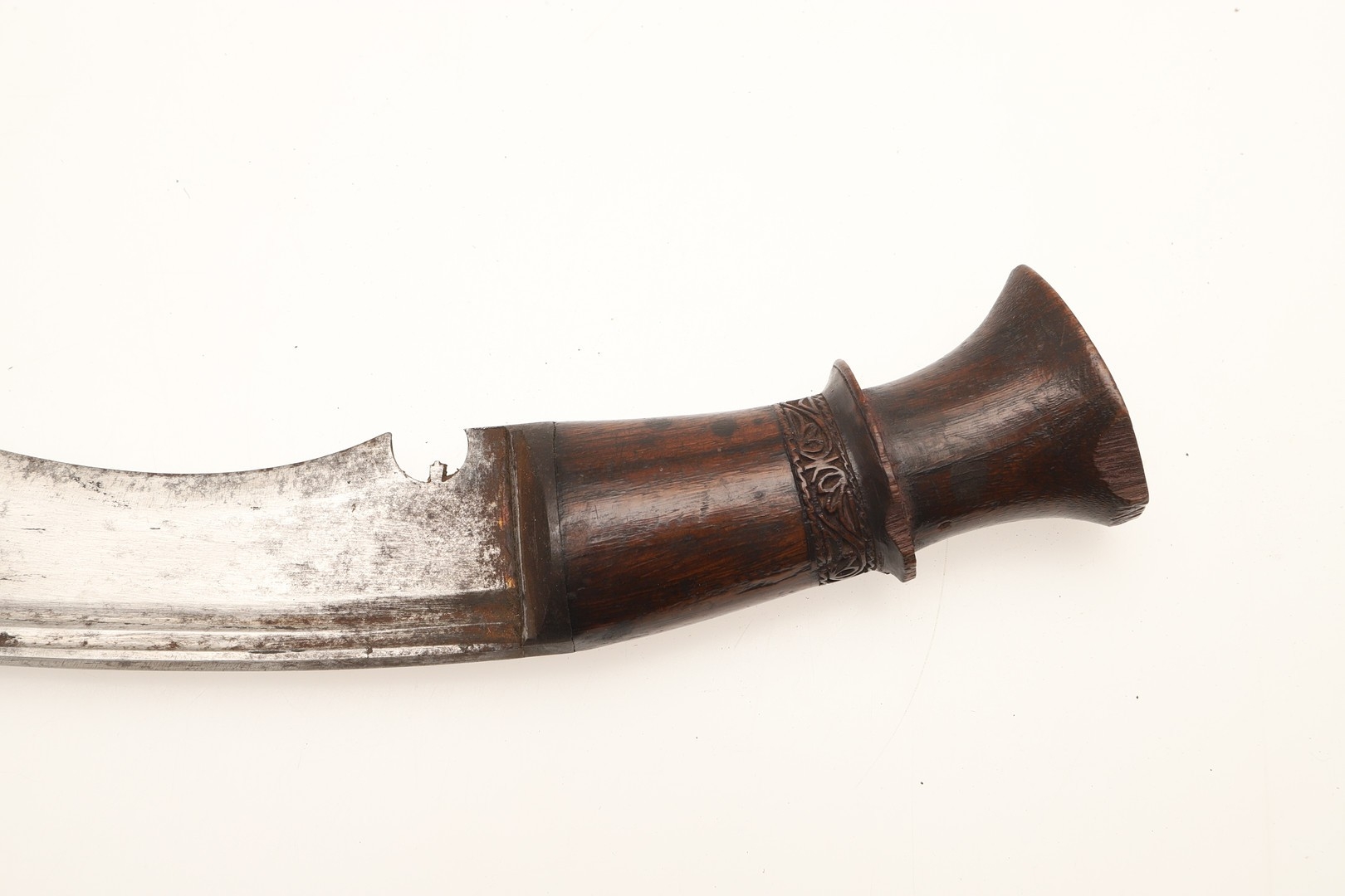 A NEPALESE KUKRI AND SCABBARD. The 36 cm long traditionally shaped blade with sharpened edge. On a short wooden hilt with carved band. In a black leather scabbard and a single additional small knife. 45 cm.