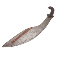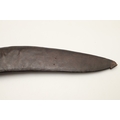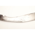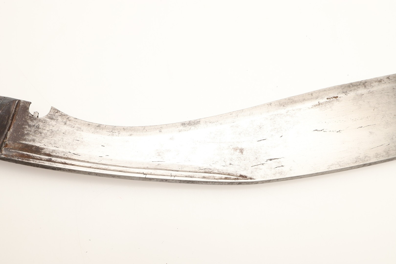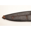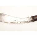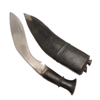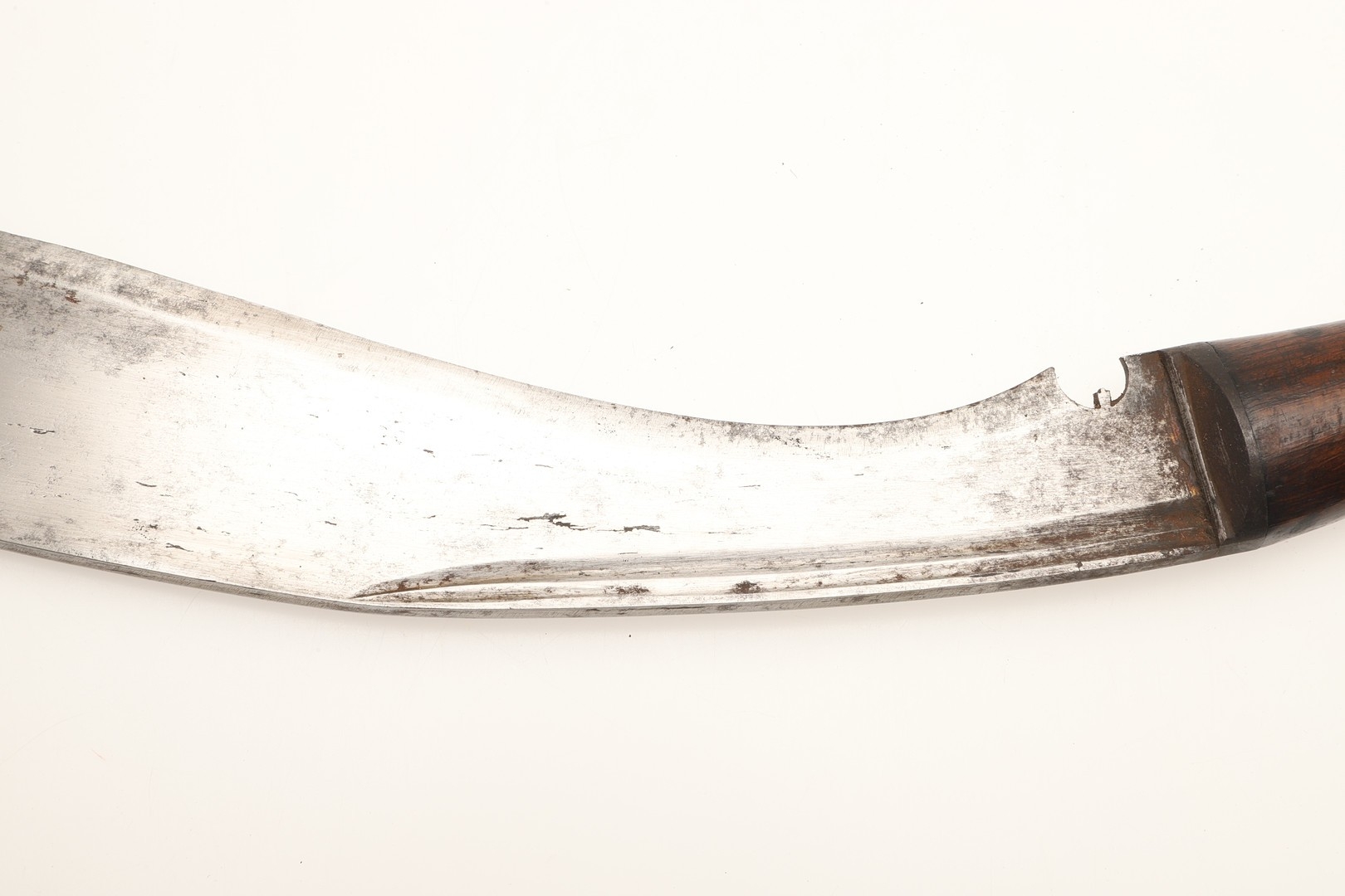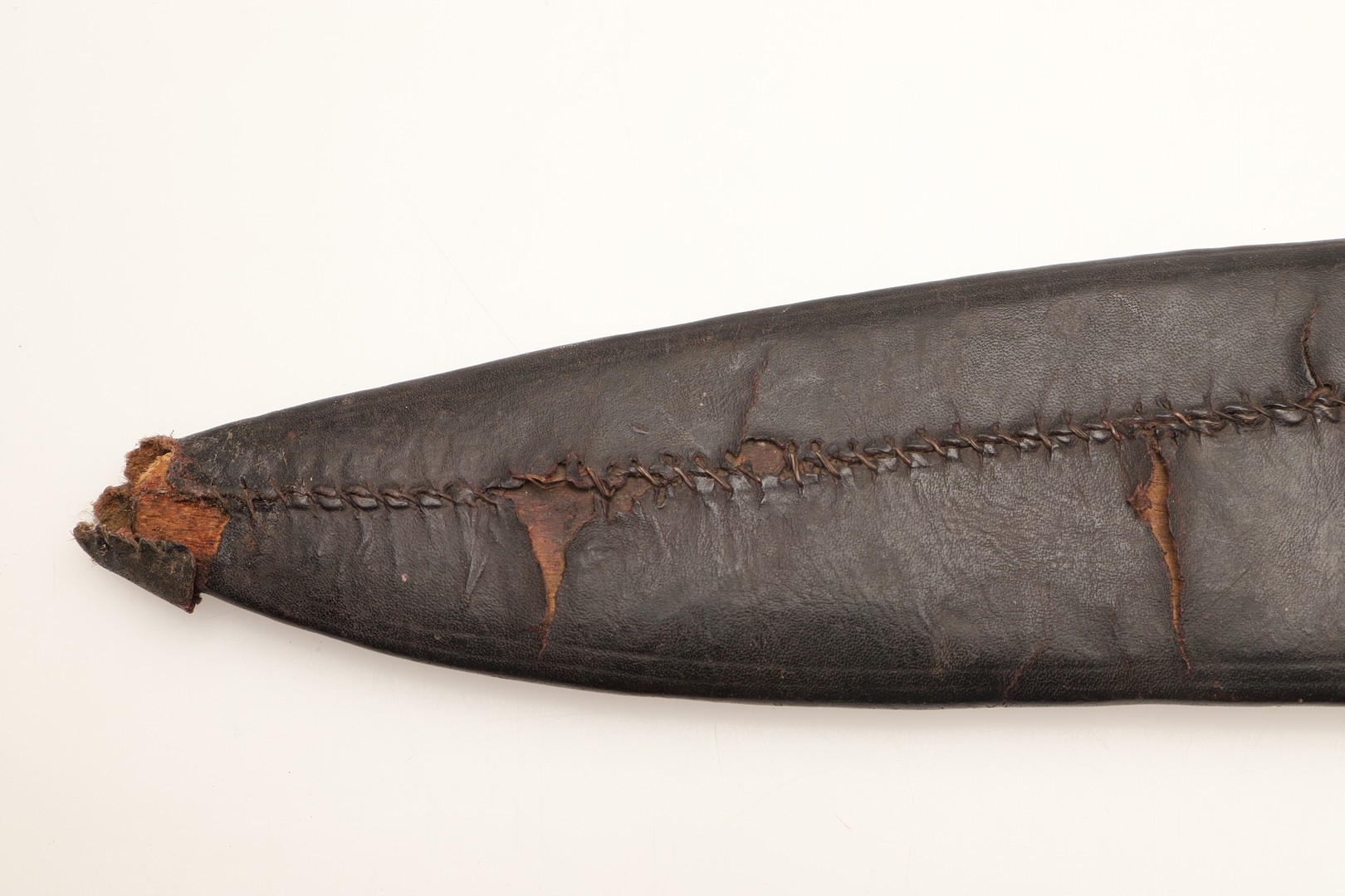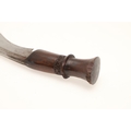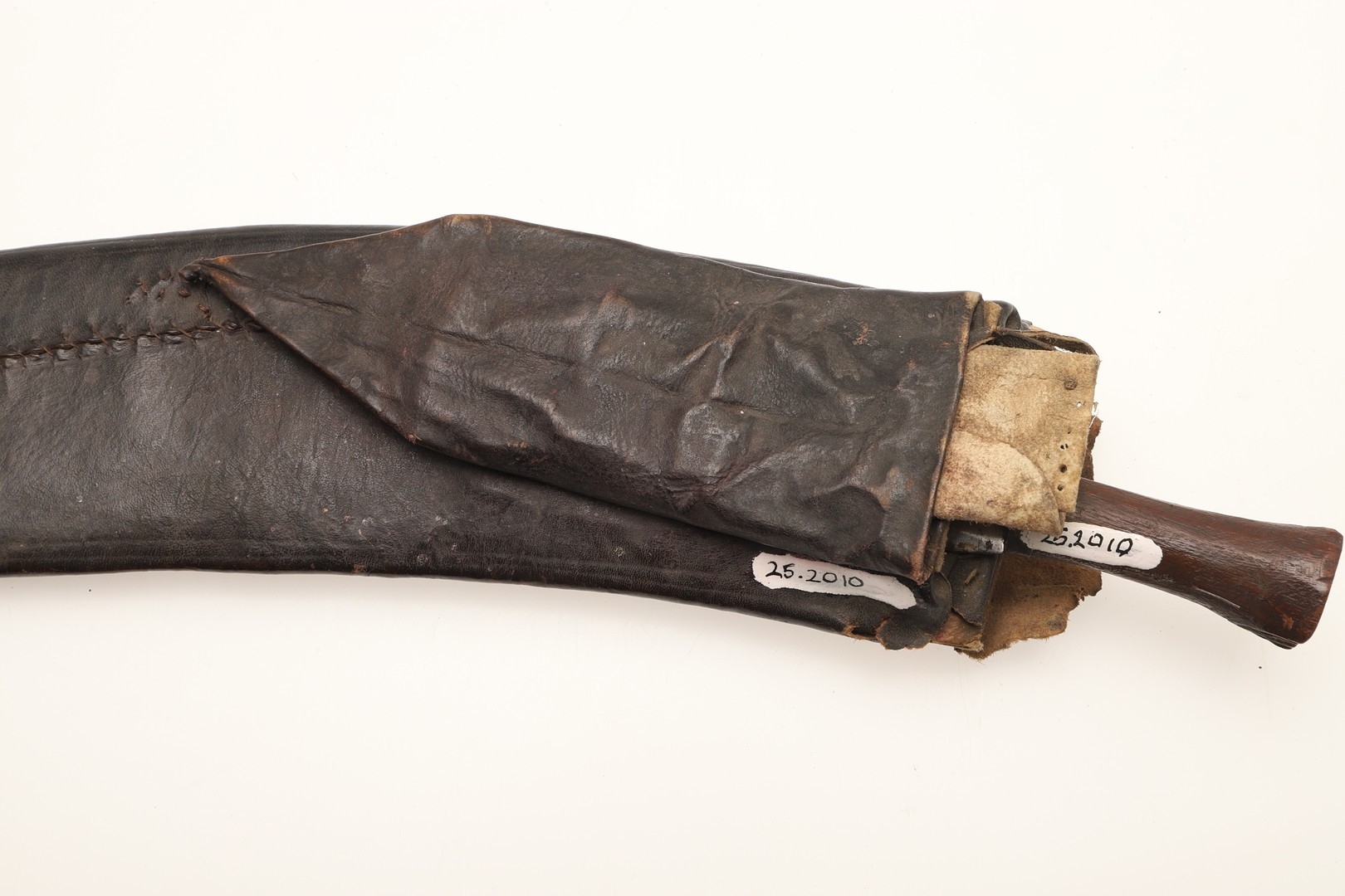 A NEPALESE KUKRI AND SCABBARD. The 36 cm long traditionally shaped blade with sharpened edge. On a short wooden hilt with carved band. In a black leather scabbard and a single additional small knife. 45 cm.