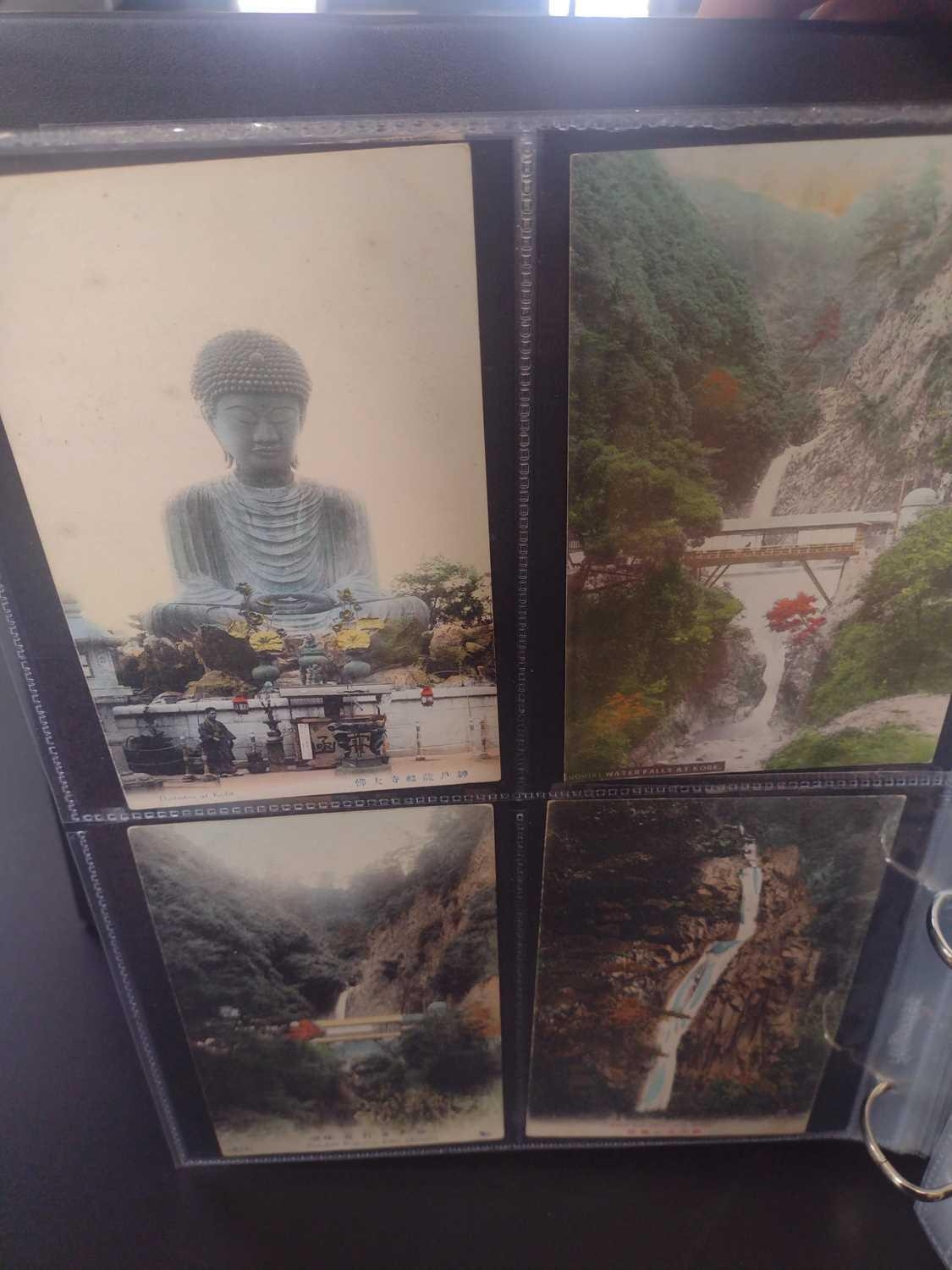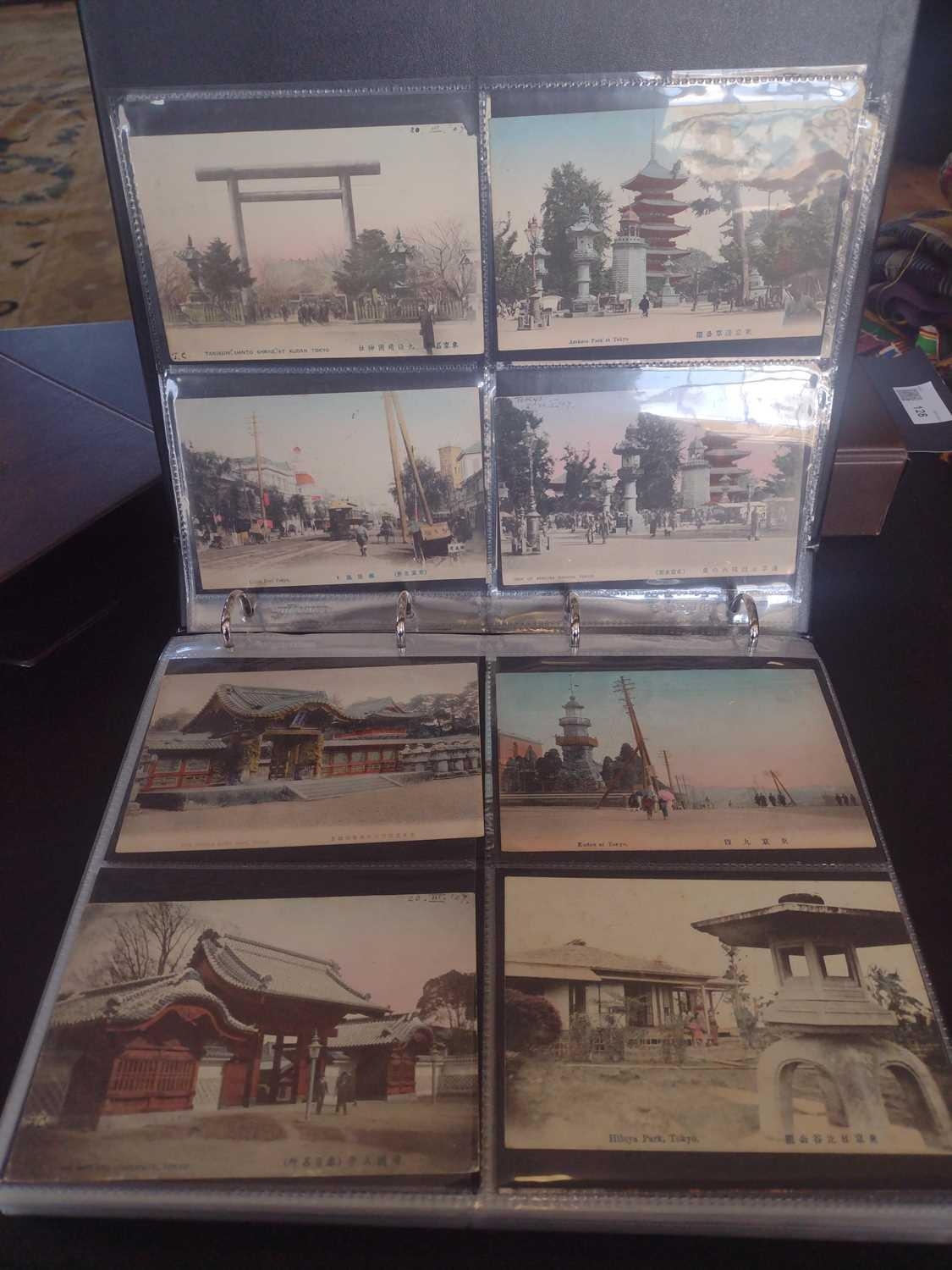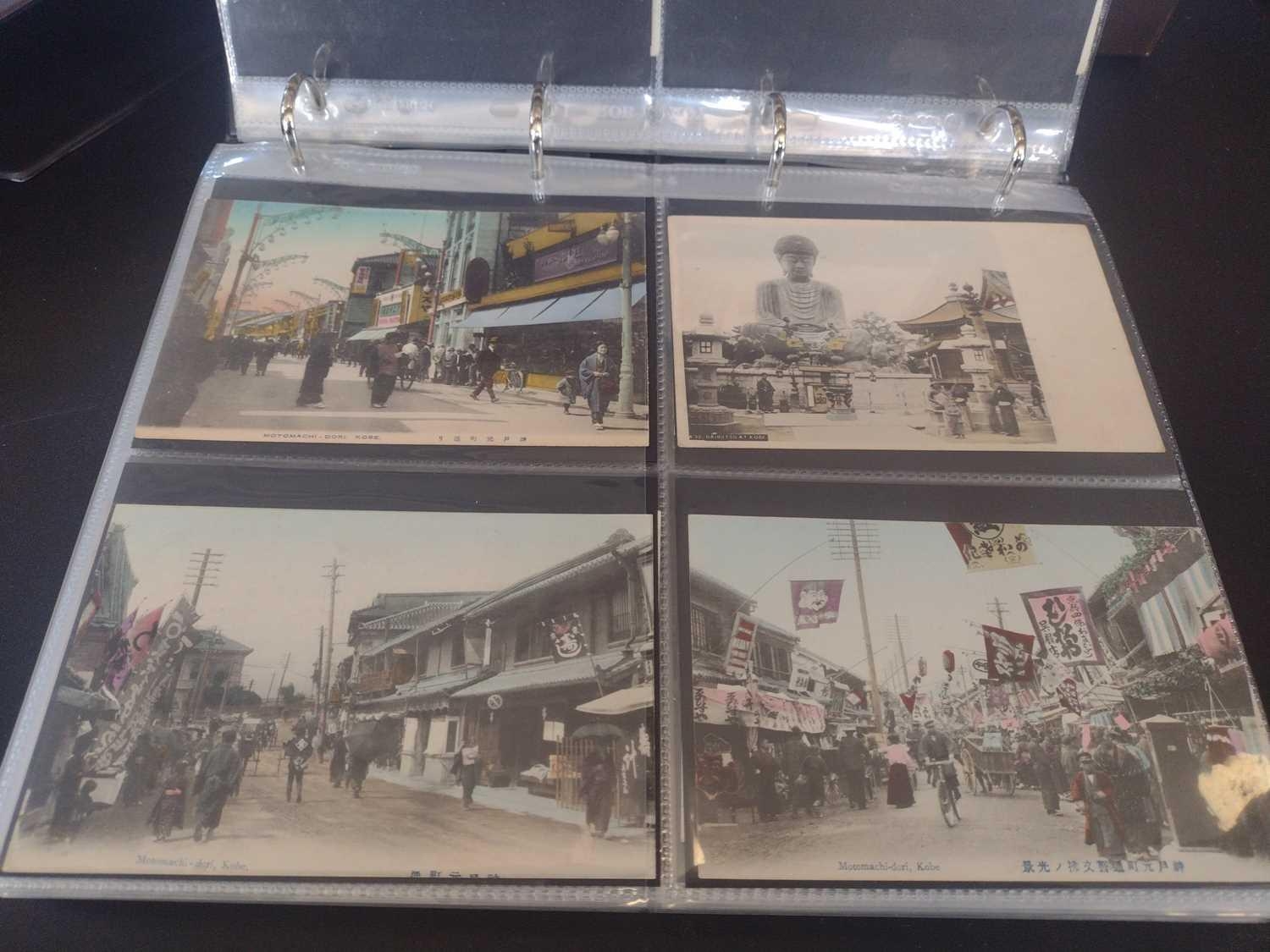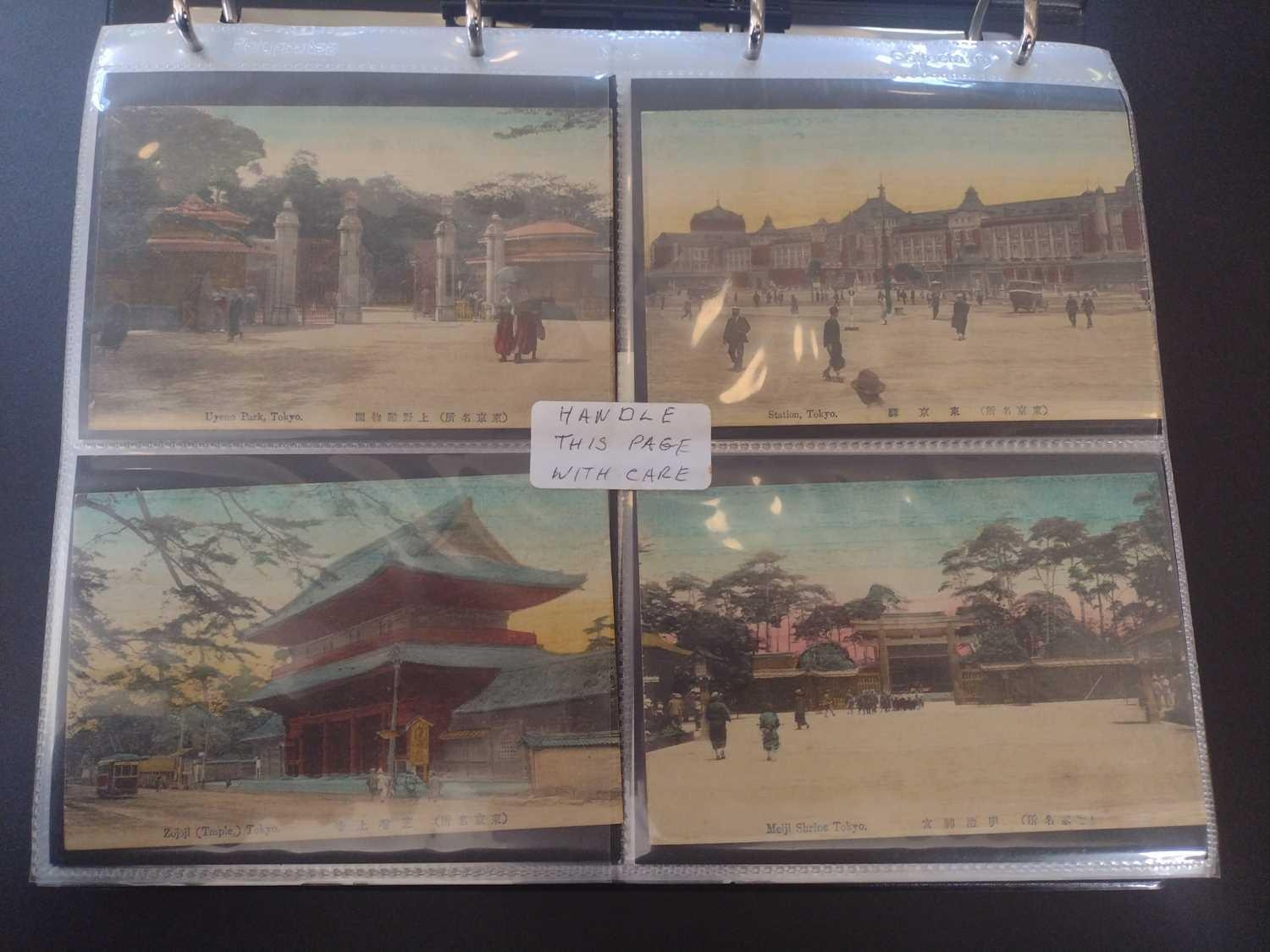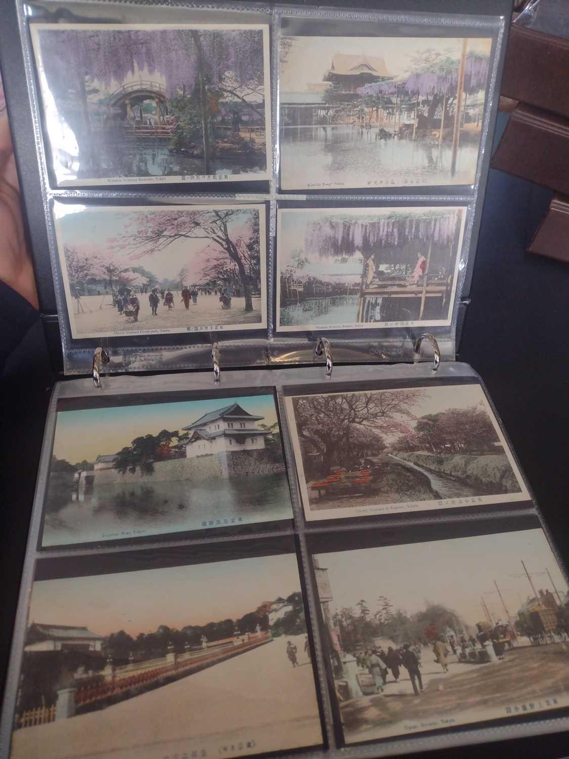 A collection of Japanese postcards, early 20th century. Two hundred and sixty seven Japanese postcards, mostly coloured, including scenes from Tokyo, Kobe, Kyoto, Nikko and Kamakura, etc, in a brown leather contemporary album. (267)