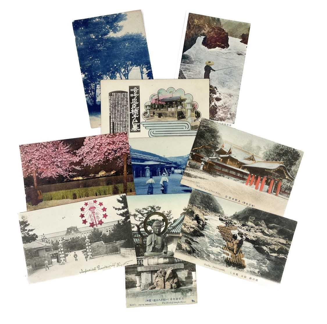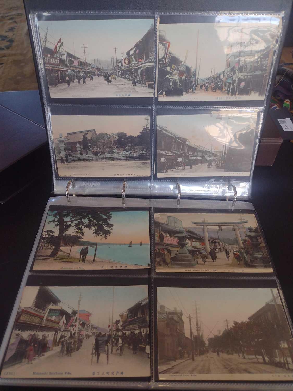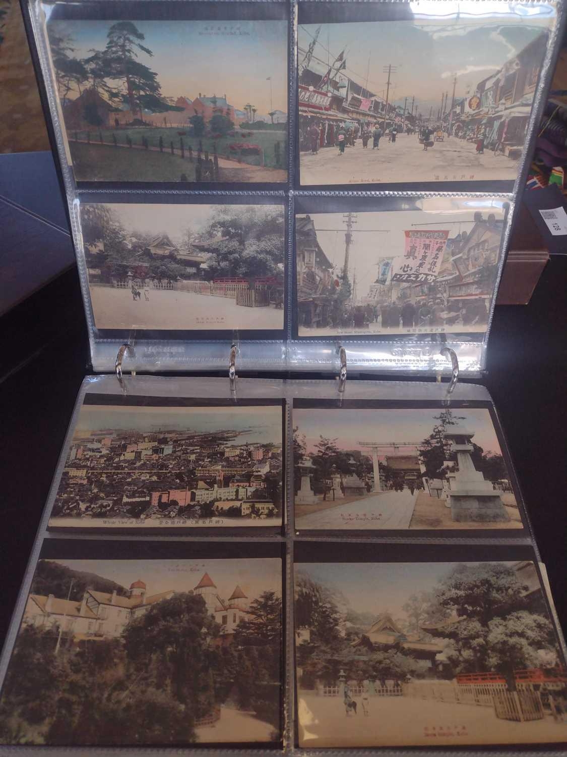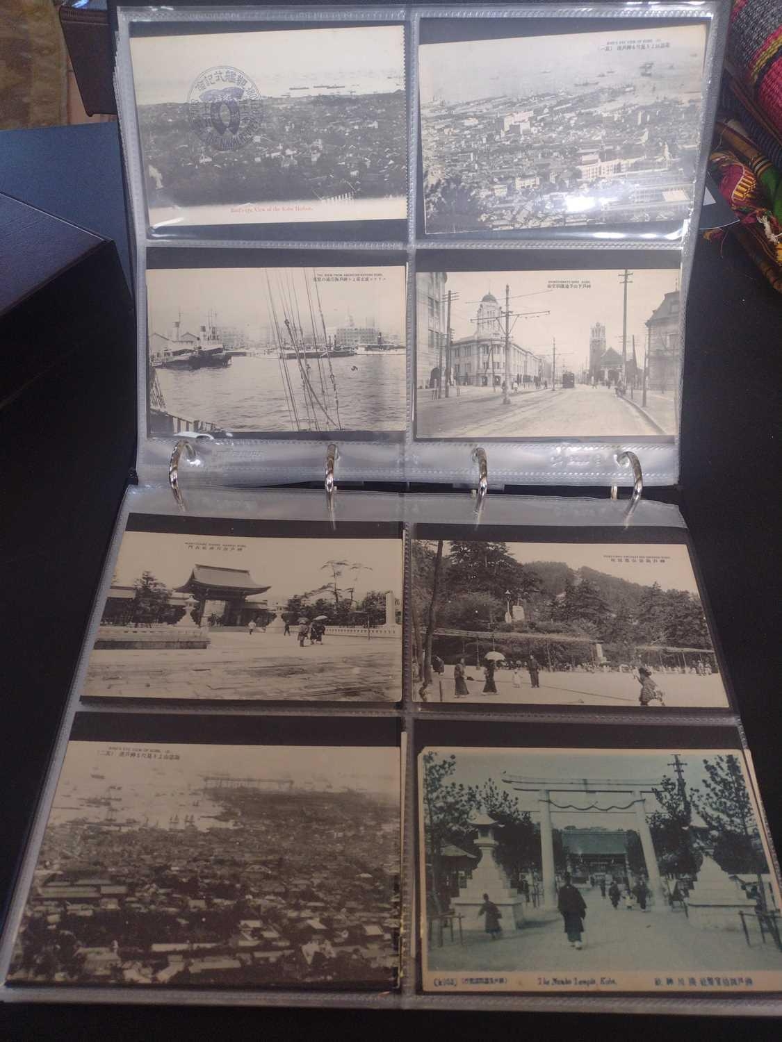 A collection of Japanese postcards, early 20th century. Two hundred and sixty seven Japanese postcards, mostly coloured, including scenes from Tokyo, Kobe, Kyoto, Nikko and Kamakura, etc, in a brown leather contemporary album. (267)