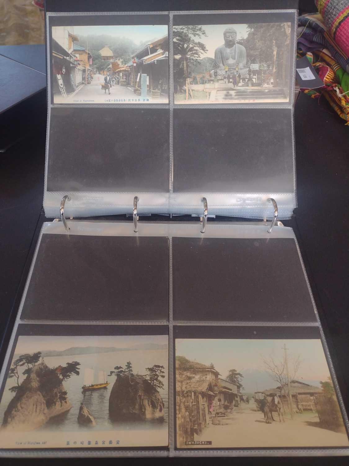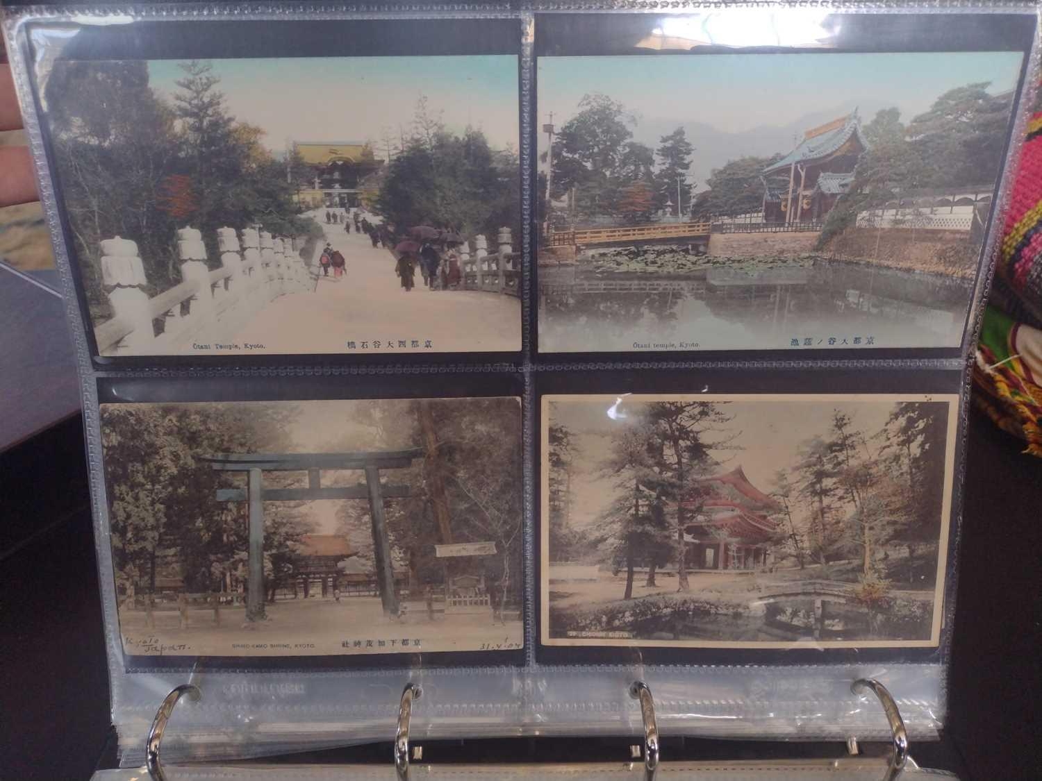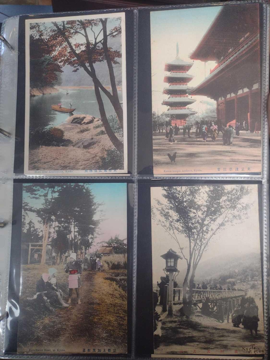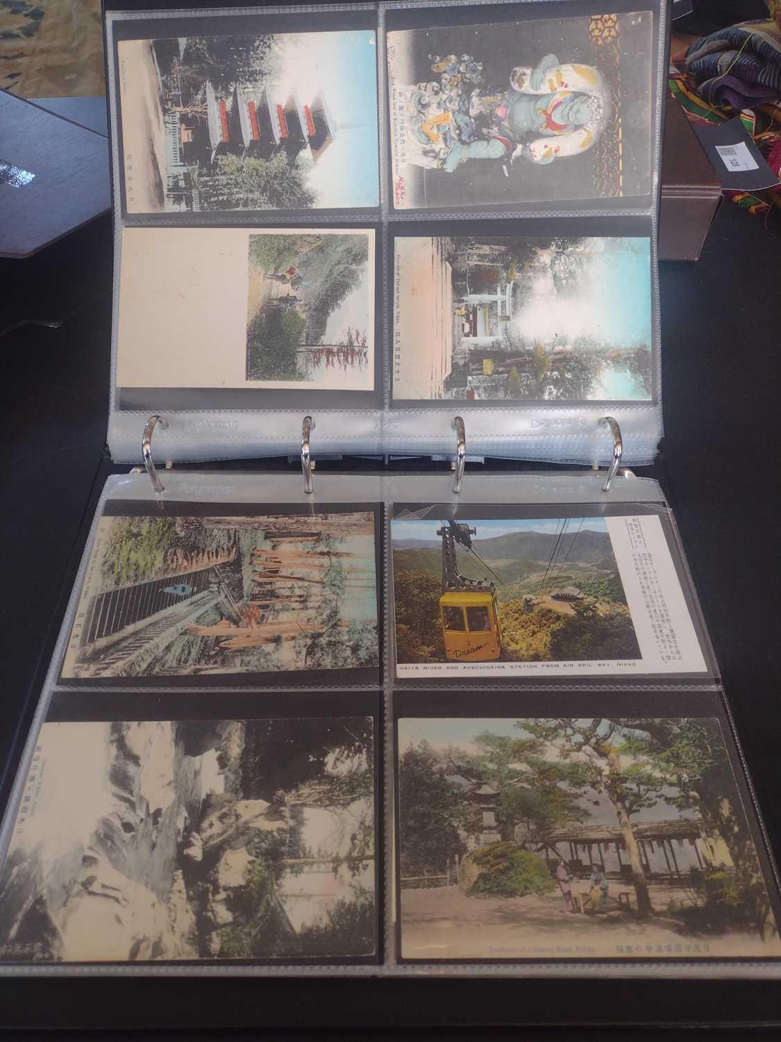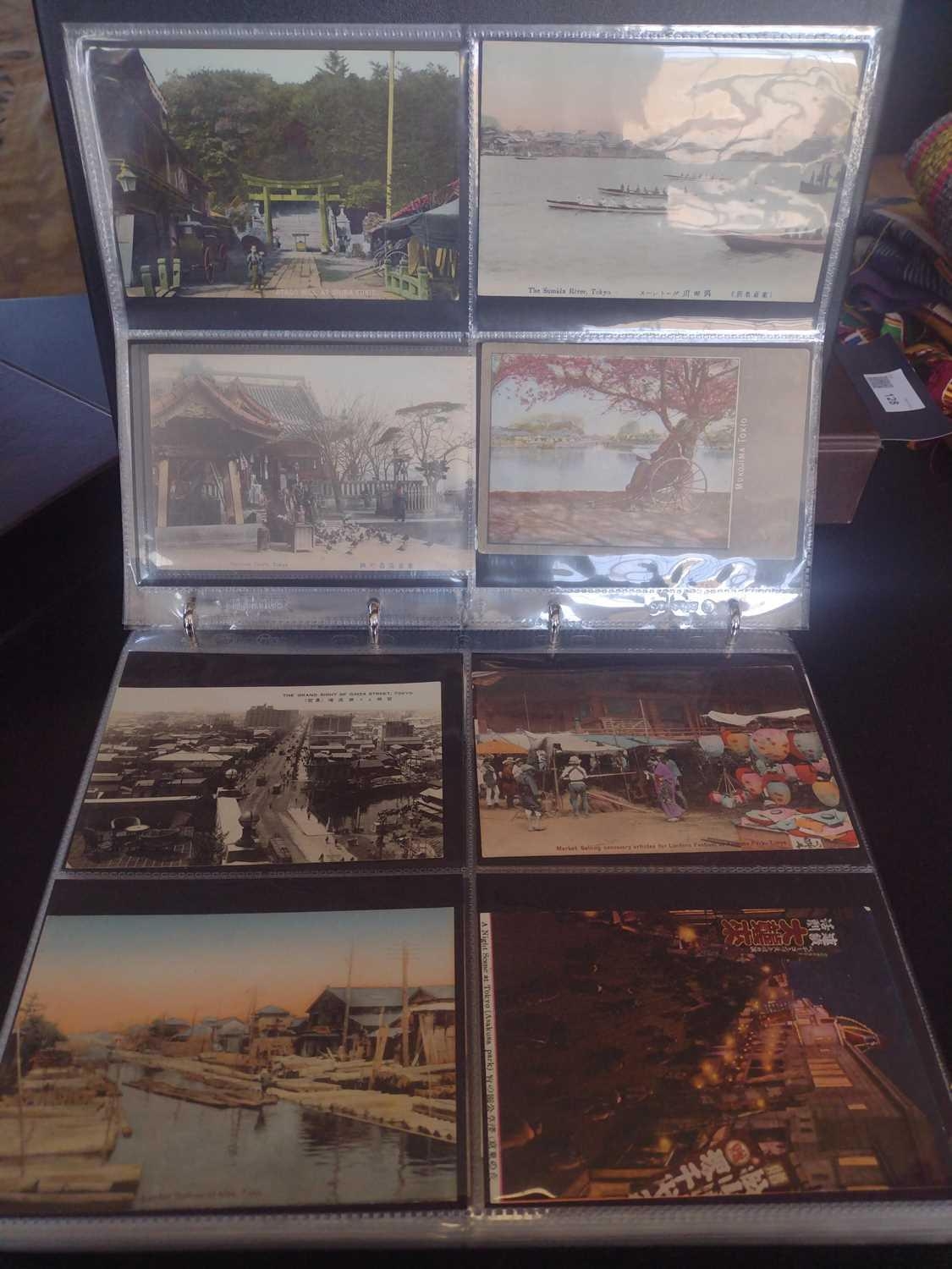 A collection of Japanese postcards, early 20th century. Two hundred and sixty seven Japanese postcards, mostly coloured, including scenes from Tokyo, Kobe, Kyoto, Nikko and Kamakura, etc, in a brown leather contemporary album. (267)