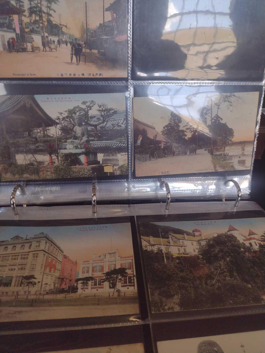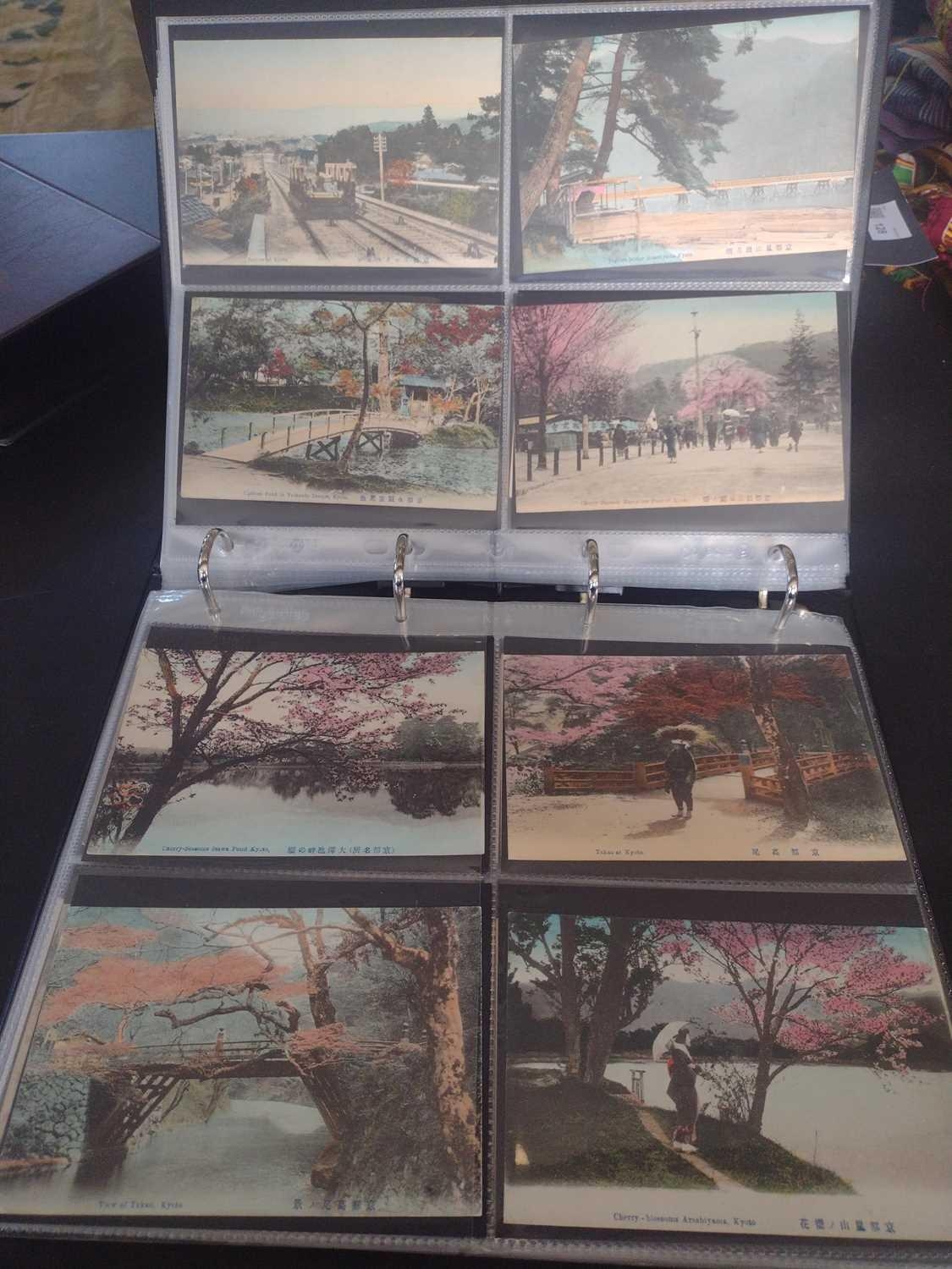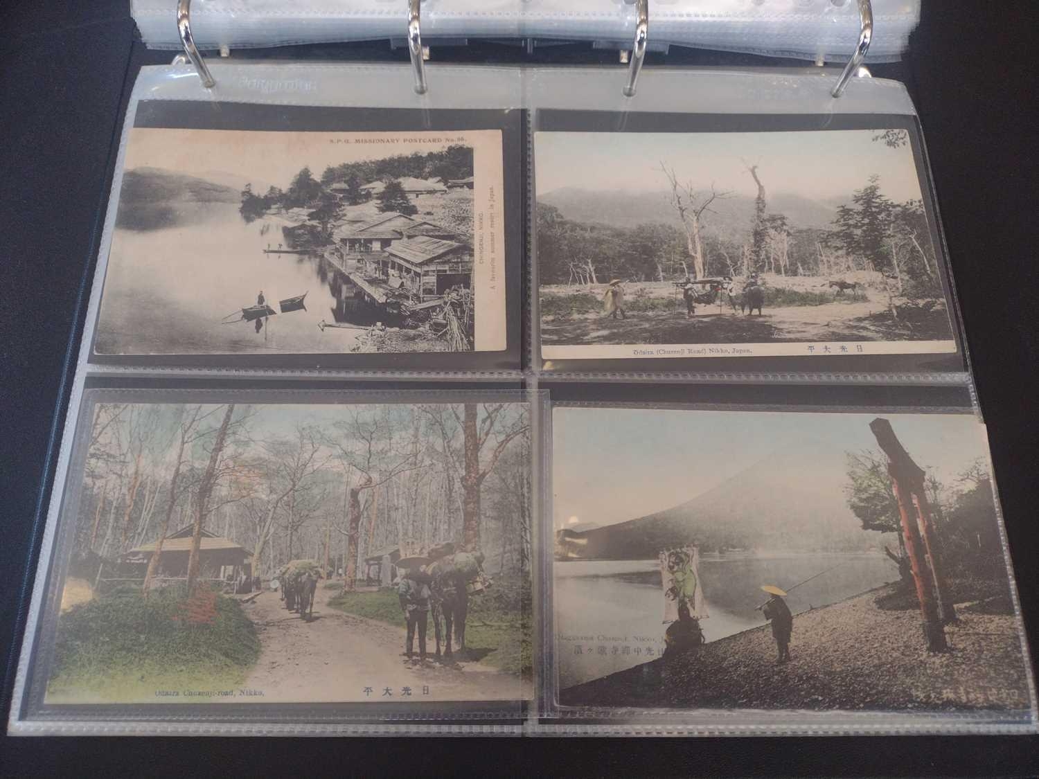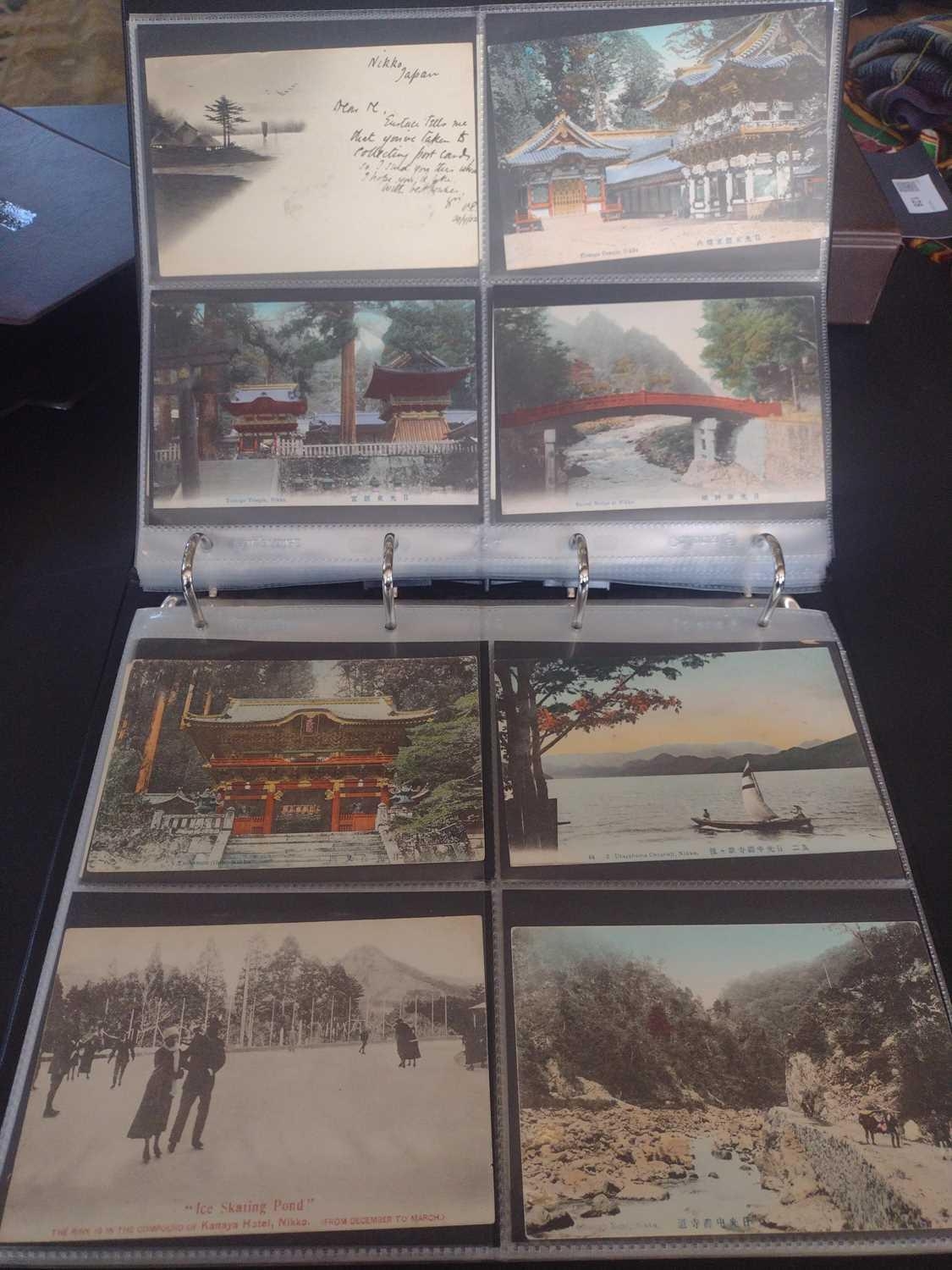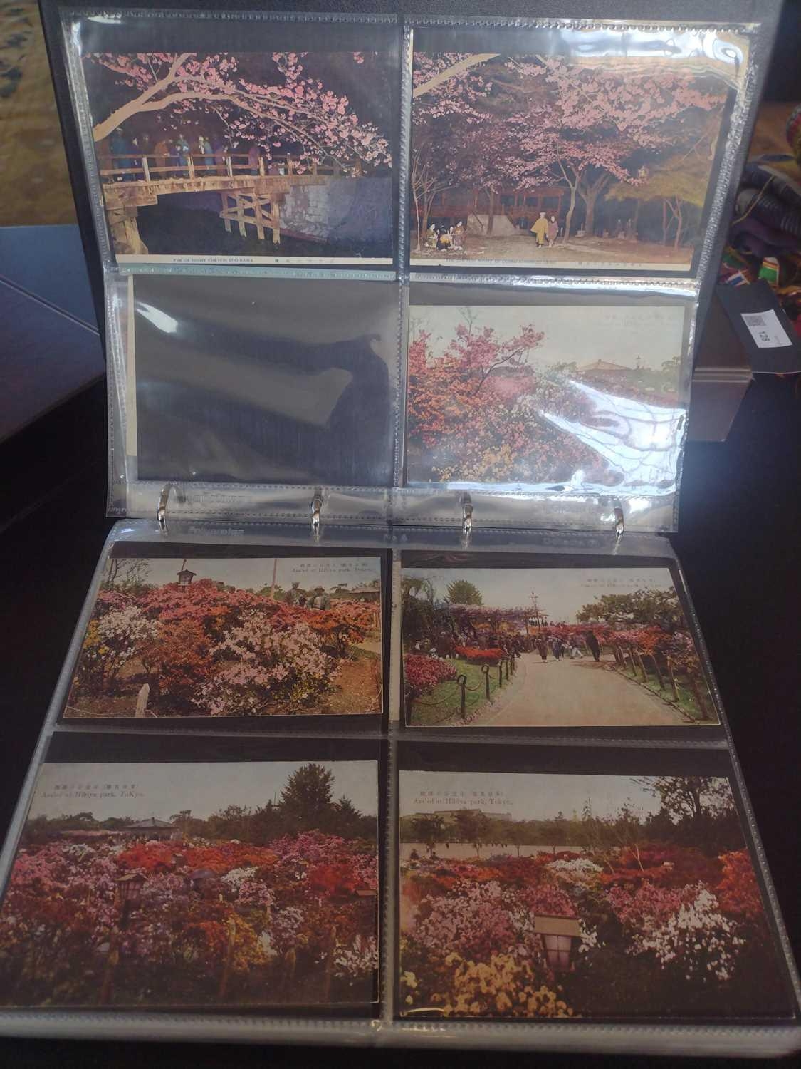 A collection of Japanese postcards, early 20th century. Two hundred and sixty seven Japanese postcards, mostly coloured, including scenes from Tokyo, Kobe, Kyoto, Nikko and Kamakura, etc, in a brown leather contemporary album. (267)