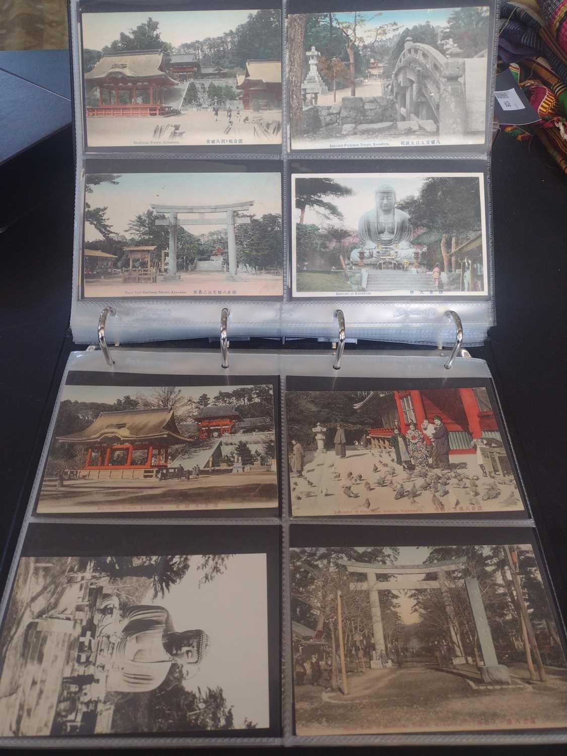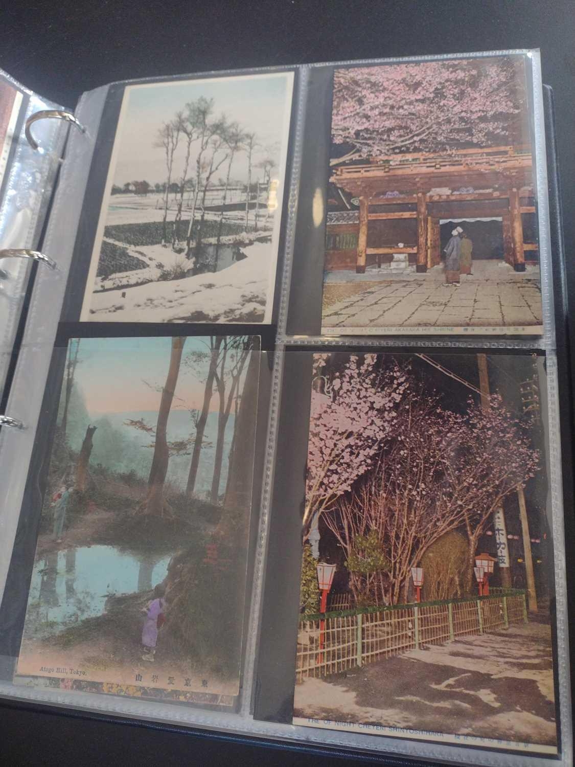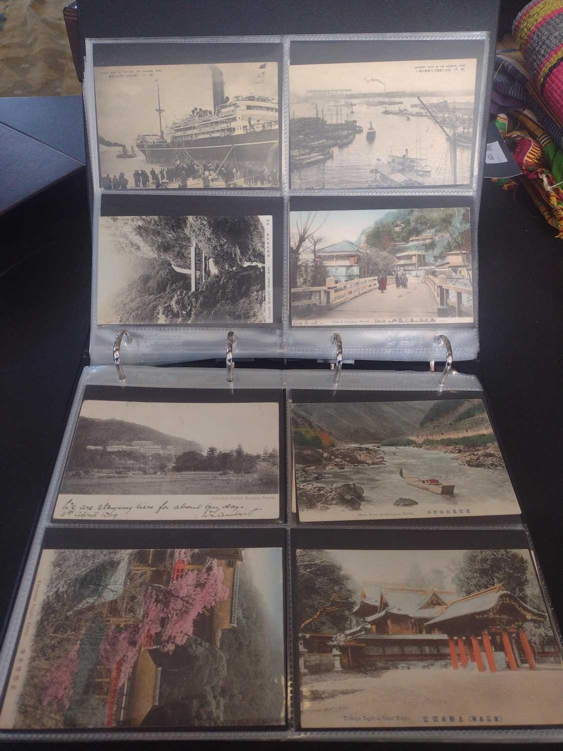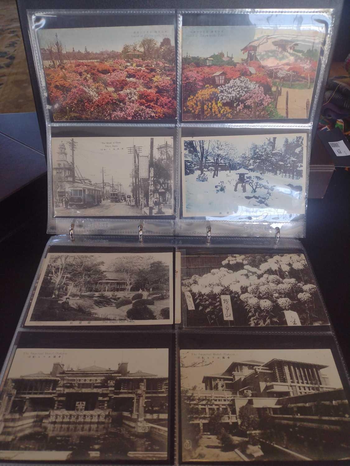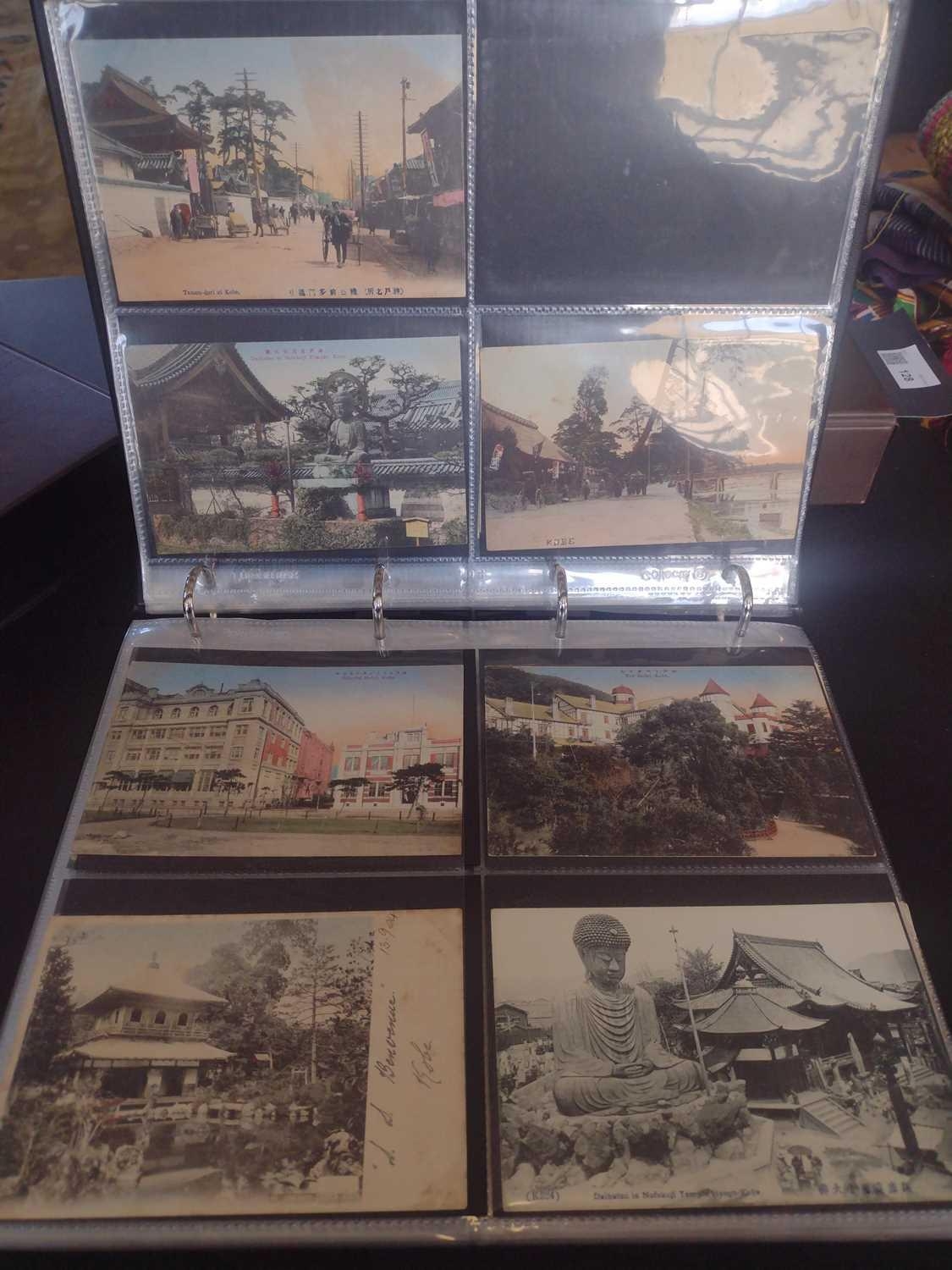 A collection of Japanese postcards, early 20th century. Two hundred and sixty seven Japanese postcards, mostly coloured, including scenes from Tokyo, Kobe, Kyoto, Nikko and Kamakura, etc, in a brown leather contemporary album. (267)