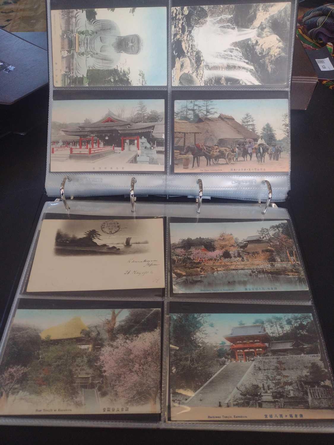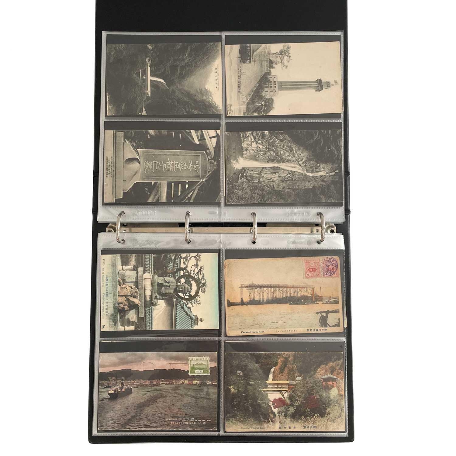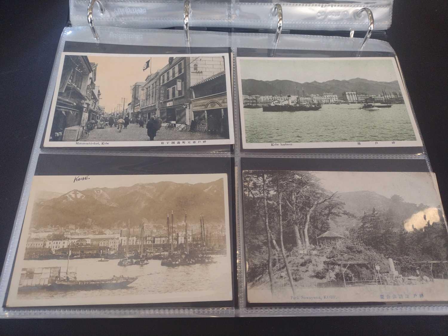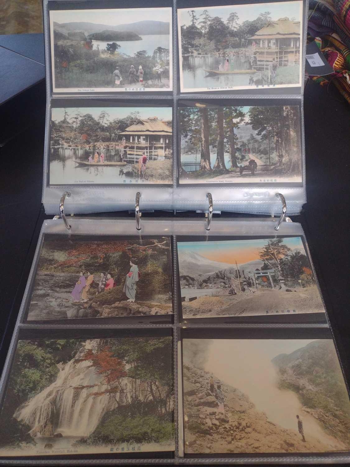 A collection of Japanese postcards, early 20th century. Two hundred and sixty seven Japanese postcards, mostly coloured, including scenes from Tokyo, Kobe, Kyoto, Nikko and Kamakura, etc, in a brown leather contemporary album. (267)