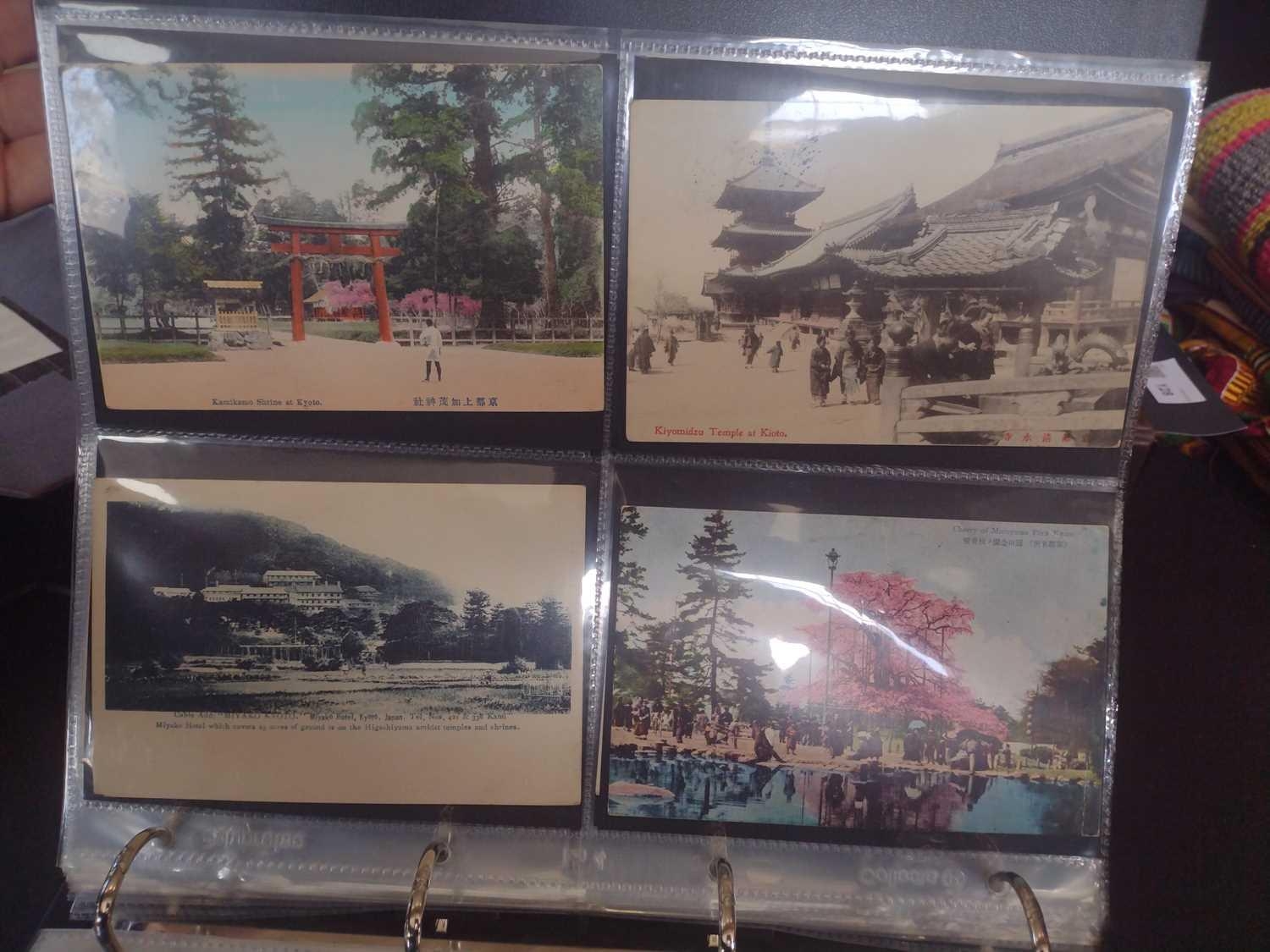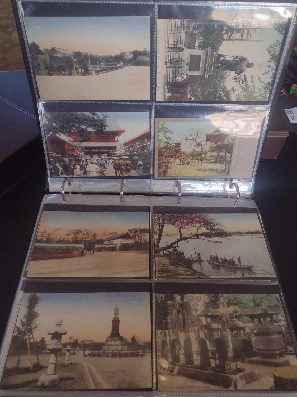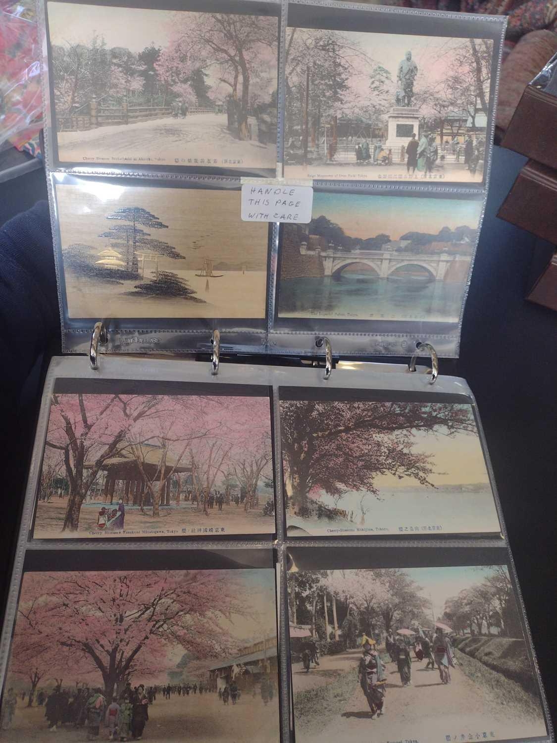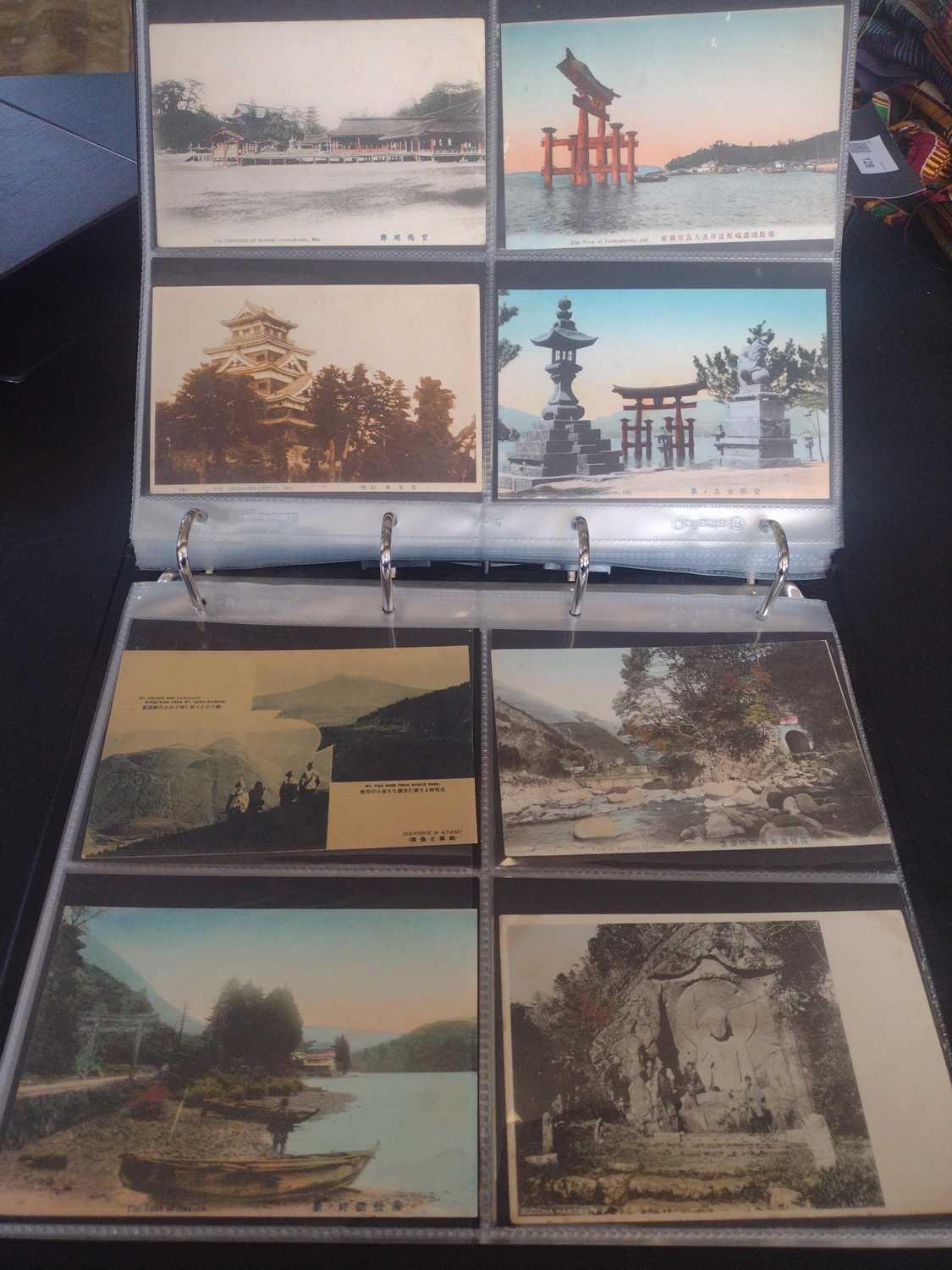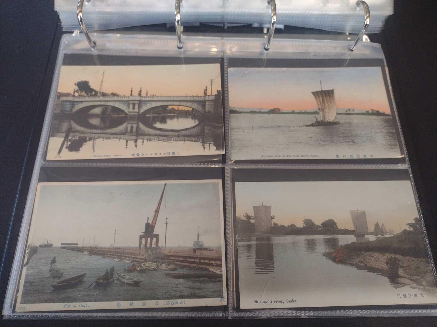 A collection of Japanese postcards, early 20th century. Two hundred and sixty seven Japanese postcards, mostly coloured, including scenes from Tokyo, Kobe, Kyoto, Nikko and Kamakura, etc, in a brown leather contemporary album. (267)