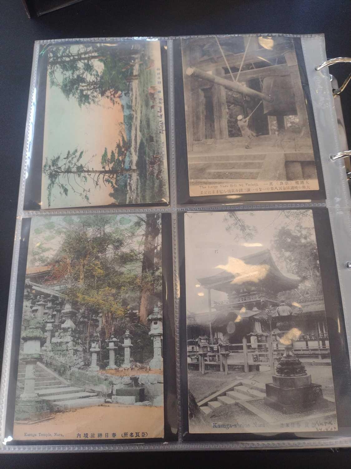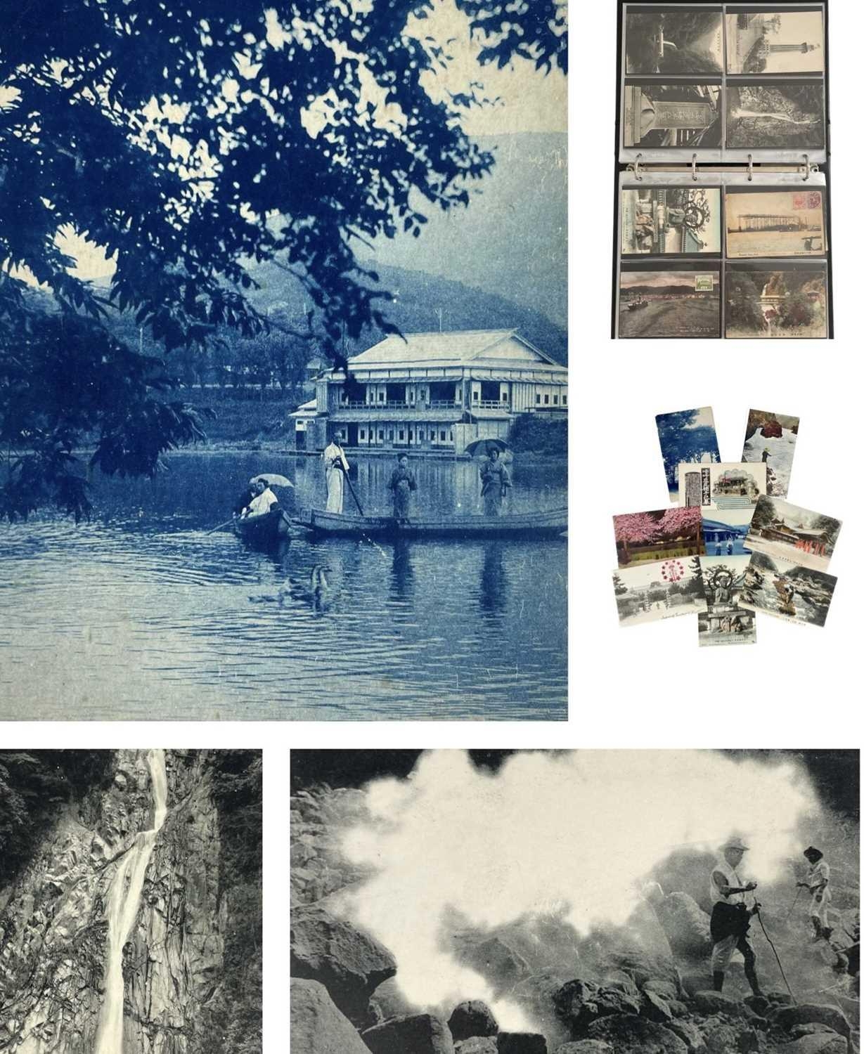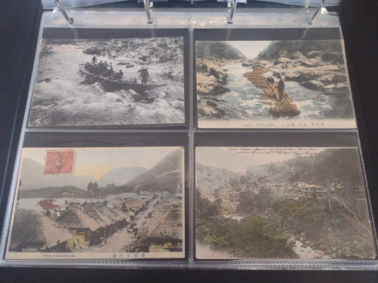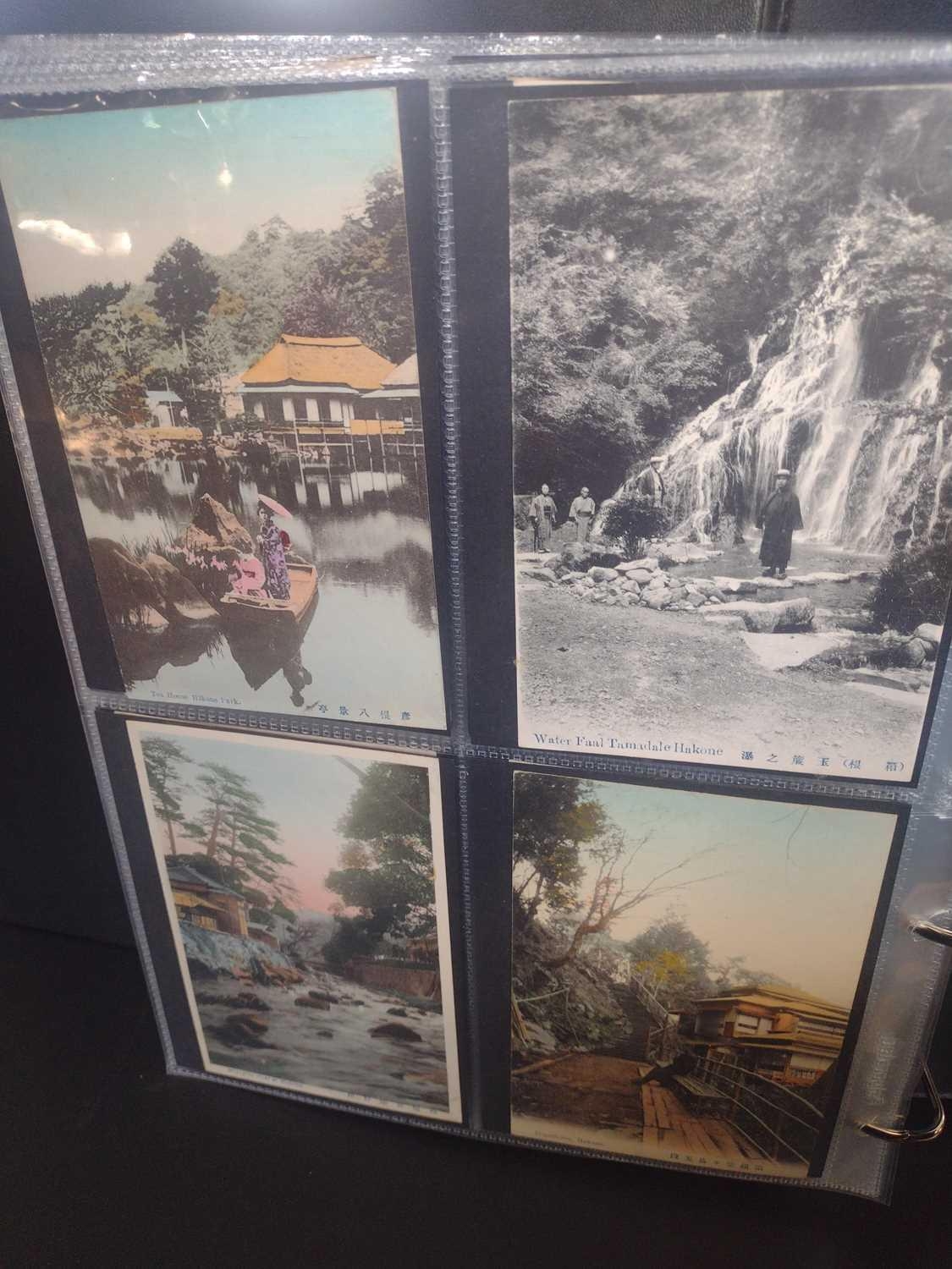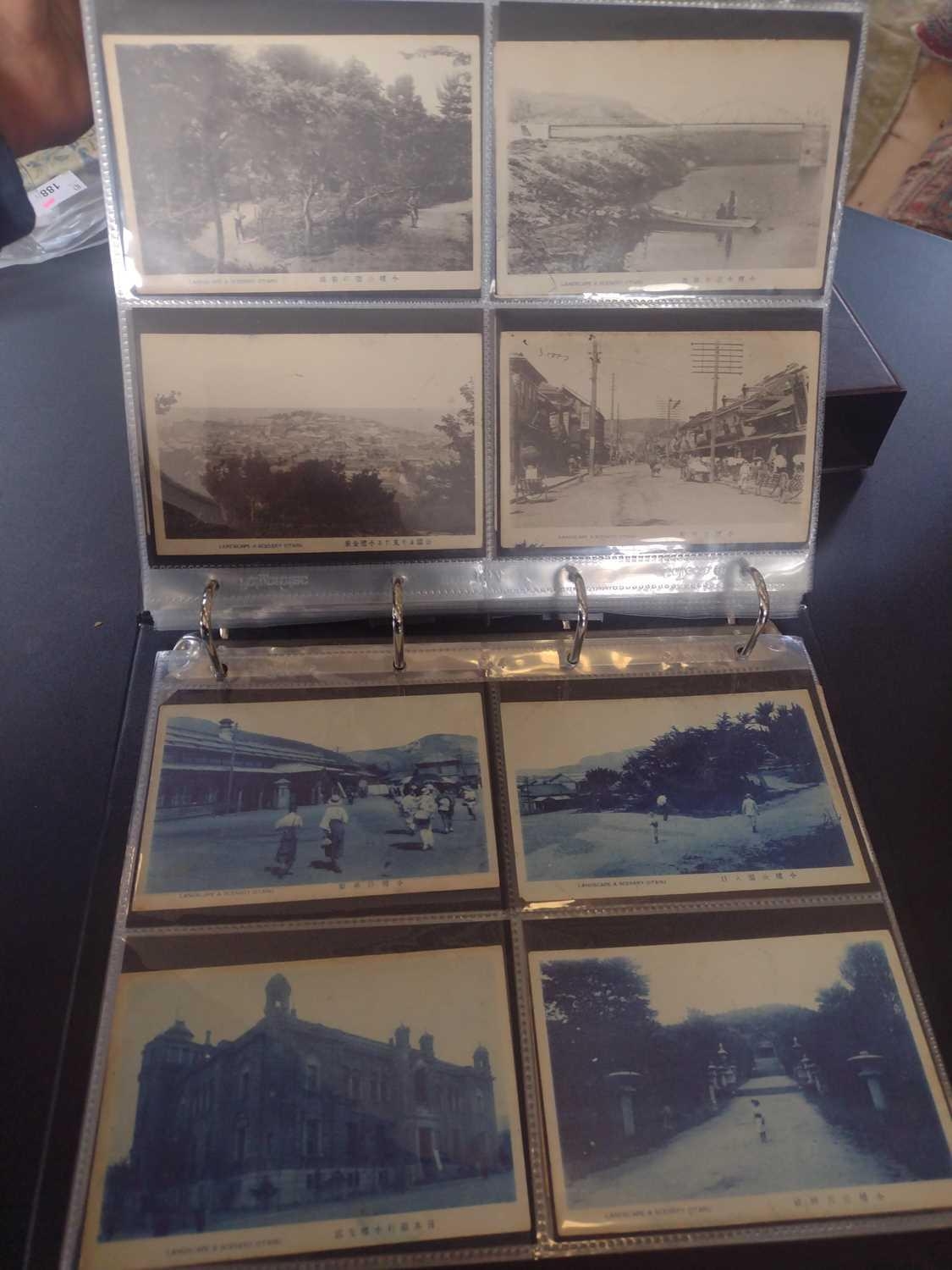 A collection of Japanese postcards, early 20th century. Two hundred and sixty seven Japanese postcards, mostly coloured, including scenes from Tokyo, Kobe, Kyoto, Nikko and Kamakura, etc, in a brown leather contemporary album. (267)