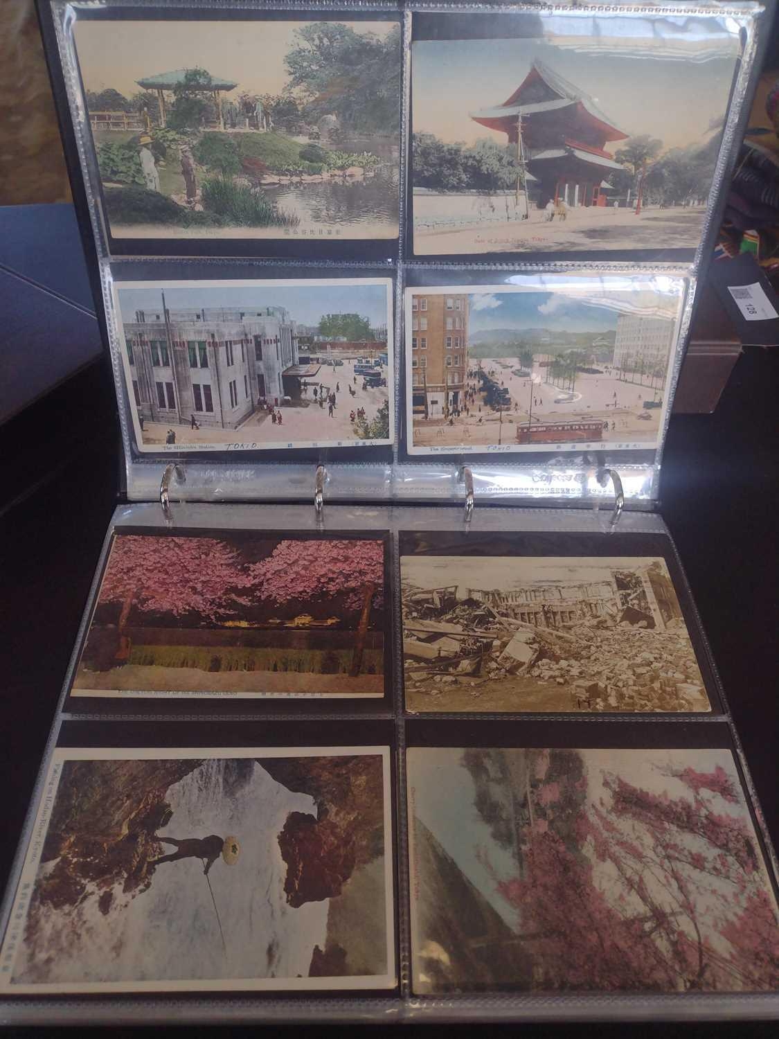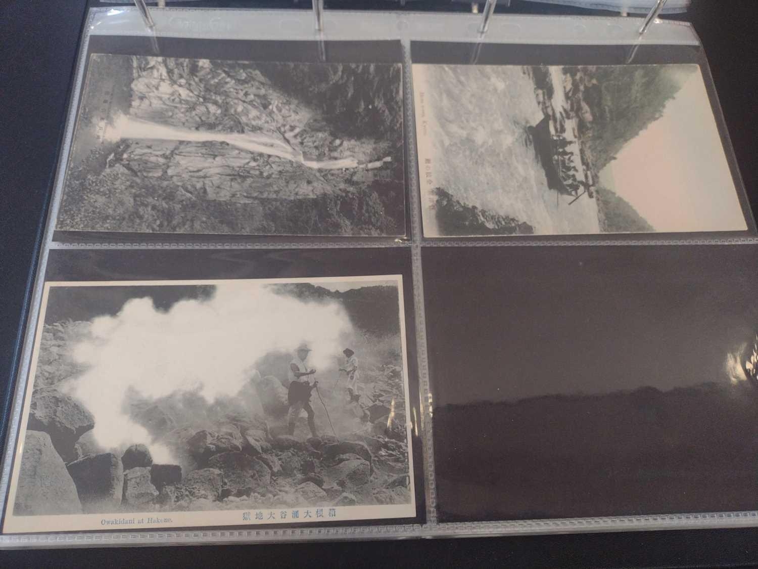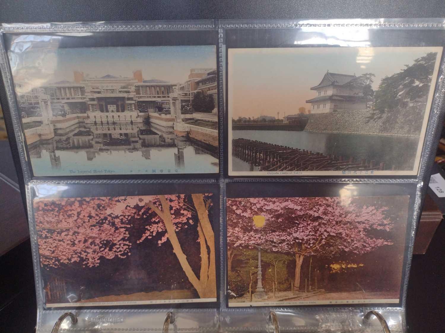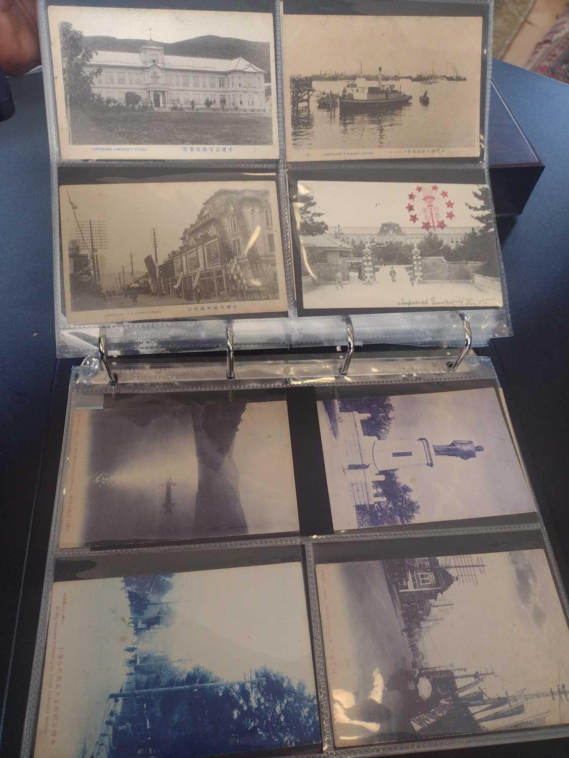 A collection of Japanese postcards, early 20th century. Two hundred and sixty seven Japanese postcards, mostly coloured, including scenes from Tokyo, Kobe, Kyoto, Nikko and Kamakura, etc, in a brown leather contemporary album. (267)