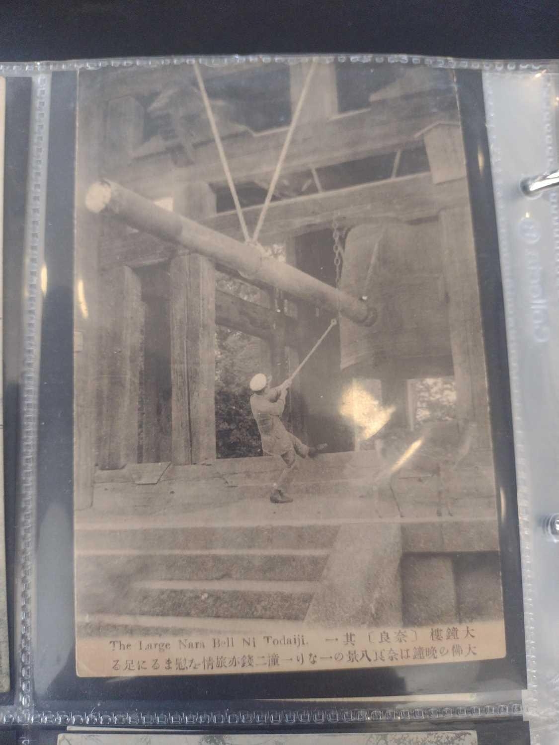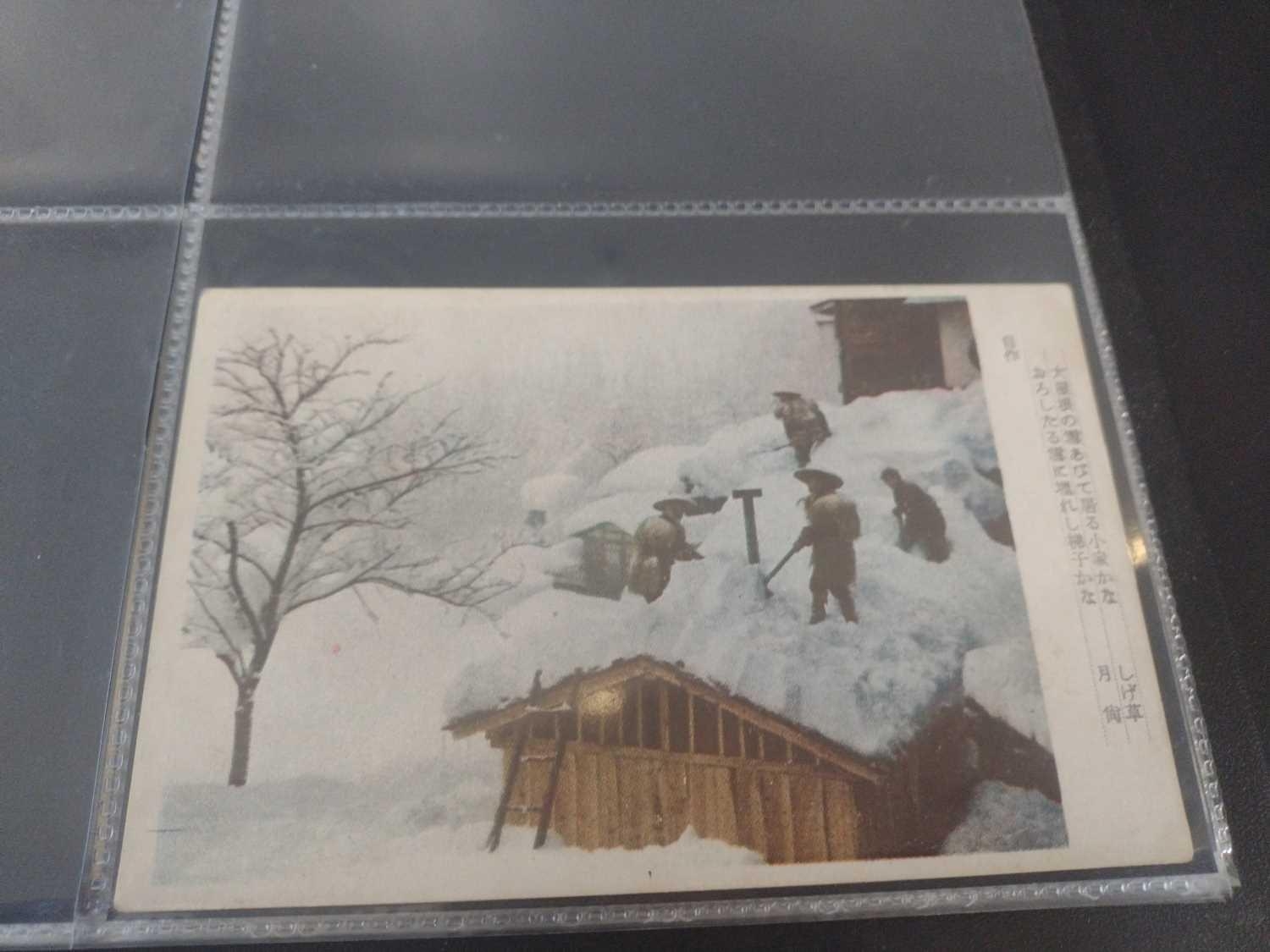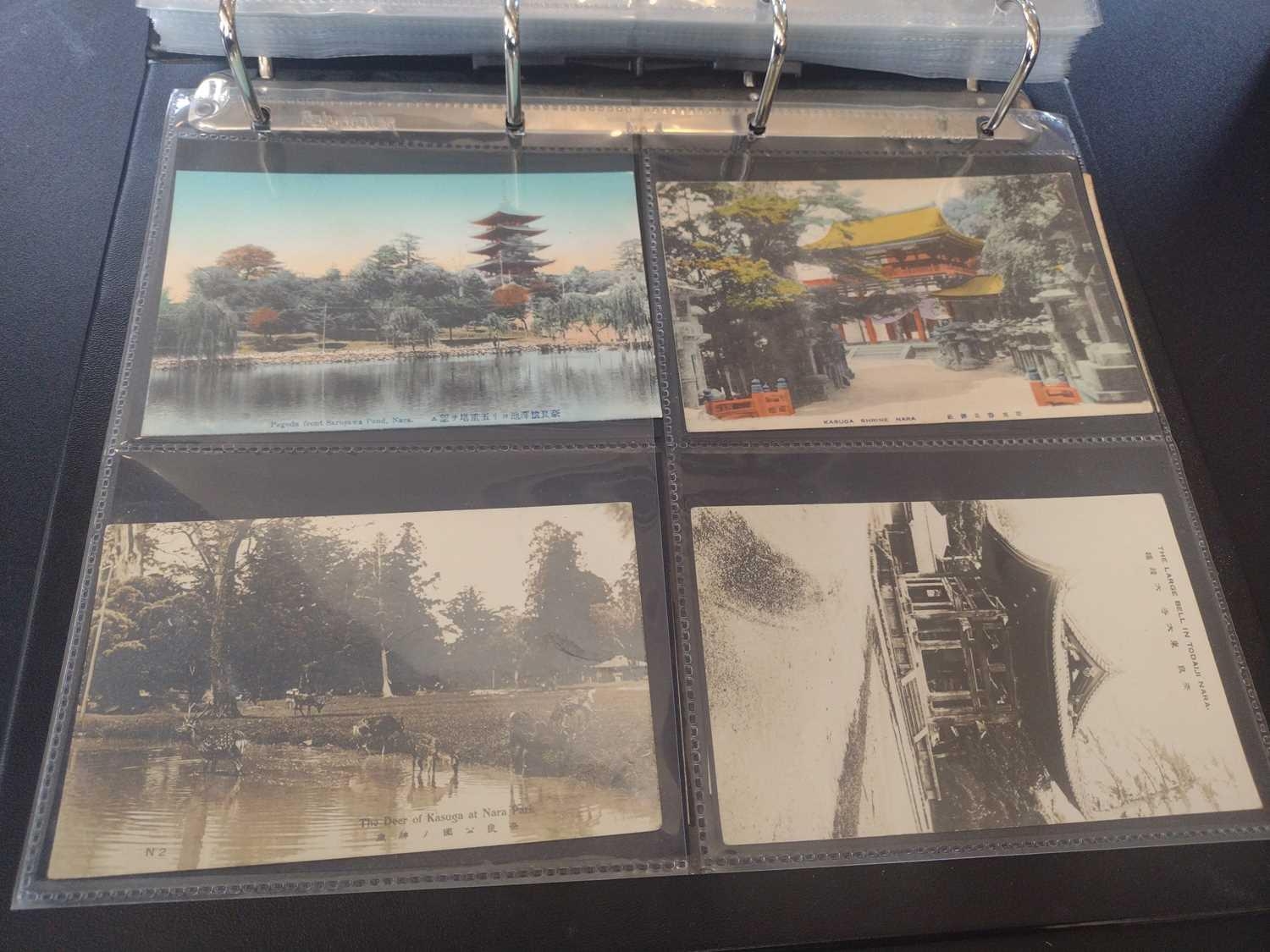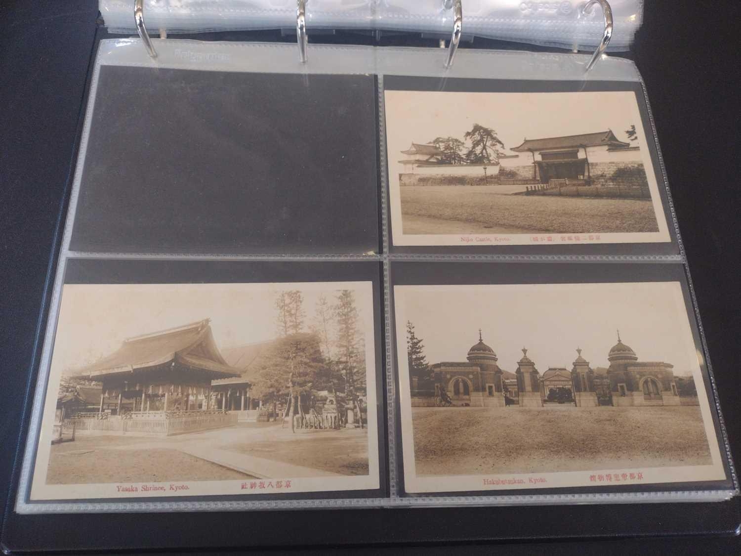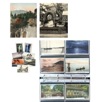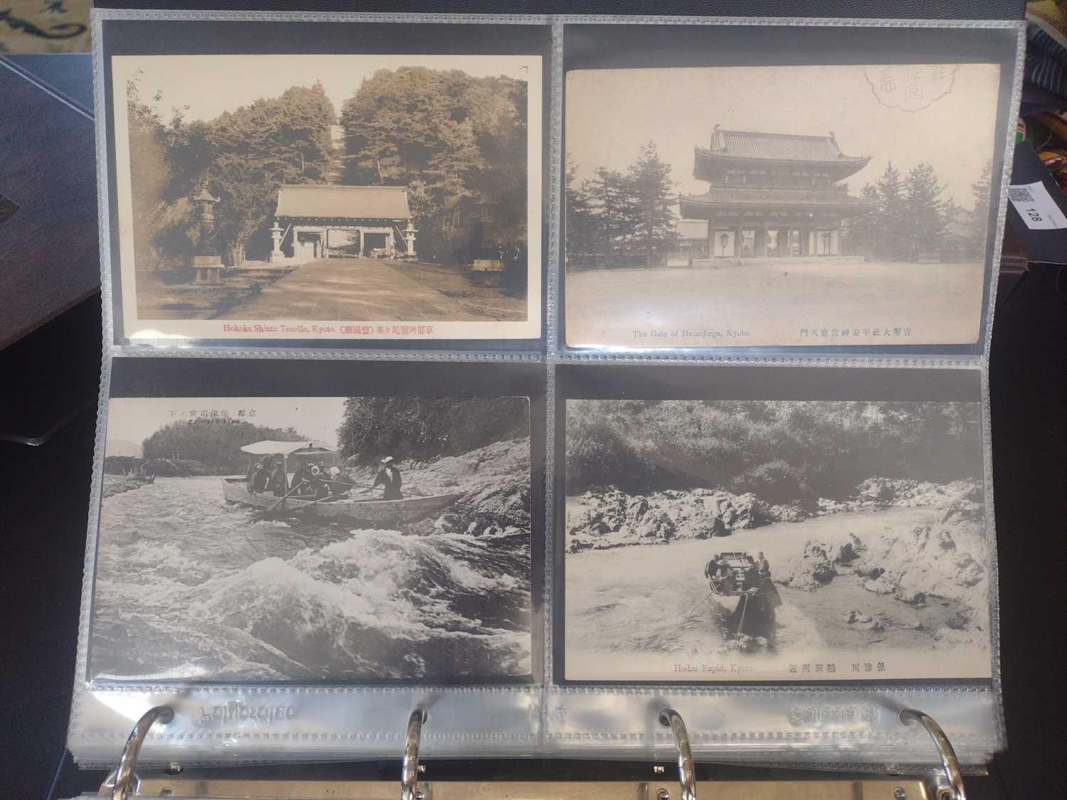 A collection of Japanese postcards, early 20th century. Two hundred and sixty seven Japanese postcards, mostly coloured, including scenes from Tokyo, Kobe, Kyoto, Nikko and Kamakura, etc, in a brown leather contemporary album. (267)
