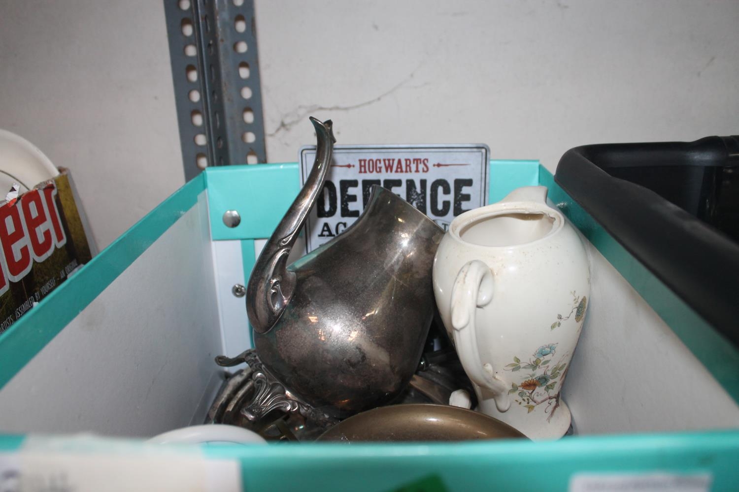 BOX OF DECORATIVE CHINA AND A HOGWARTS NOTICE