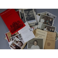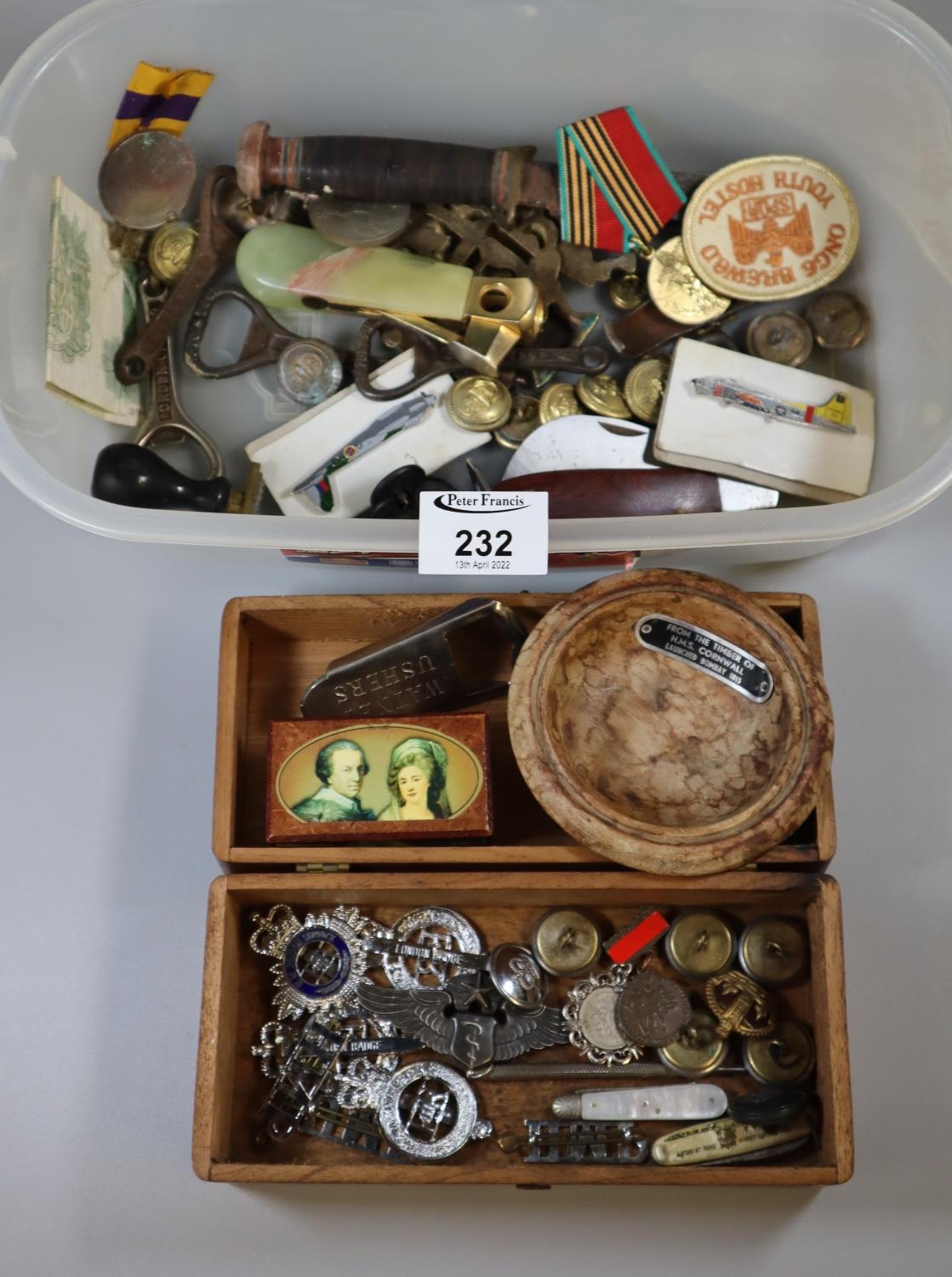 Plastic tub of assorted WWII medals, military buttons, HM prison cap badges, HMS Cornwall, timber pin or coin dish, etc.