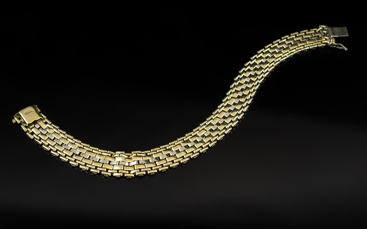 18ct Two Tone Gold - Attractive and Superb Quality Basket Weave Design Bracelet with Full Hallmarks for 750 - 18ct to Clasp. This Bracelet Is Top of Range In Quality and Design, Smooth and Tactile. Length 8 Inches - 20 cms. 36.5 grams. Wonderful Condition.